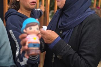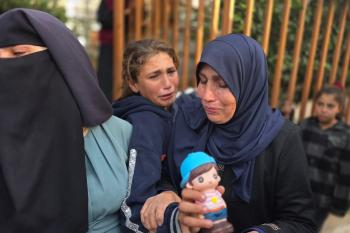 صلت أربع جثث، من بينها جثتا طفلين، إلى مستشفى ناصر في خان يونس بعد أن استهدفت طائرات حربية إسرائيلية خيمة تؤوي نازحين شمال خان يونس في جنوب قطاع غزة. 8 يناير/كانون الثاني 2026. (صورة: طارق محمد)