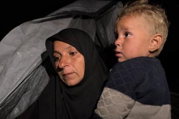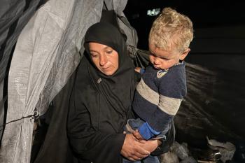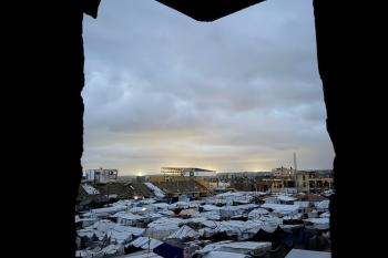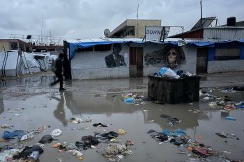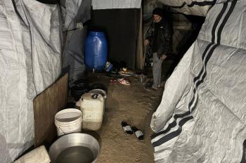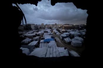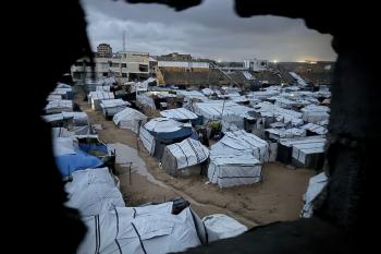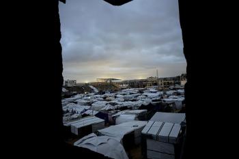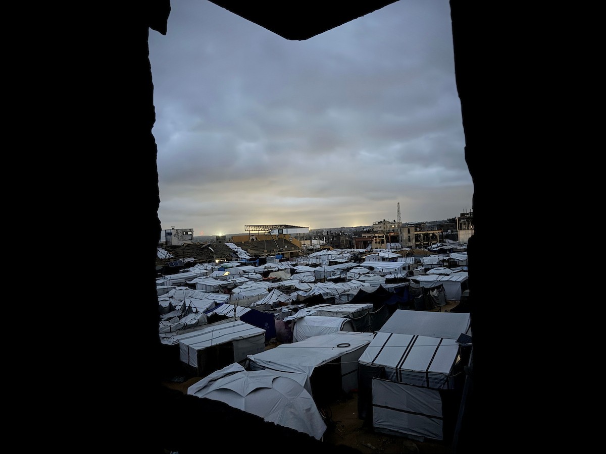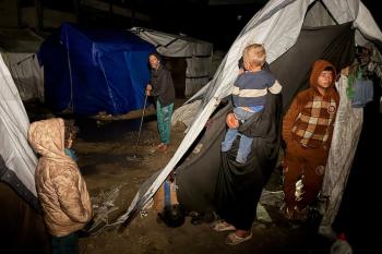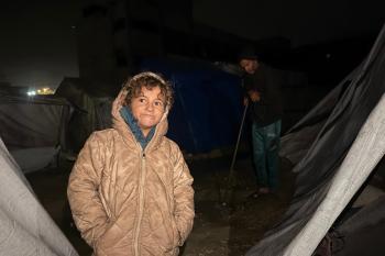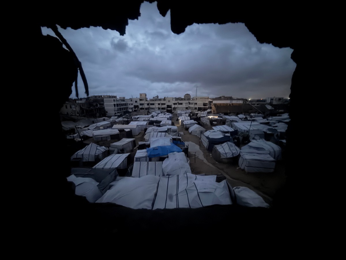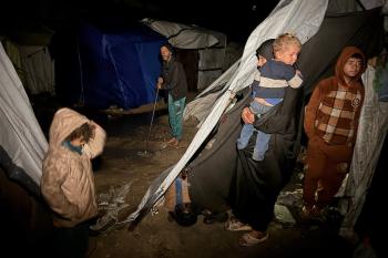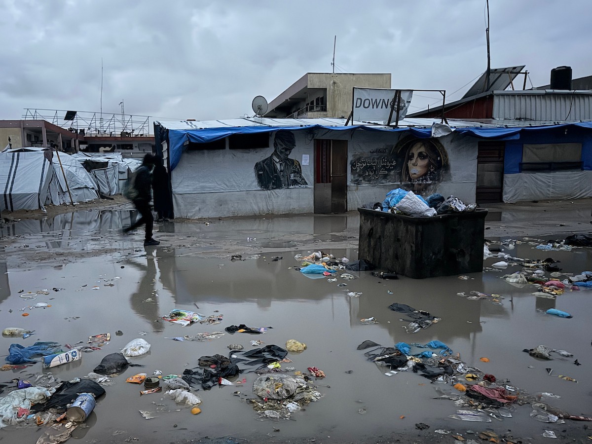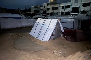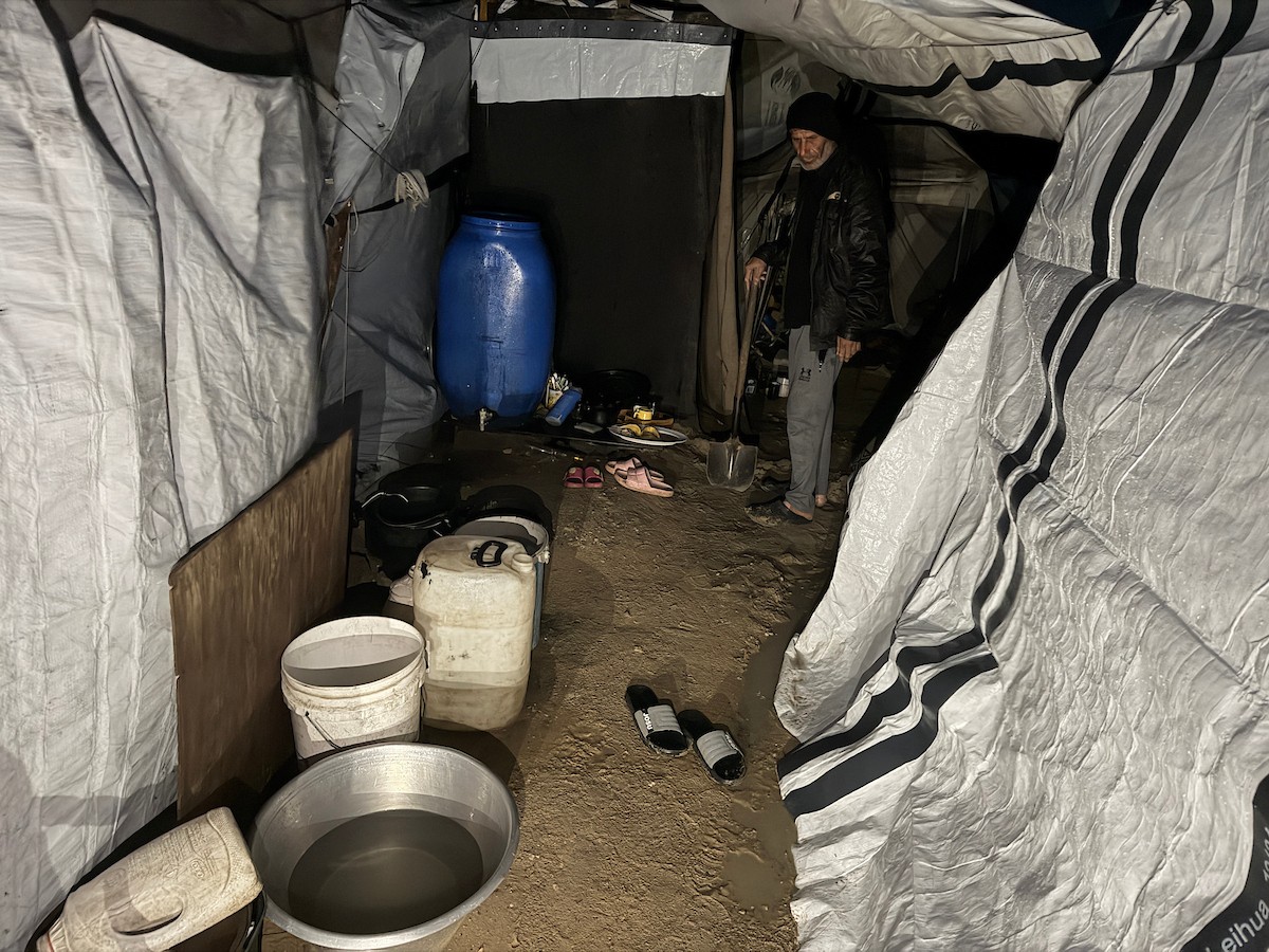 يُكافح الفلسطينيون النازحون، الذين يعيشون في خيام مؤقتة، من أجل البقاء في ظل ظروف قاسية ومعاناة متفاقمة، حيث اقتلعت الأمطار الغزيرة والعواصف العديد من خيامهم وأغرقتها في مدينة خان يونس جنوب قطاع غزة. 9 يناير/كانون الثاني 2026. صورة: محمد سلامة