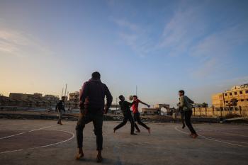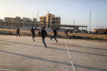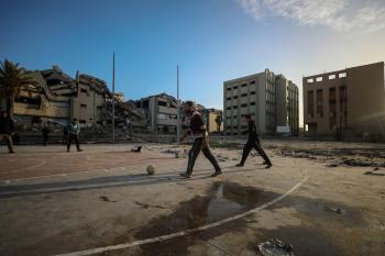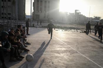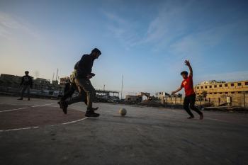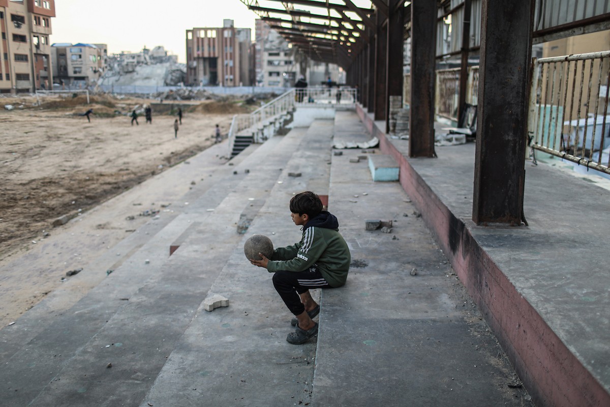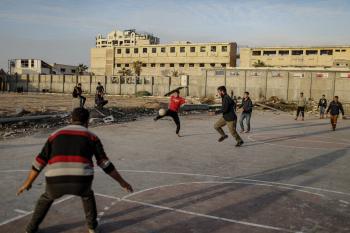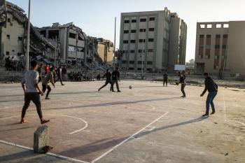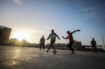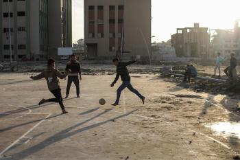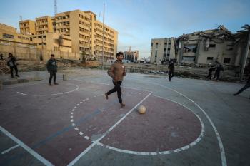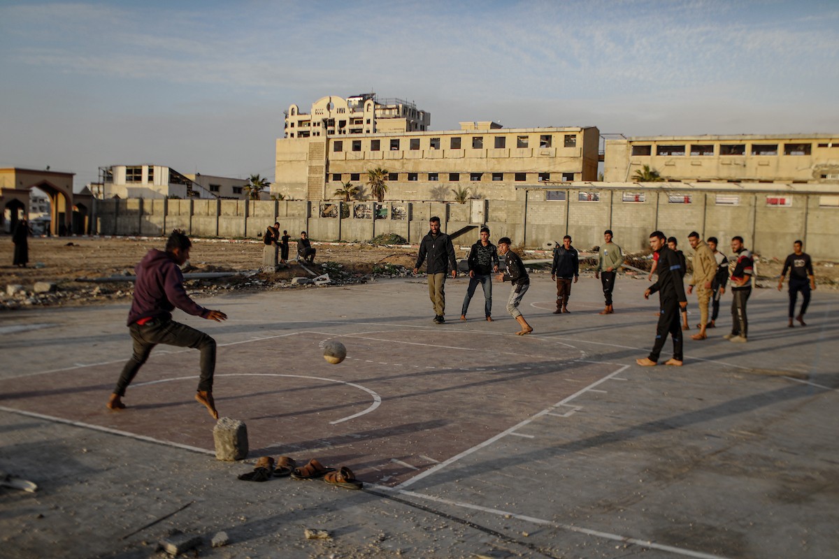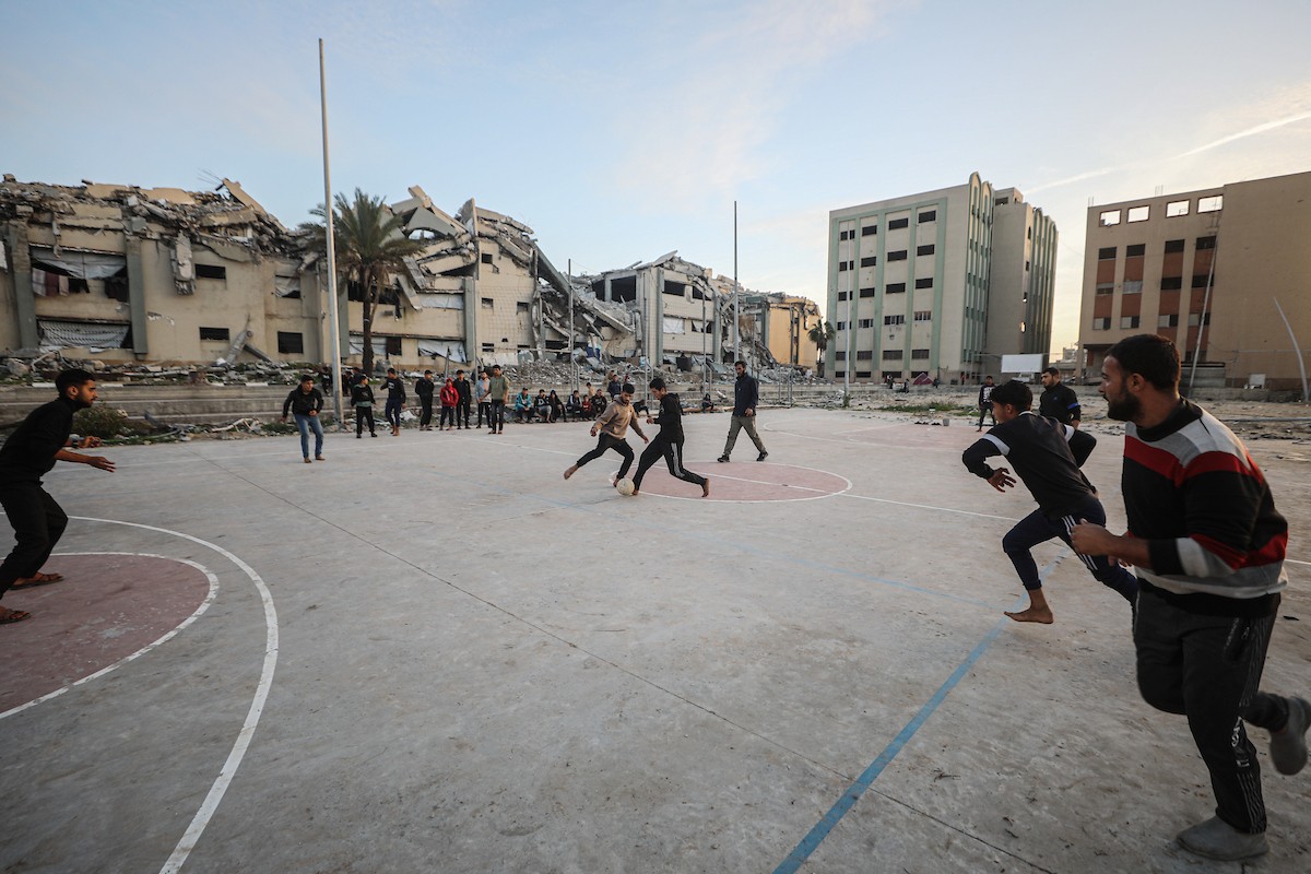 يلعب شبان فلسطينيون نازحون كرة القدم على ملعب مدمر داخل الجامعة الإسلامية المنكوبة في وسط مدينة غزة، في 10 يناير/كانون الثاني 2026، في محاولة للعثور على لحظات من الحياة الطبيعية وسط الدمار والصراع المستمر في القطاع. صورة: عمر أشتوي