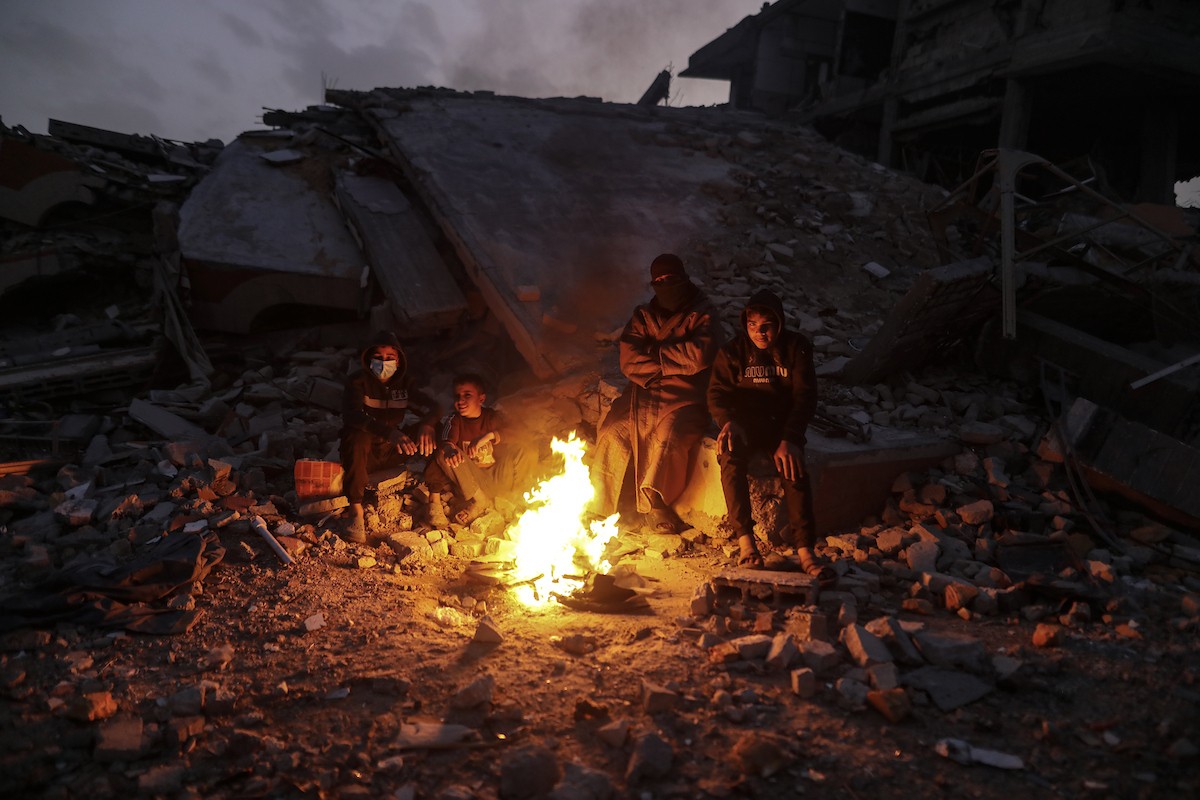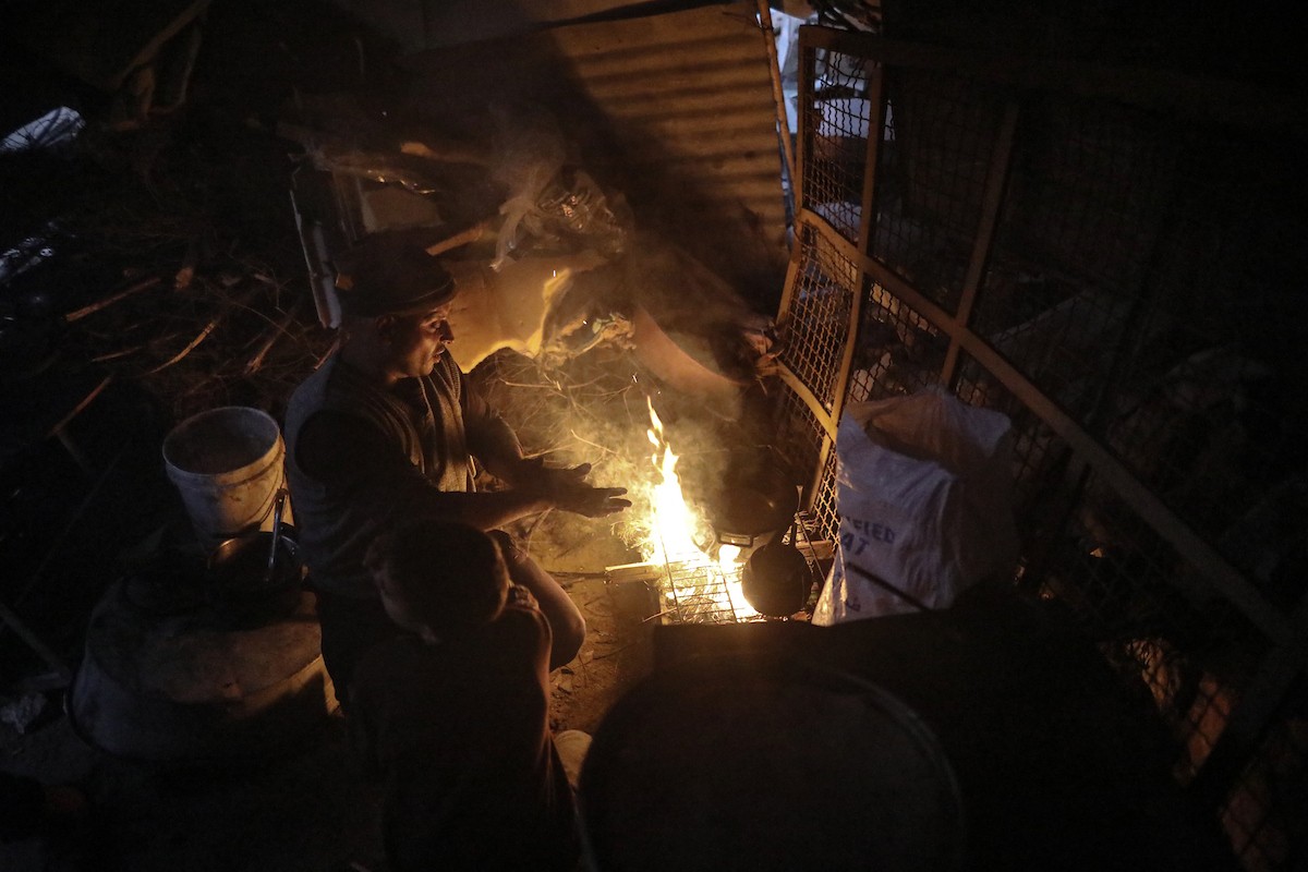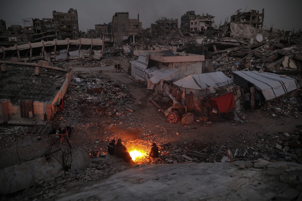 عائلات تعيش في خيام مؤقتة وسط الأنقاض تشعل نيرانًا للتدفئة في جباليا، شمال قطاع غزة، في 12 يناير/كانون الثاني 2026. ويكافح الفلسطينيون الذين دُمرت منازلهم في هجمات إسرائيلية من أجل البقاء في ظل ظروف شتوية قاسية وبرد قارس. صورة: عمر أشتوي