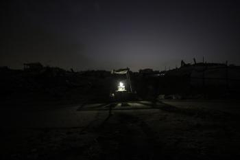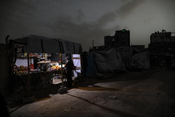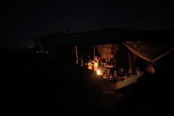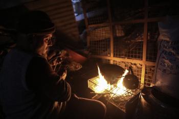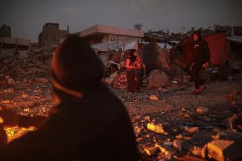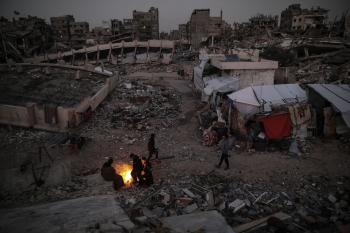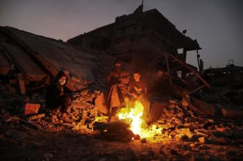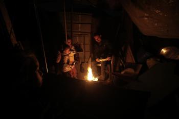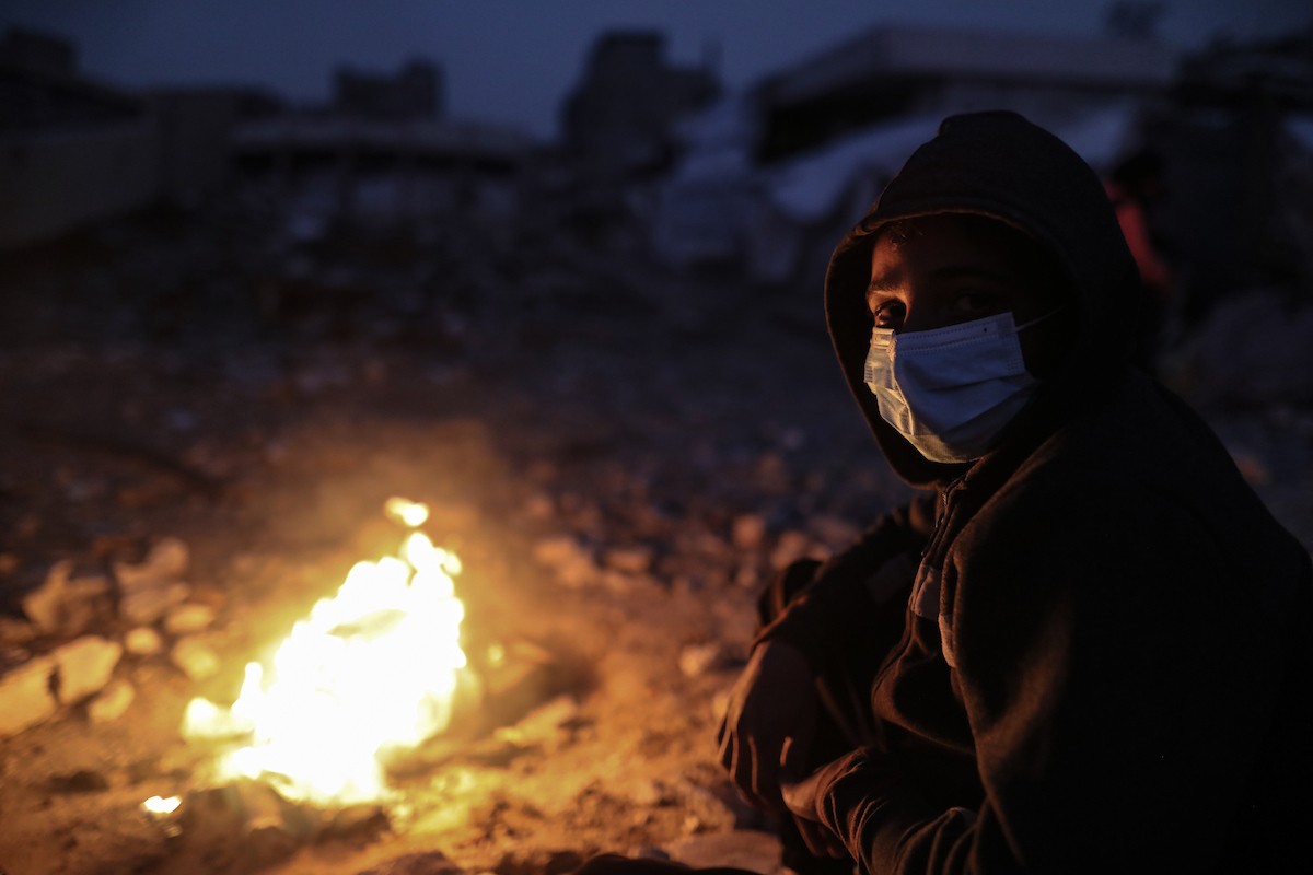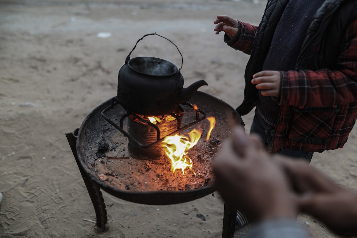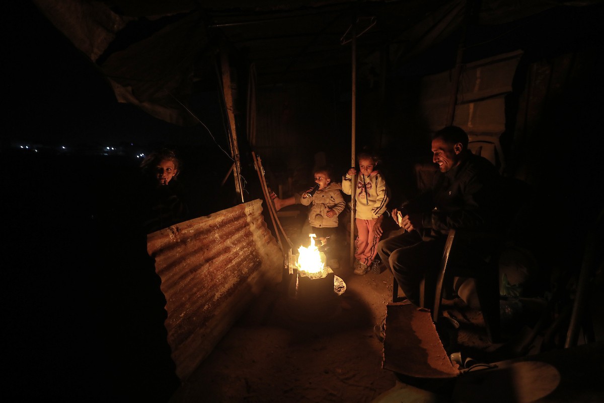 عائلات تعيش في خيام مؤقتة وسط الأنقاض تشعل نيرانًا للتدفئة في جباليا، شمال قطاع غزة، في 12 يناير/كانون الثاني 2026. ويكافح الفلسطينيون الذين دُمرت منازلهم في هجمات إسرائيلية من أجل البقاء في ظل ظروف شتوية قاسية وبرد قارس. صورة: عمر أشتوي
