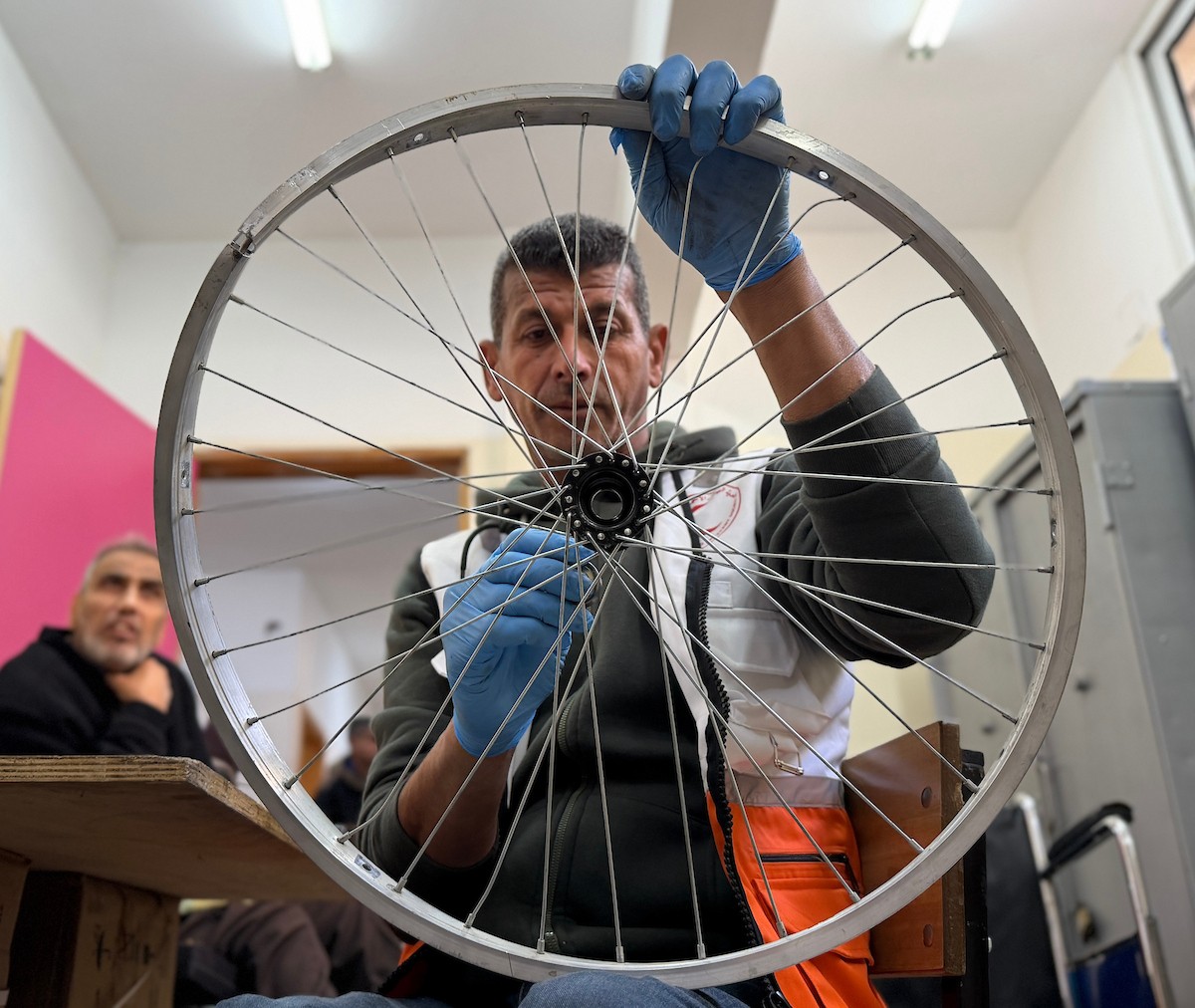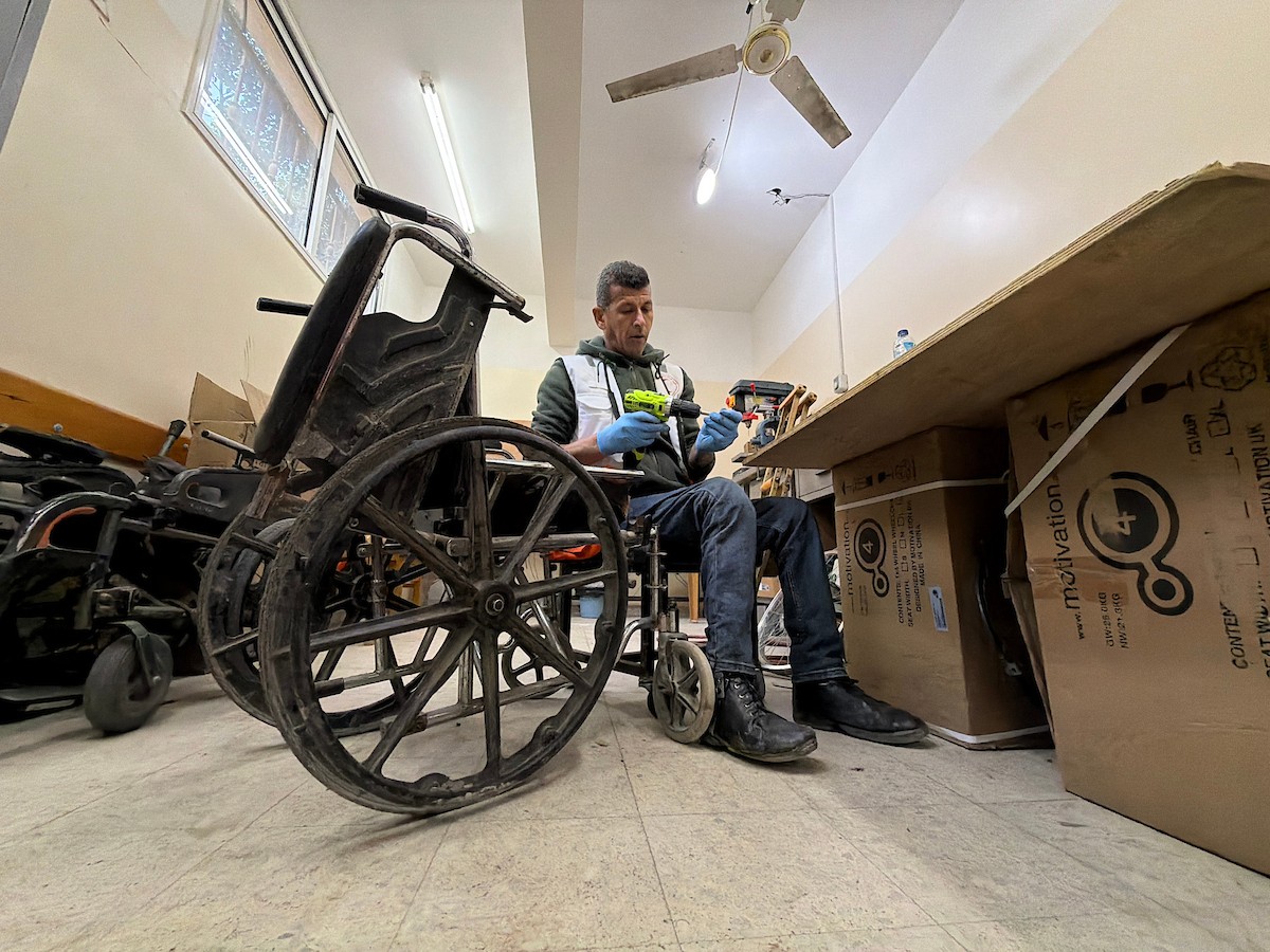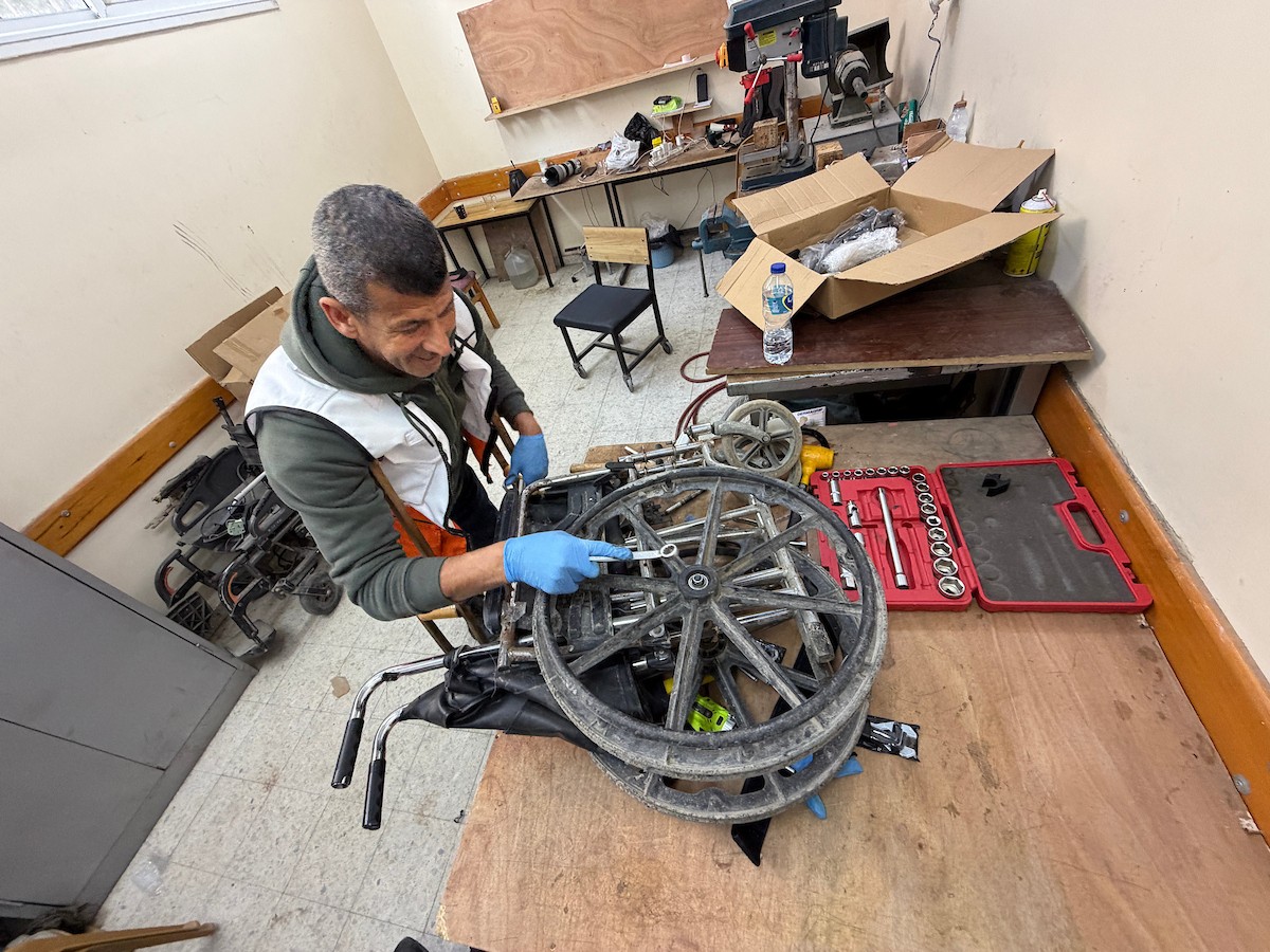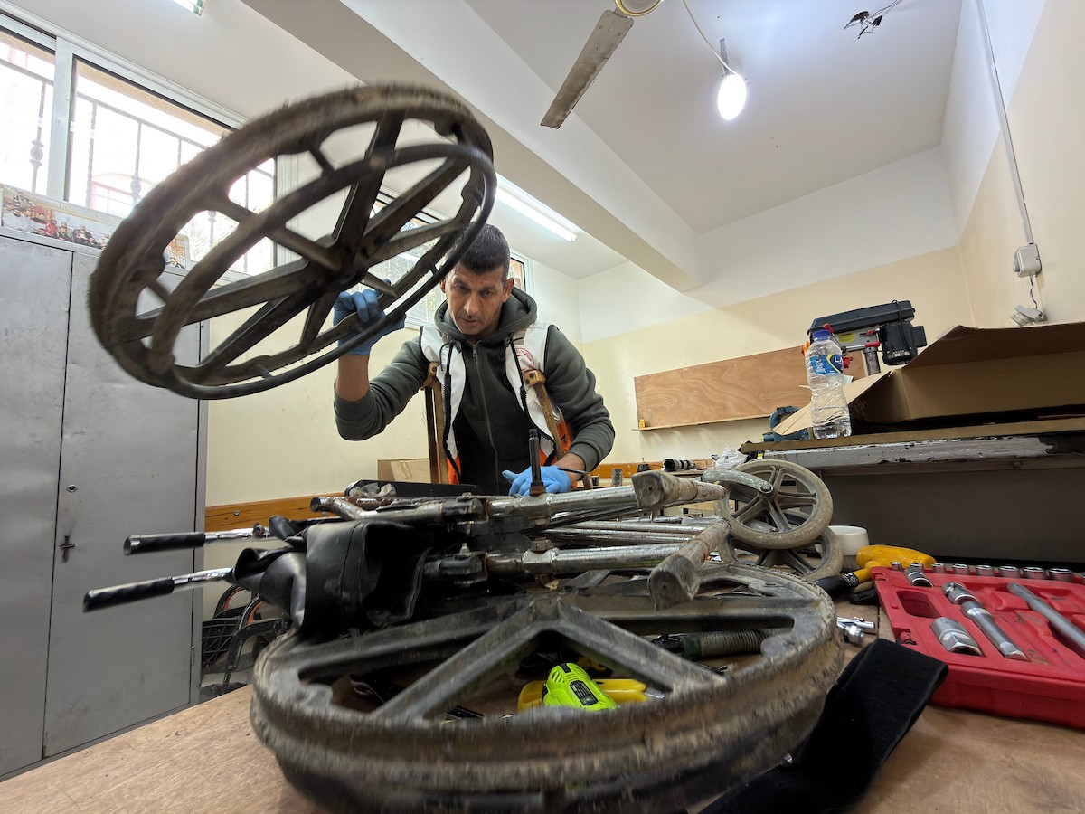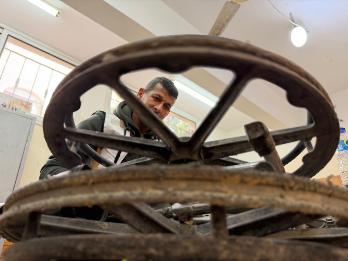 الفلسطيني رمزي الفجم يصلح كراسي متحركة لجرحى قطاع غزة متحديا إعاقته الشخصية ونقص المعدات الطبية ، خان يونس، جنوب قطاع غزة، 20 يناير/كانون الثاني 2026 تصوير: محمد سلامة / وكالة الأنباء الفلسطينية (APA Images)