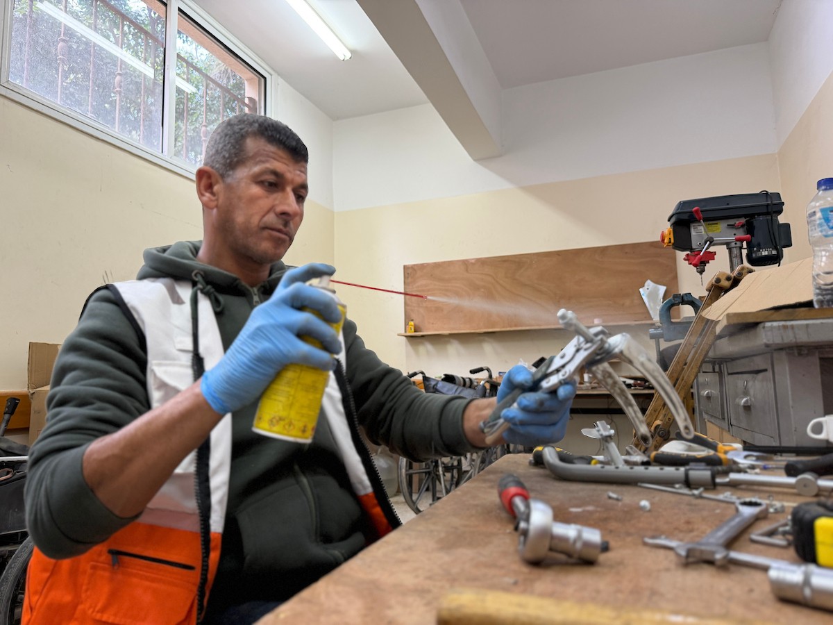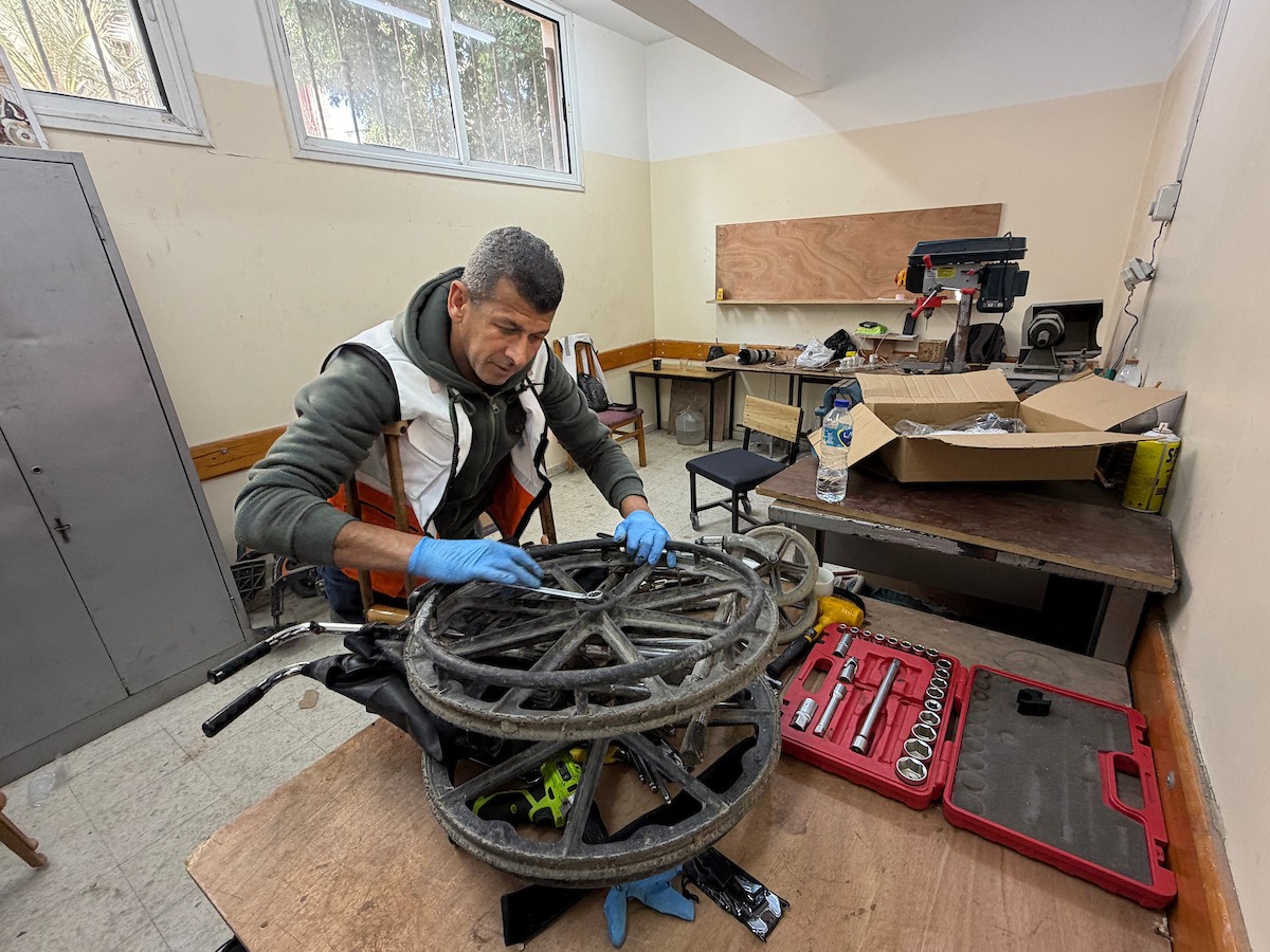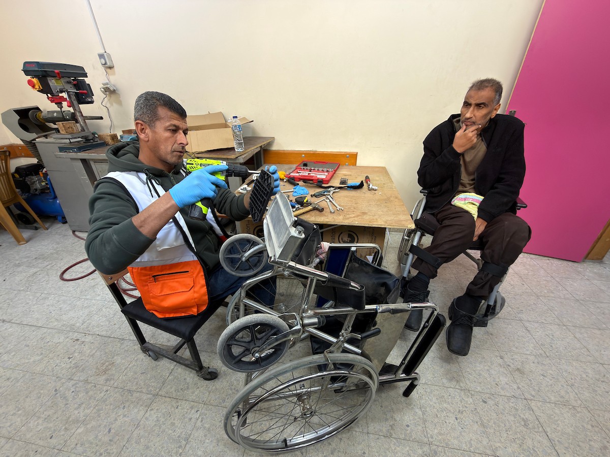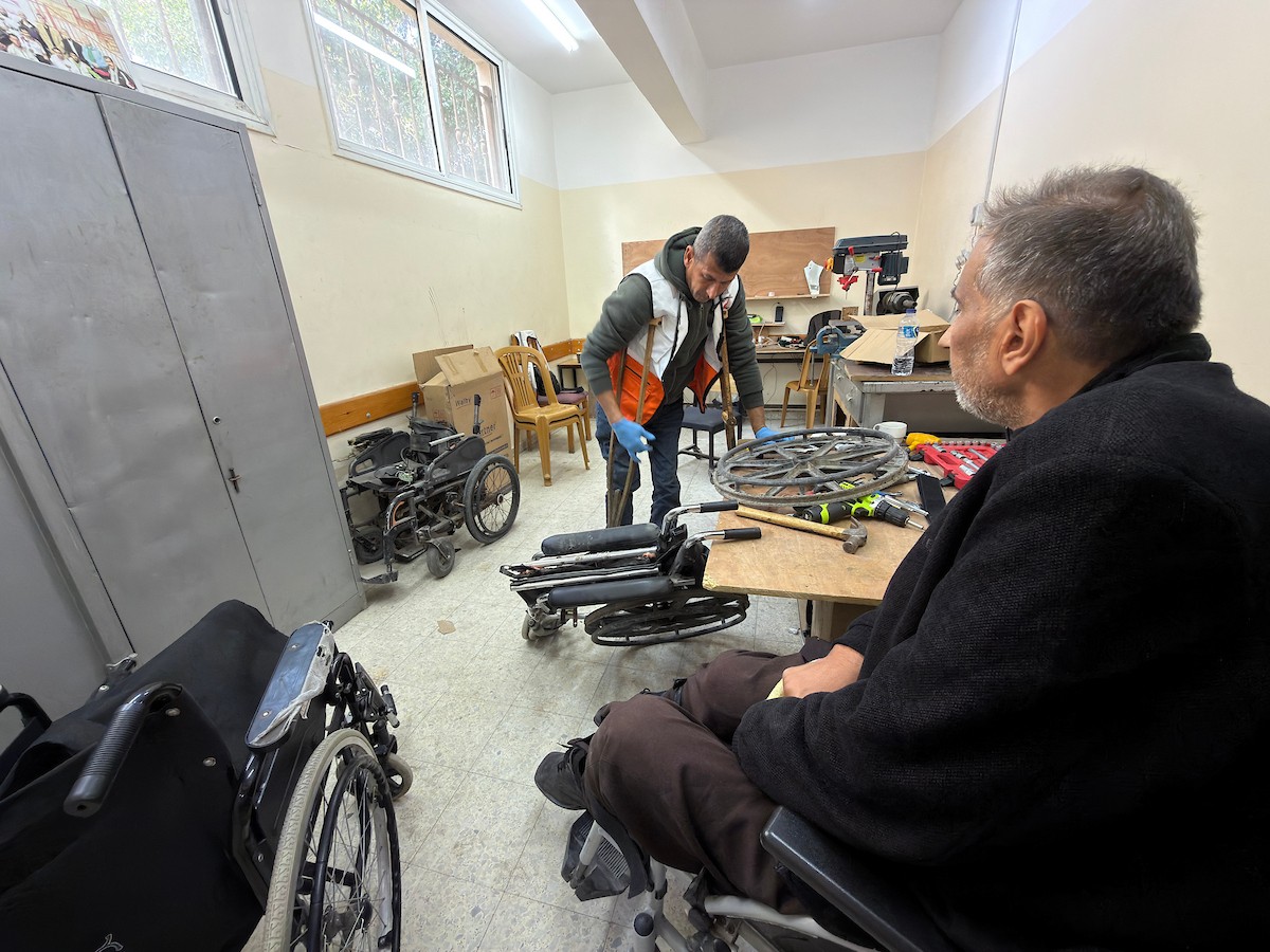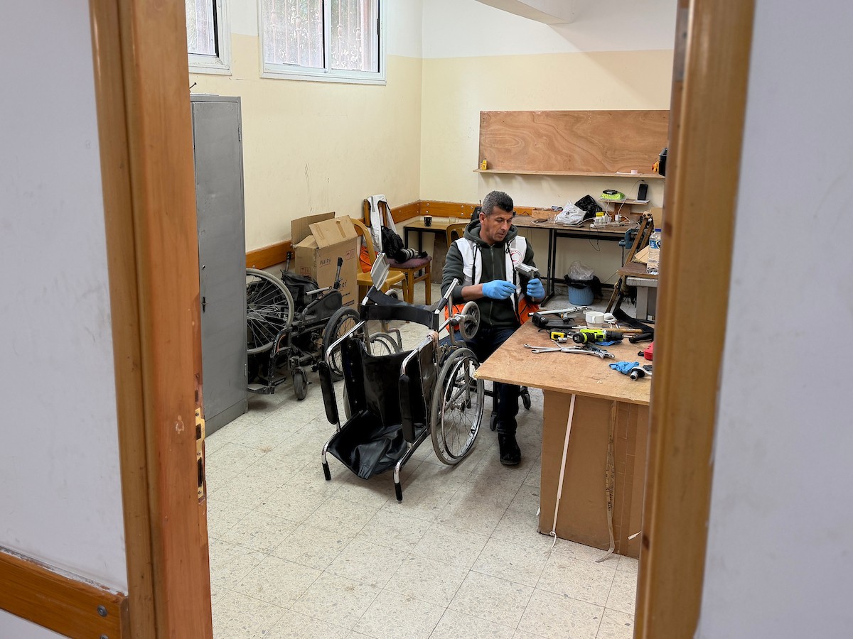 الفلسطيني رمزي الفجم يصلح كراسي متحركة لجرحى قطاع غزة متحديا إعاقته الشخصية ونقص المعدات الطبية ، خان يونس، جنوب قطاع غزة، 20 يناير/كانون الثاني 2026 تصوير: محمد سلامة / وكالة الأنباء الفلسطينية (APA Images)