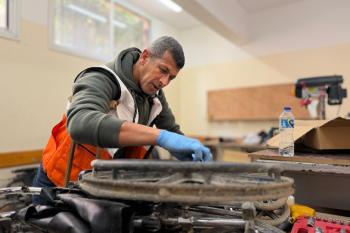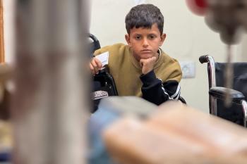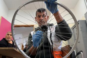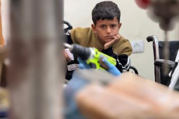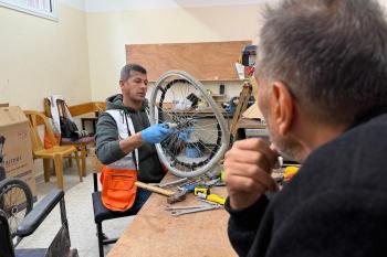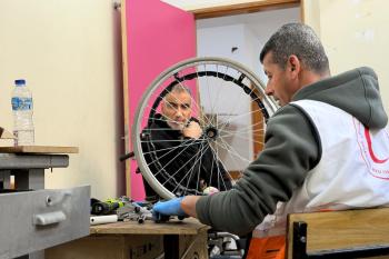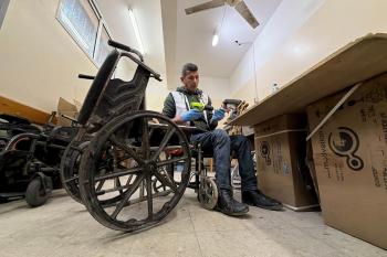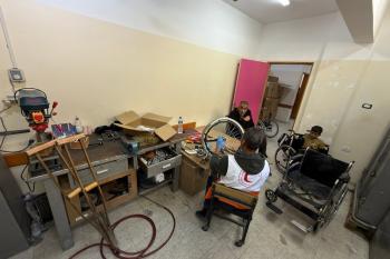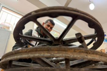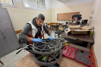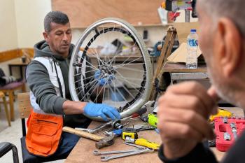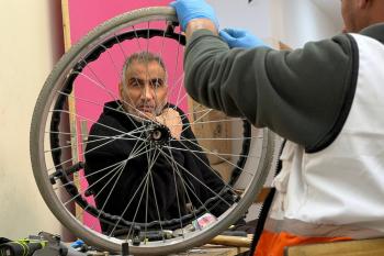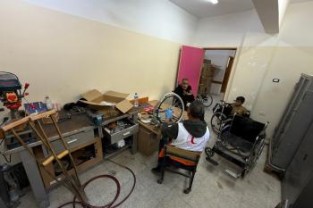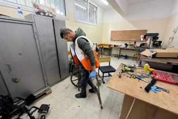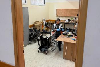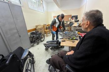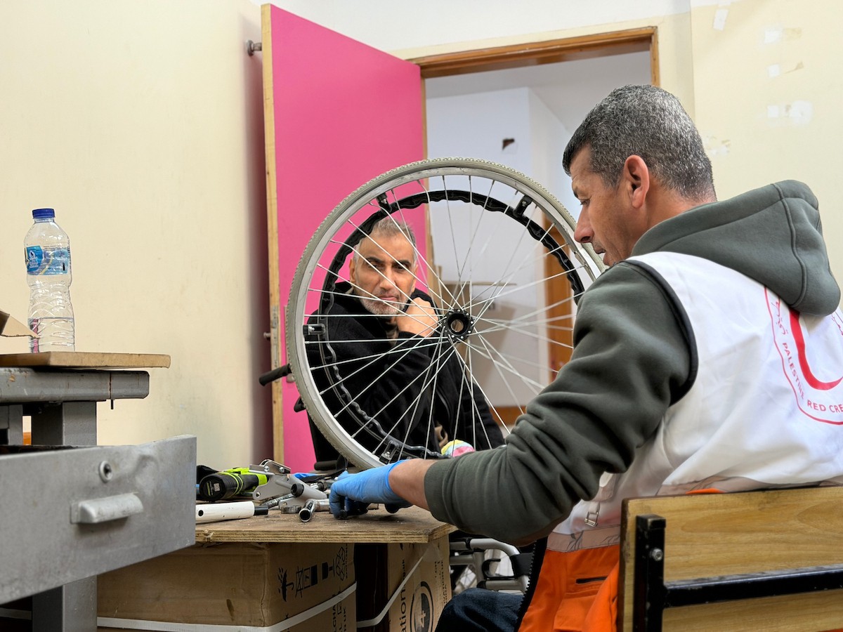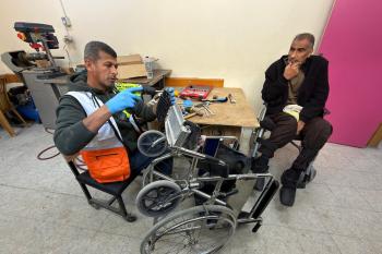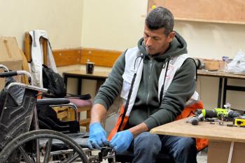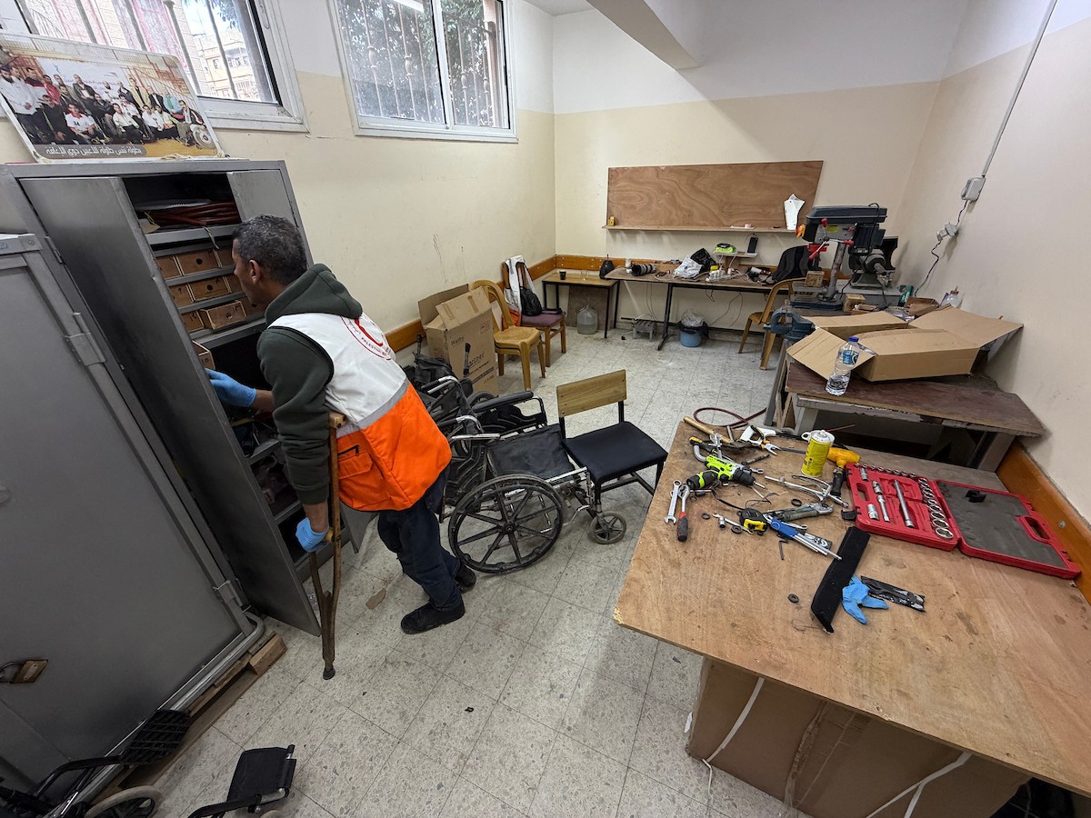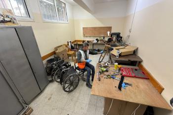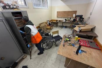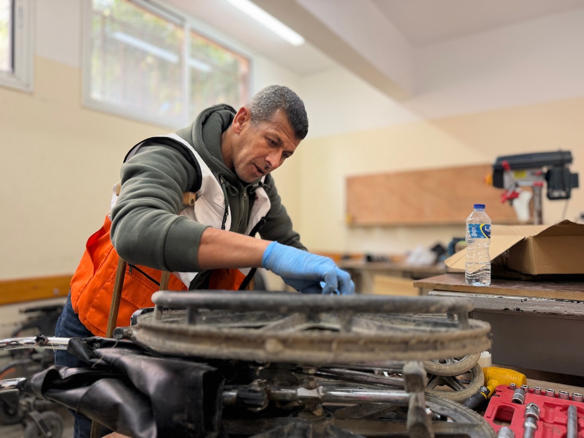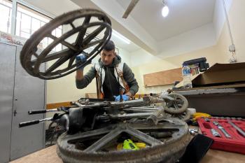الفلسطيني رمزي الفجم يصلح كراسي متحركة لجرحى قطاع غزة متحديا إعاقته الشخصية ونقص المعدات الطبية ، خان يونس، جنوب قطاع غزة، 20 يناير/كانون الثاني 2026 تصوير: محمد سلامة / وكالة الأنباء الفلسطينية (APA Images)