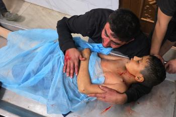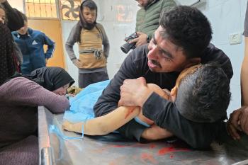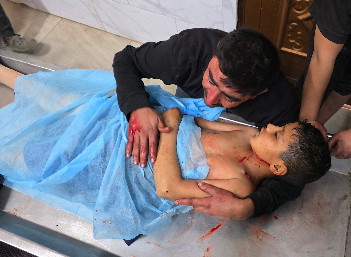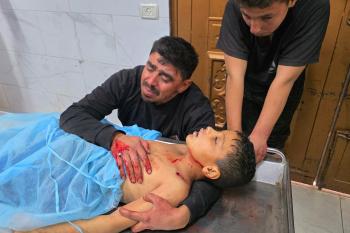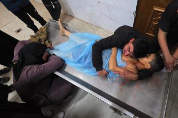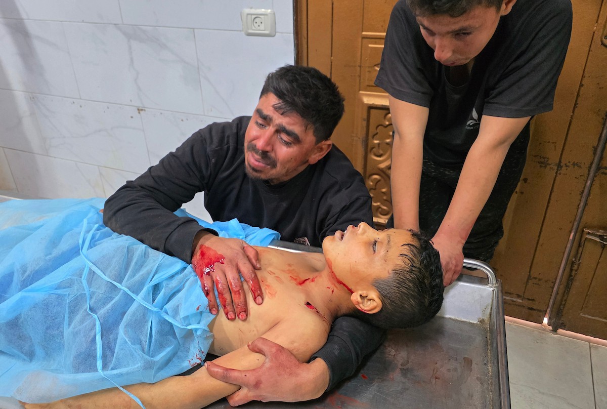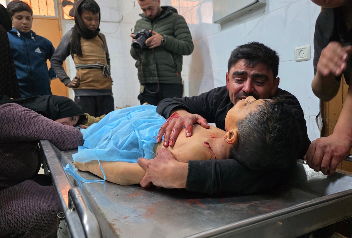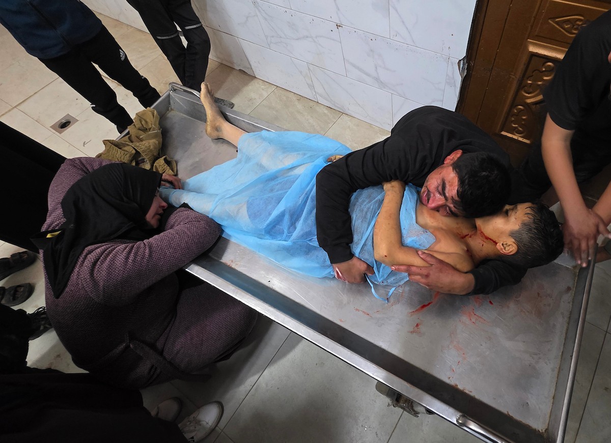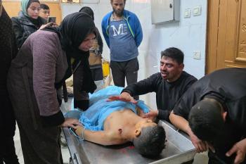 عائلة الطفل المعتصم بالله الشرافي تودع جثمانه في مجمع ناصر الطبي بخان يونس، جنوب قطاع غزة، 21 يناير/كانون الثاني 2026. (صورة: طارق محمد)