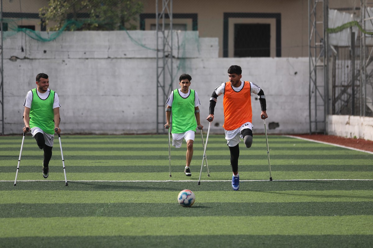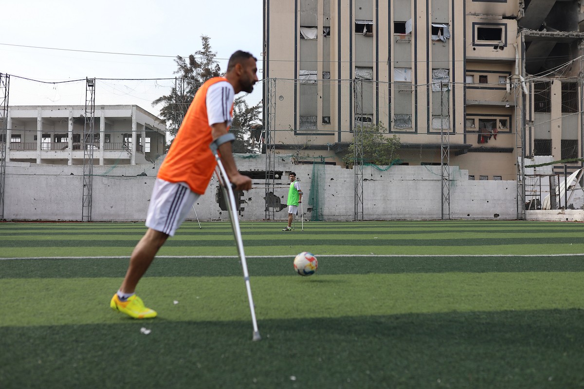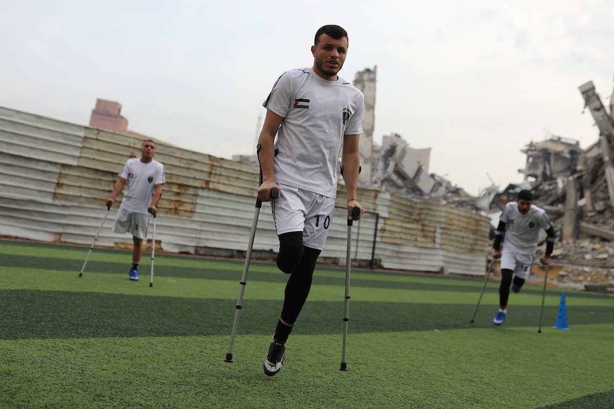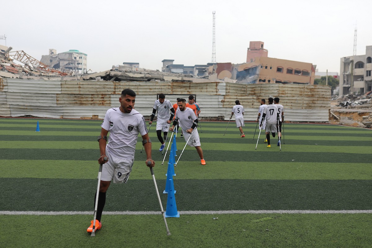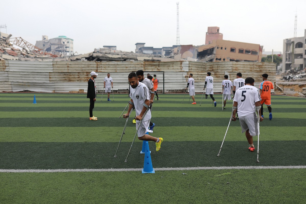 يتدرب فريق "غزة الإرادة" في ملعب ما زال قائماً رغم الأضرار الجسيمة التي لحقت به جراء الهجمات الإسرائيلية على مدينة غزة. يتألف الفريق بالكامل من رياضيين مبتوري الأطراف يستخدمون العكازات، 22 يناير/كانون الثاني 2026.تصوير: عمر نعمان