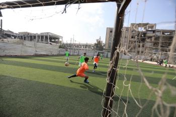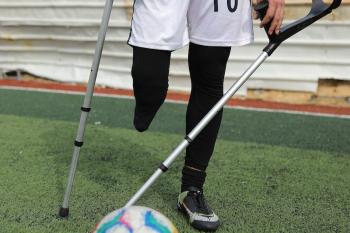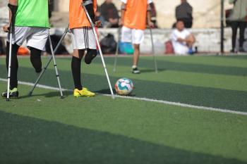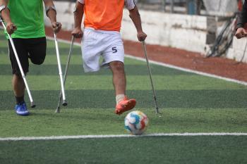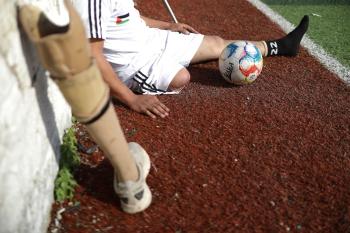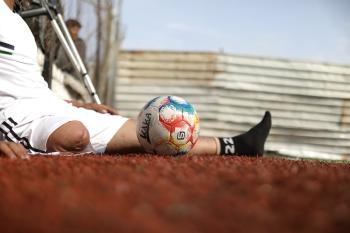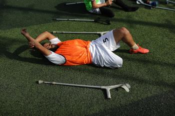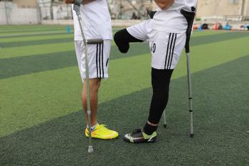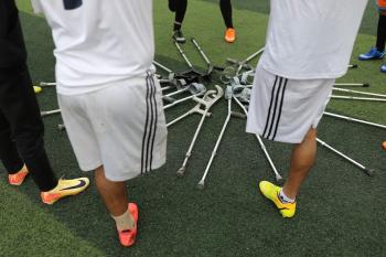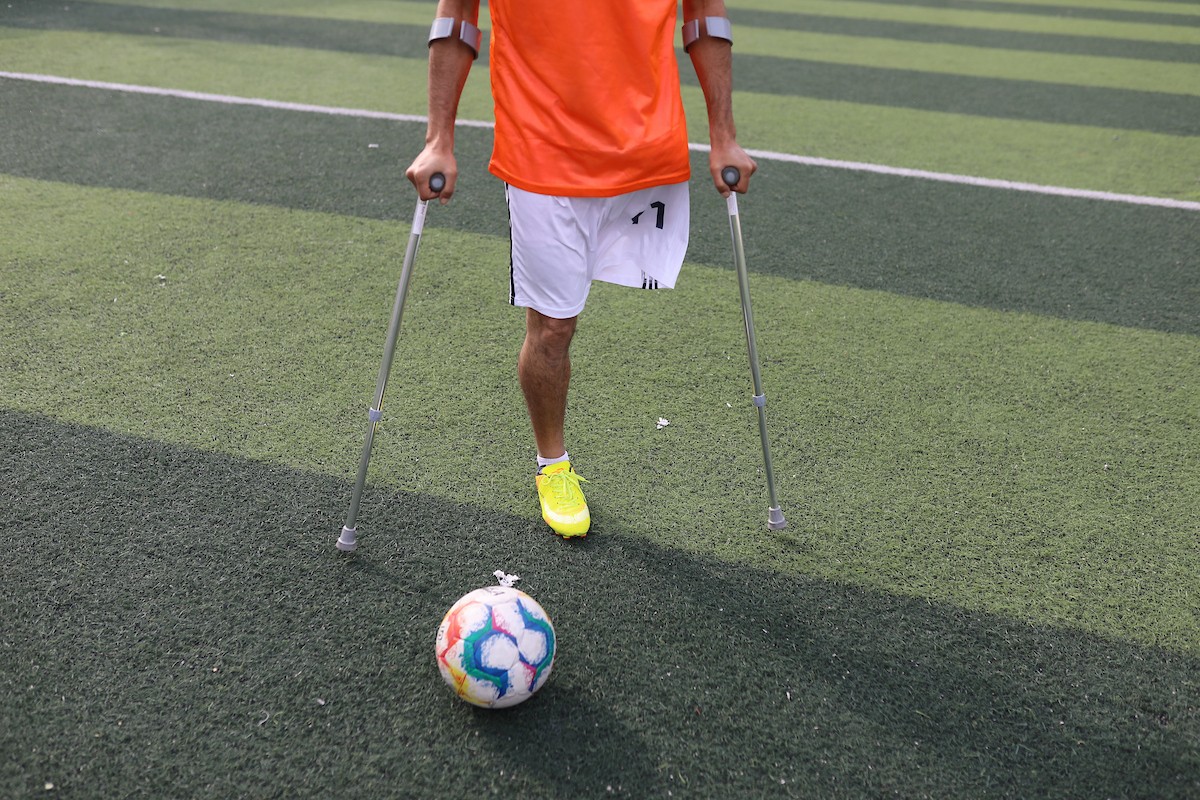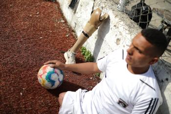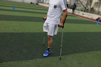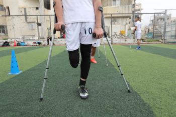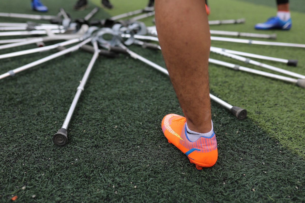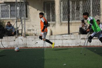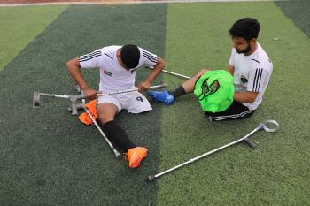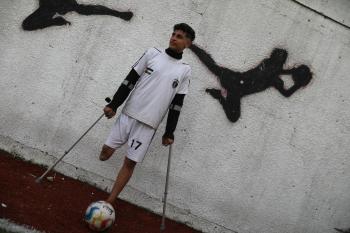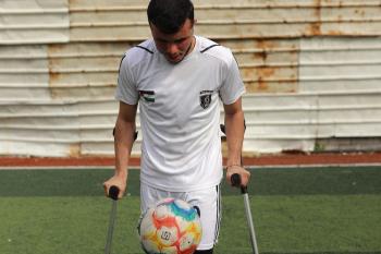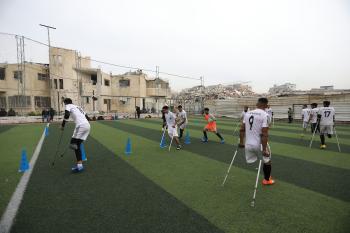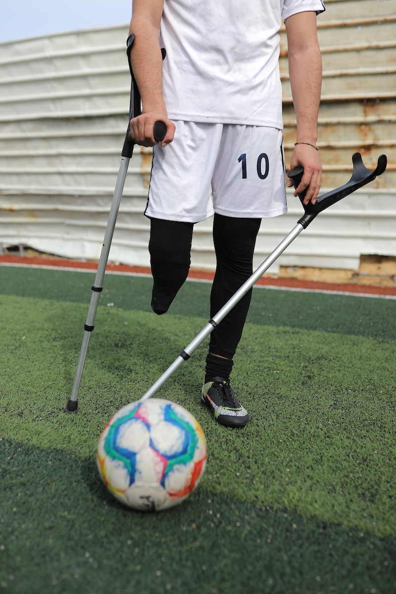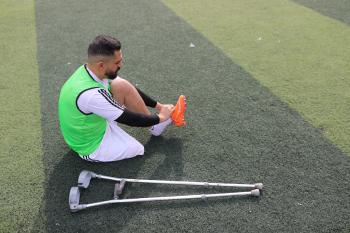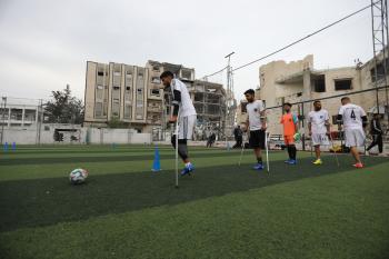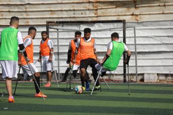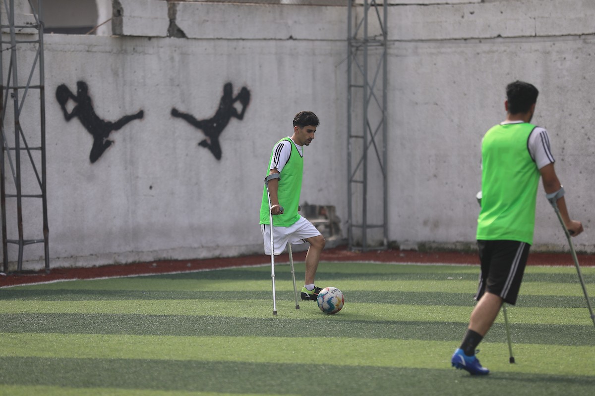 يتدرب فريق "غزة الإرادة" في ملعب ما زال قائماً رغم الأضرار الجسيمة التي لحقت به جراء الهجمات الإسرائيلية على مدينة غزة. يتألف الفريق بالكامل من رياضيين مبتوري الأطراف يستخدمون العكازات، 22 يناير/كانون الثاني 2026.تصوير: عمر نعمان