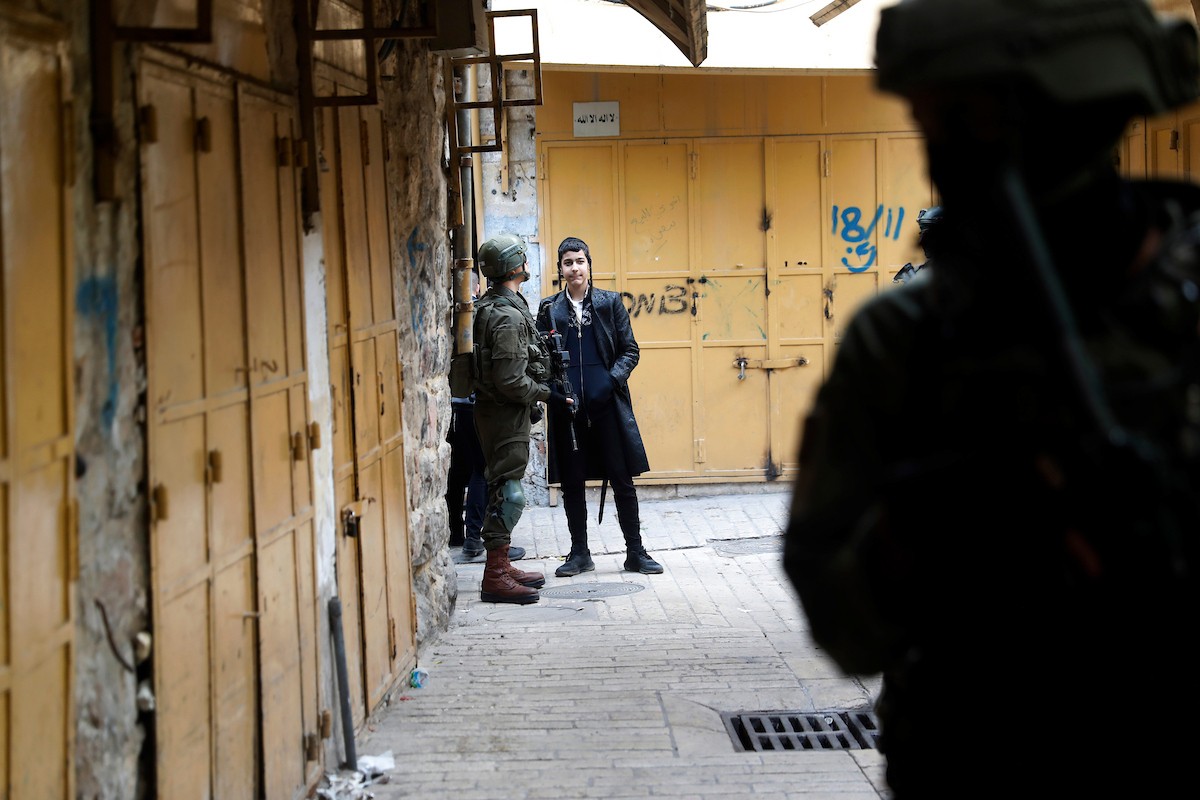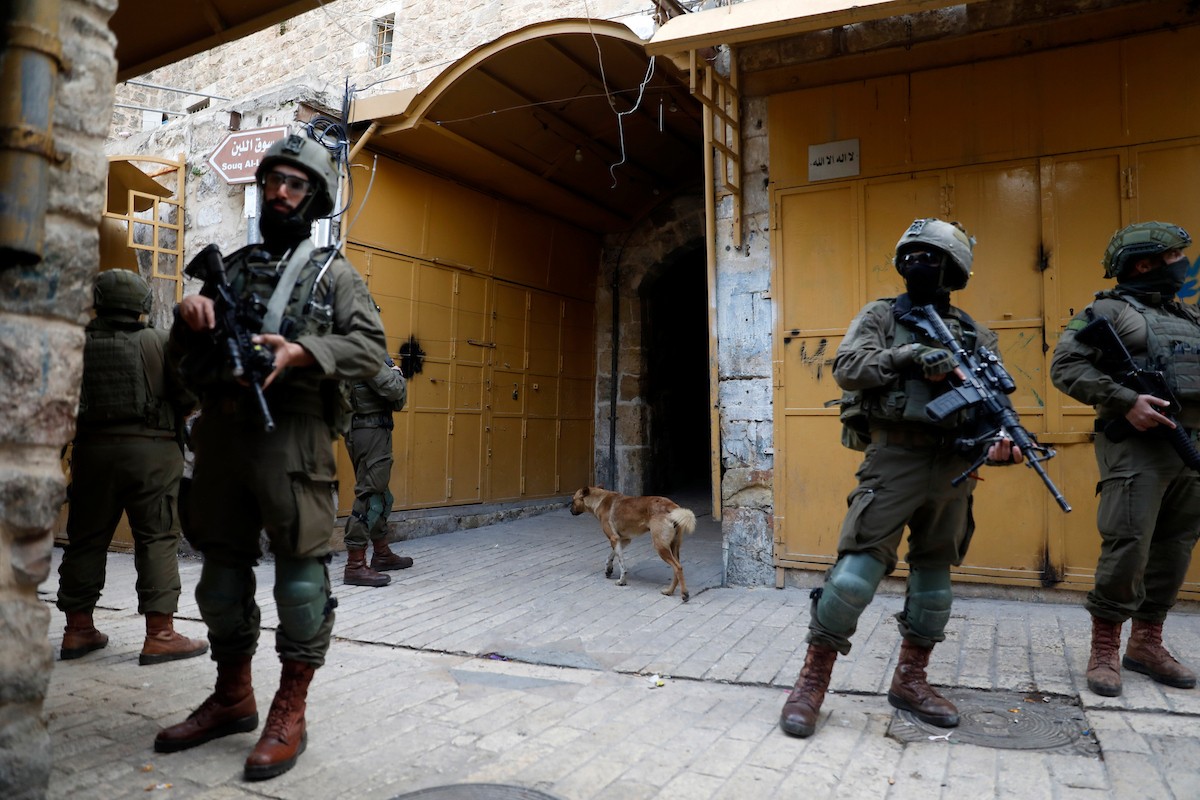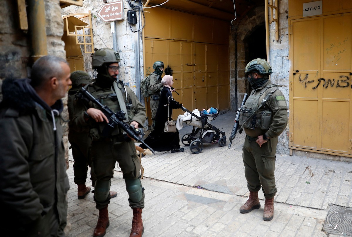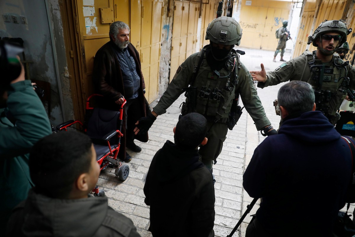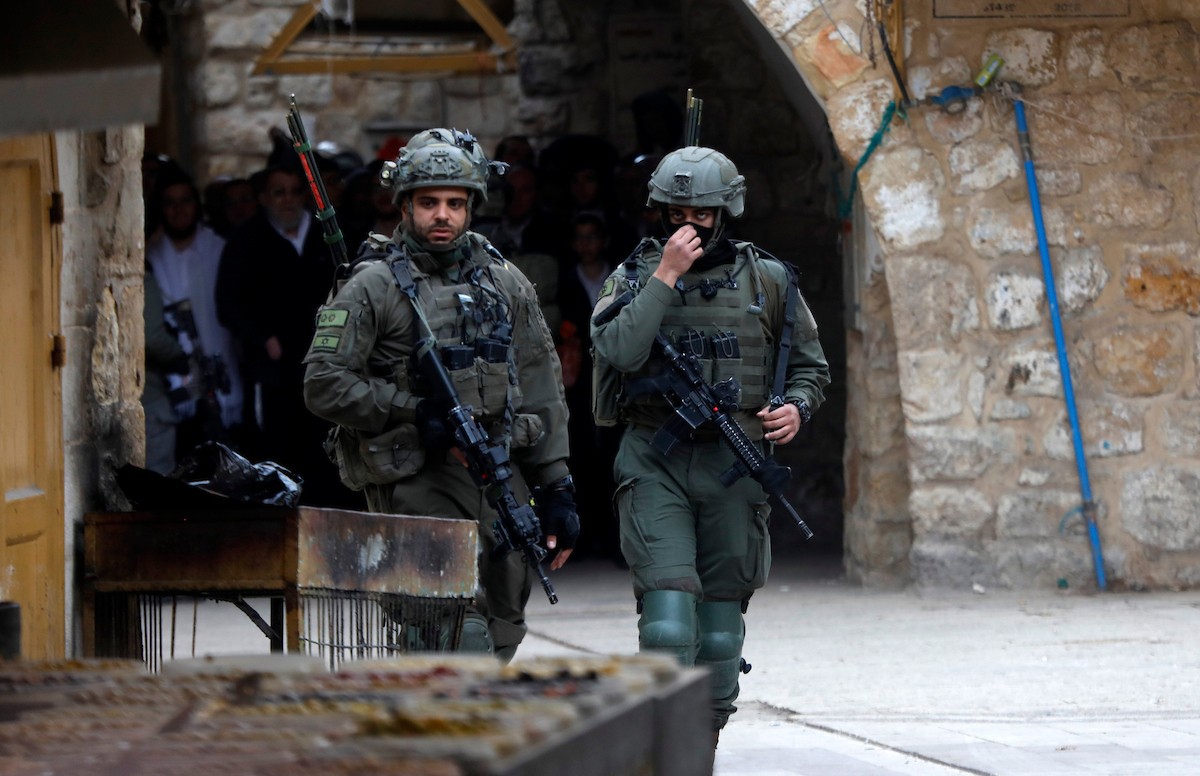 جنود إسرائيليون يتخذون إجراءات أمنية مشددة بإغلاق مداخل ومخارج منطقة البلدة القديمة في الخليل، جنوب الضفة الغربية، في 24 يناير/كانون الثاني 2026، خلال اقتحام مستوطنون يهود البلدة تحت حماية القوات الإسرائيلية. (صورة: مأمون وزواز)