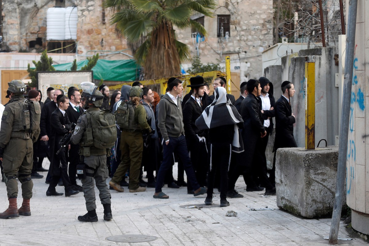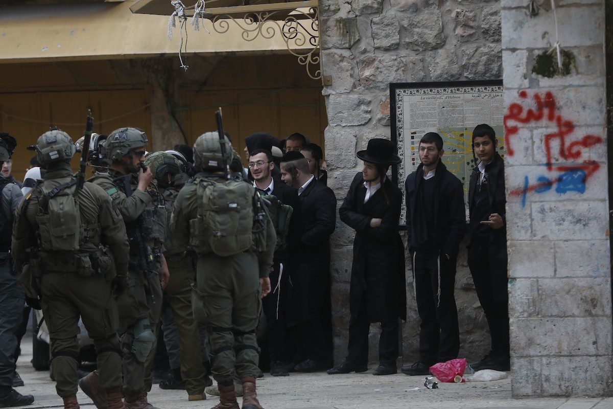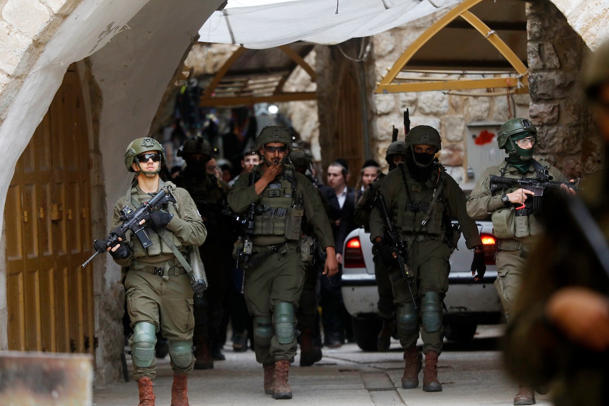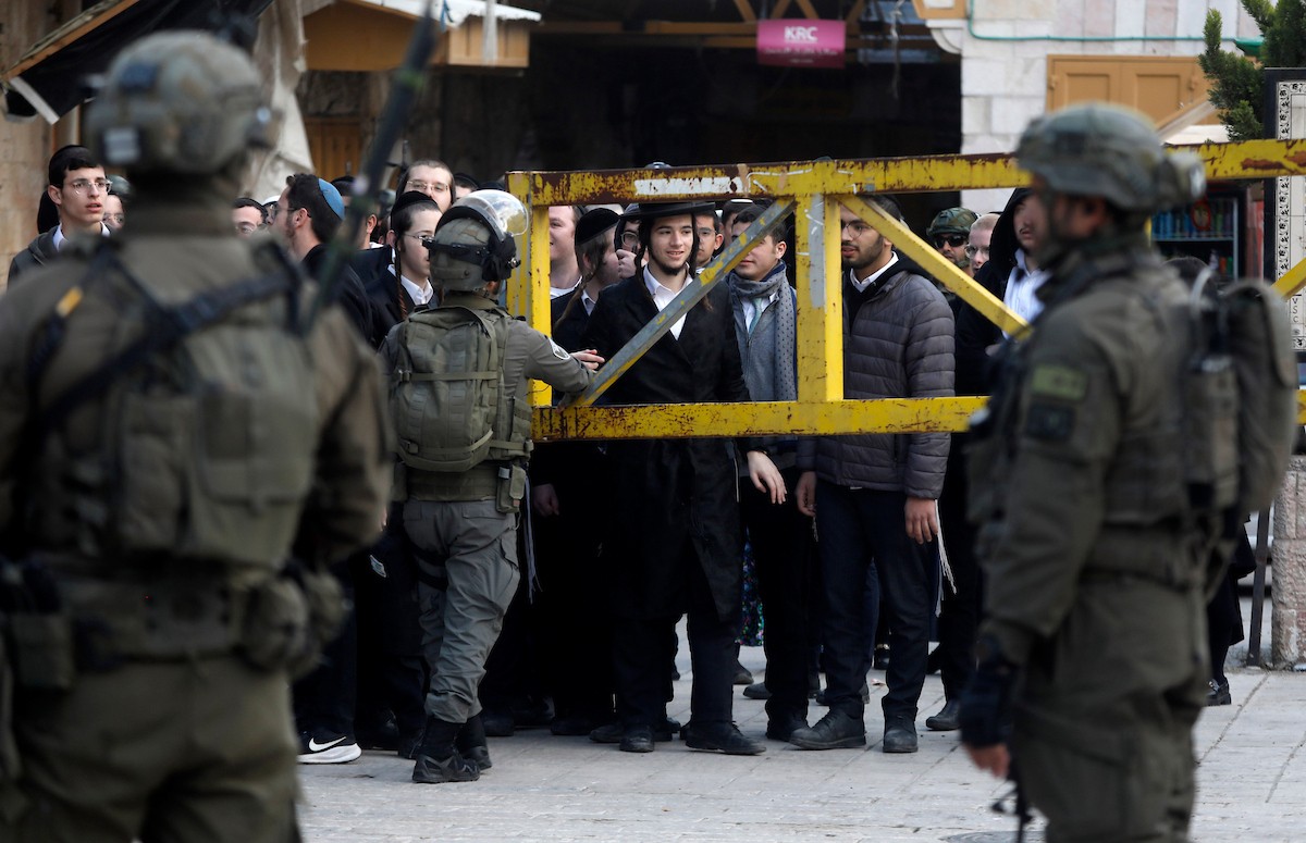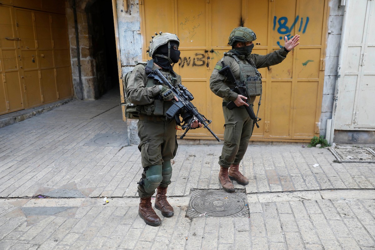 جنود إسرائيليون يتخذون إجراءات أمنية مشددة بإغلاق مداخل ومخارج منطقة البلدة القديمة في الخليل، جنوب الضفة الغربية، في 24 يناير/كانون الثاني 2026، خلال اقتحام مستوطنون يهود البلدة تحت حماية القوات الإسرائيلية. (صورة: مأمون وزواز)