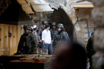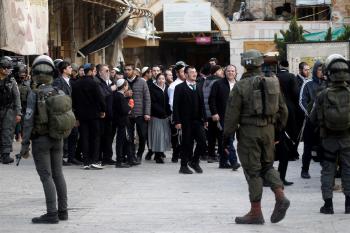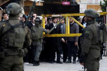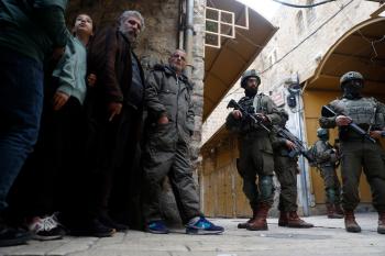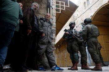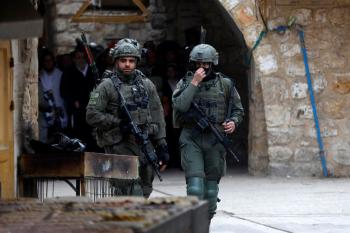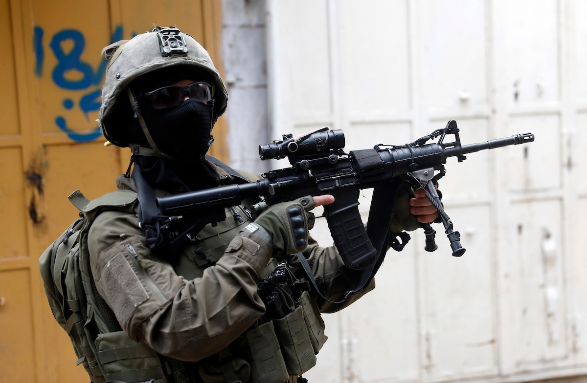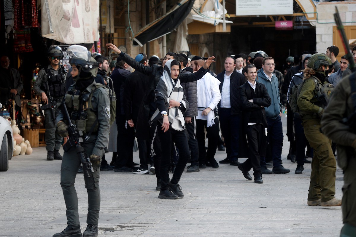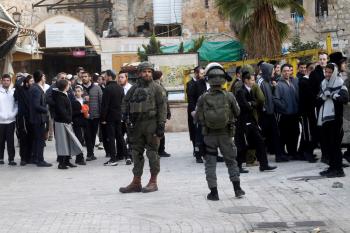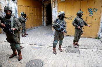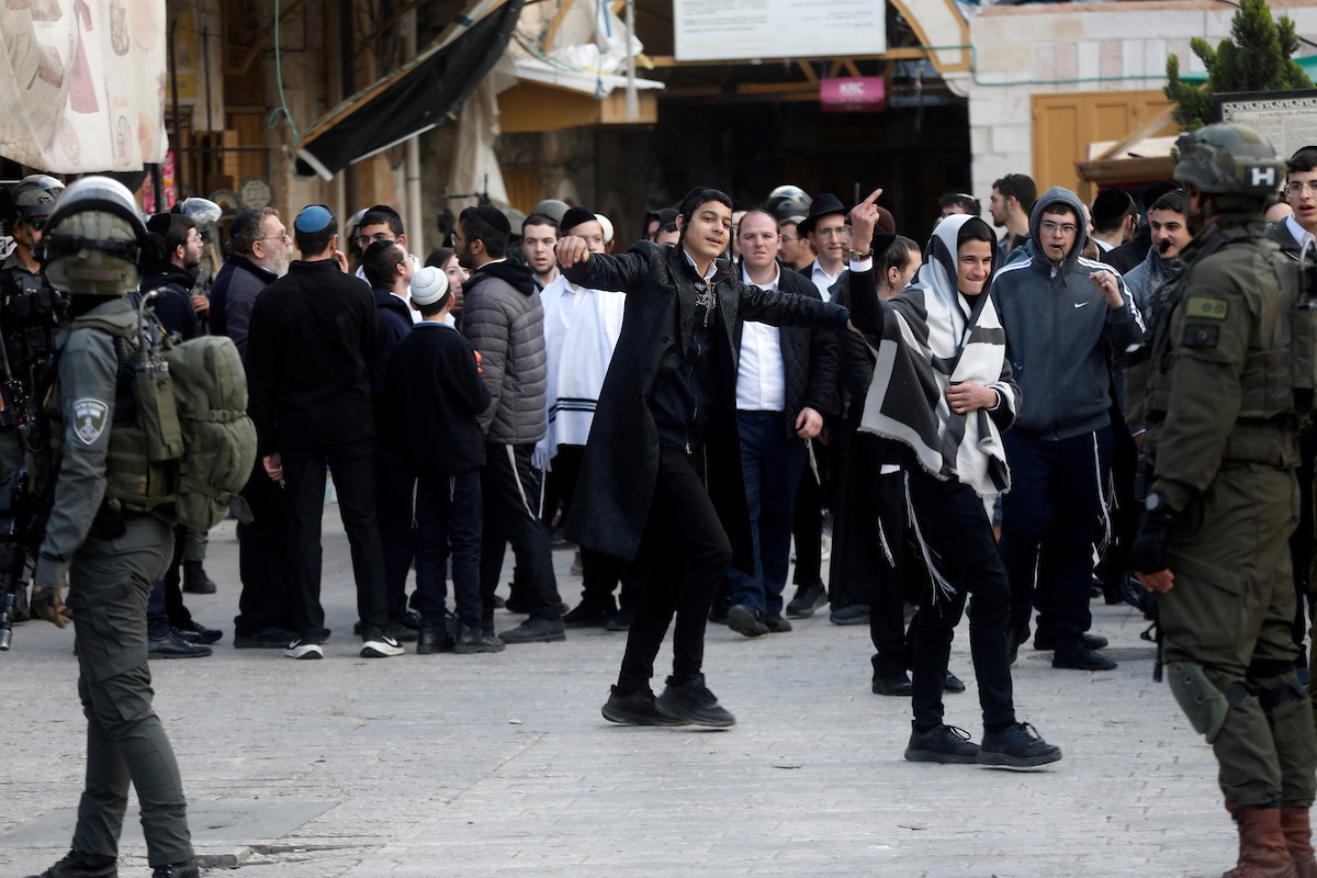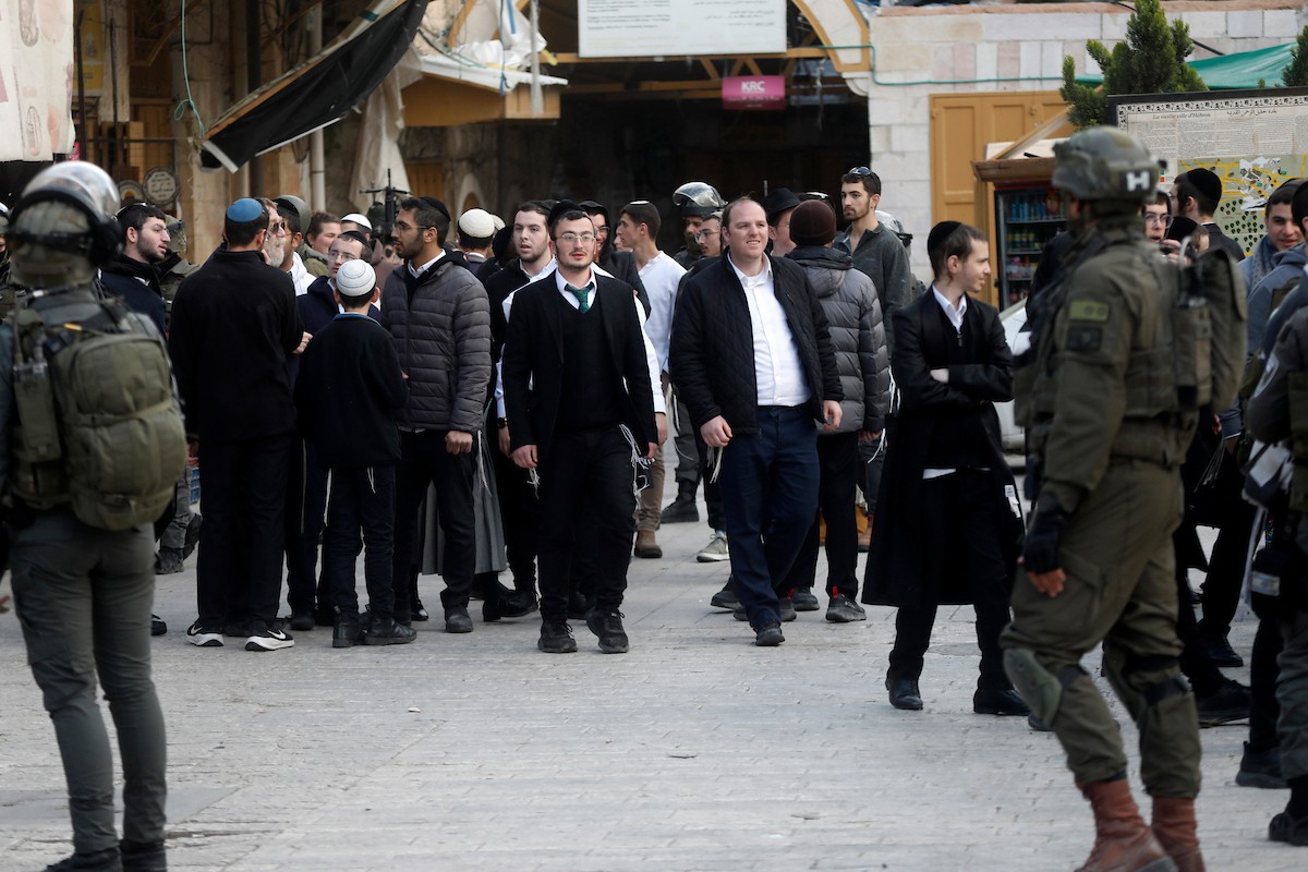 جنود إسرائيليون يتخذون إجراءات أمنية مشددة بإغلاق مداخل ومخارج منطقة البلدة القديمة في الخليل، جنوب الضفة الغربية، في 24 يناير/كانون الثاني 2026، خلال اقتحام مستوطنون يهود البلدة تحت حماية القوات الإسرائيلية. (صورة: مأمون وزواز)