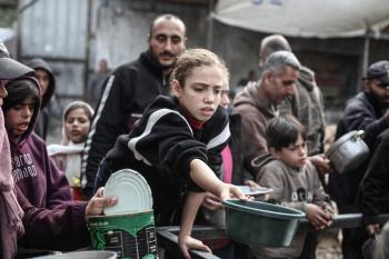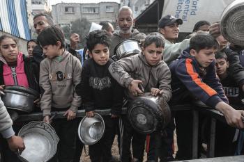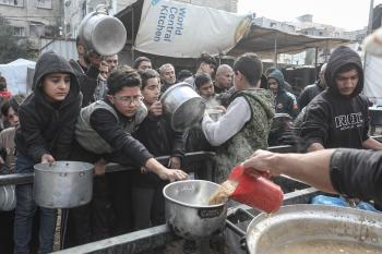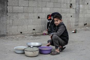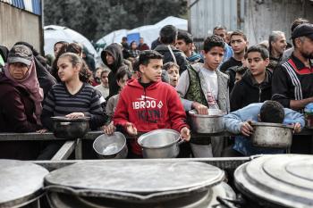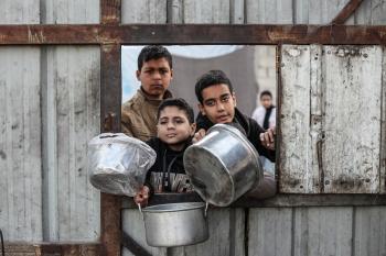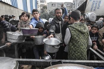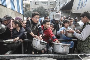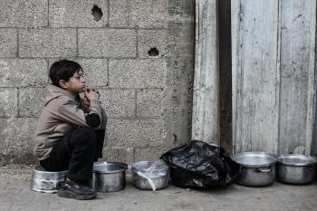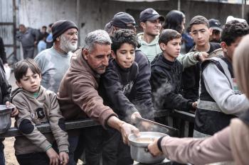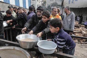 قطاع غزة: وجبات ساخنة وزعتها إحدى الجمعيات الخيرية في مخيم النصيرات للاجئين، وسط نقص حاد في الغذاء ناجم عن الهجمات الإسرائيلية المستمرة وتدهور الأوضاع الإنسانية 26 يناير/كانون الثاني 2026. تصوير: معز صالحي