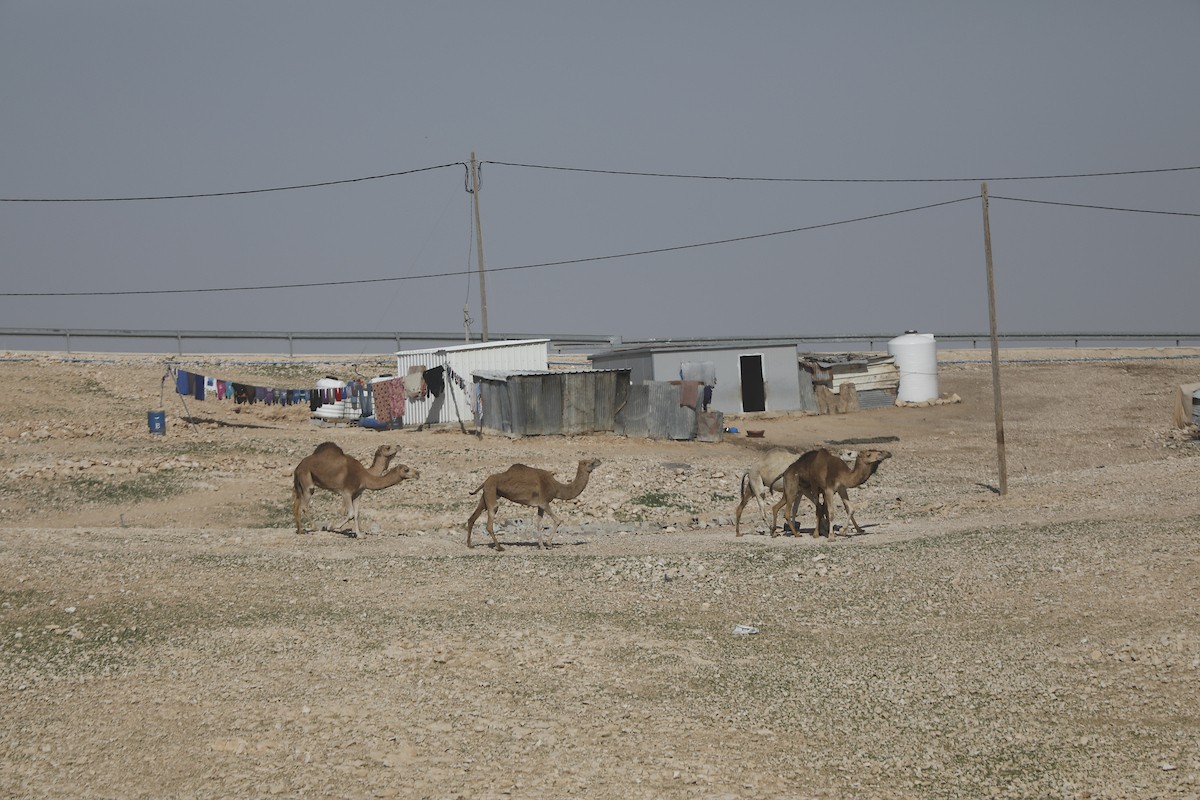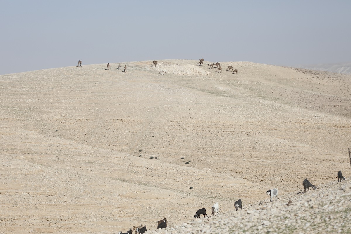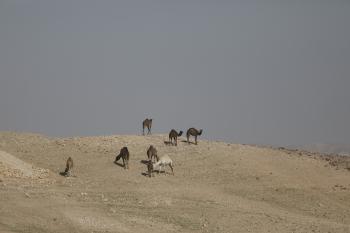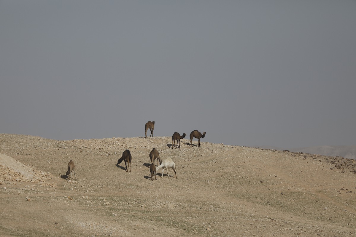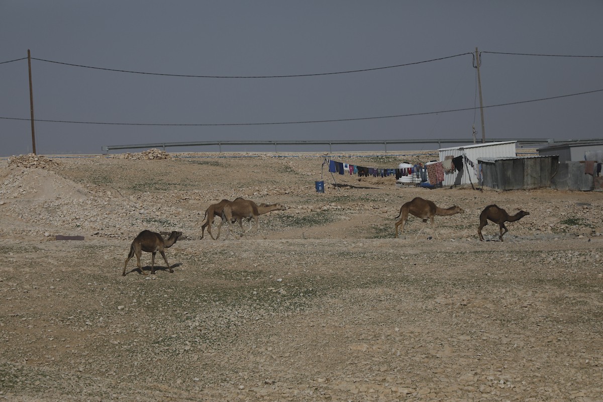 قطيع من الإبل يرعى بسلام في الجبال والمناطق الصحراوية جنوب الخليل، مشهد طبيعي يعكس بساطة حياة البدو وجمال الصحراء، 26 يناير 2026. تصوير: مأمون وزواز