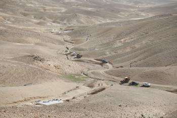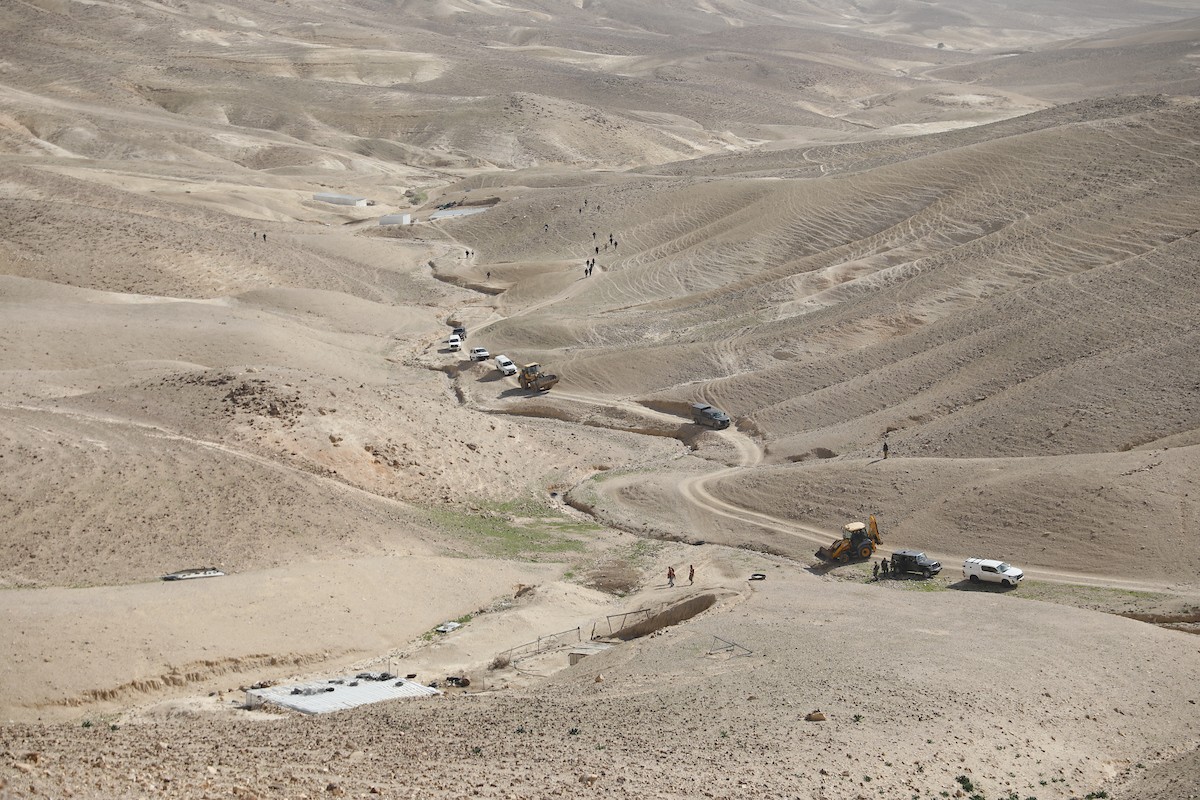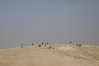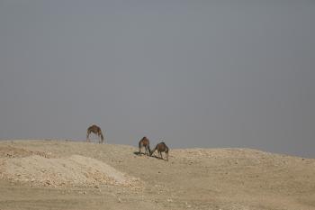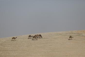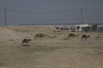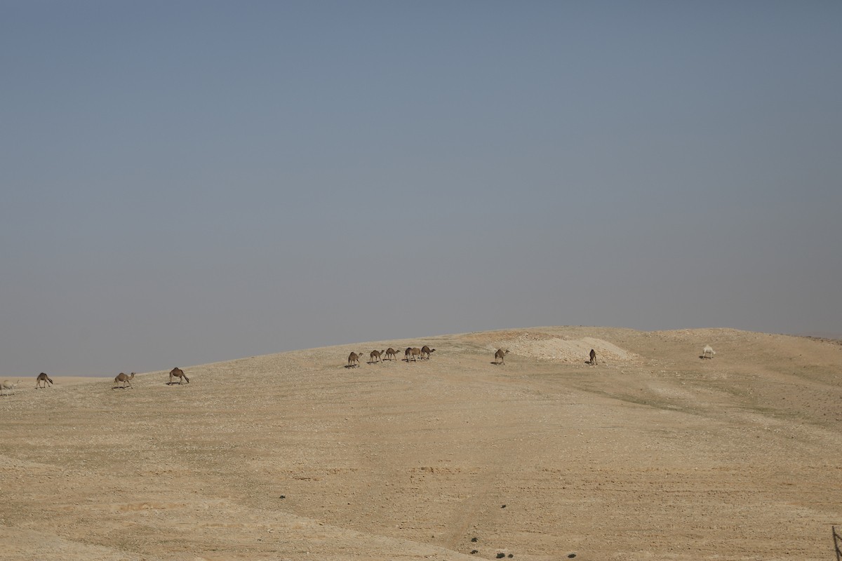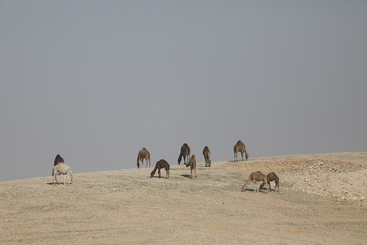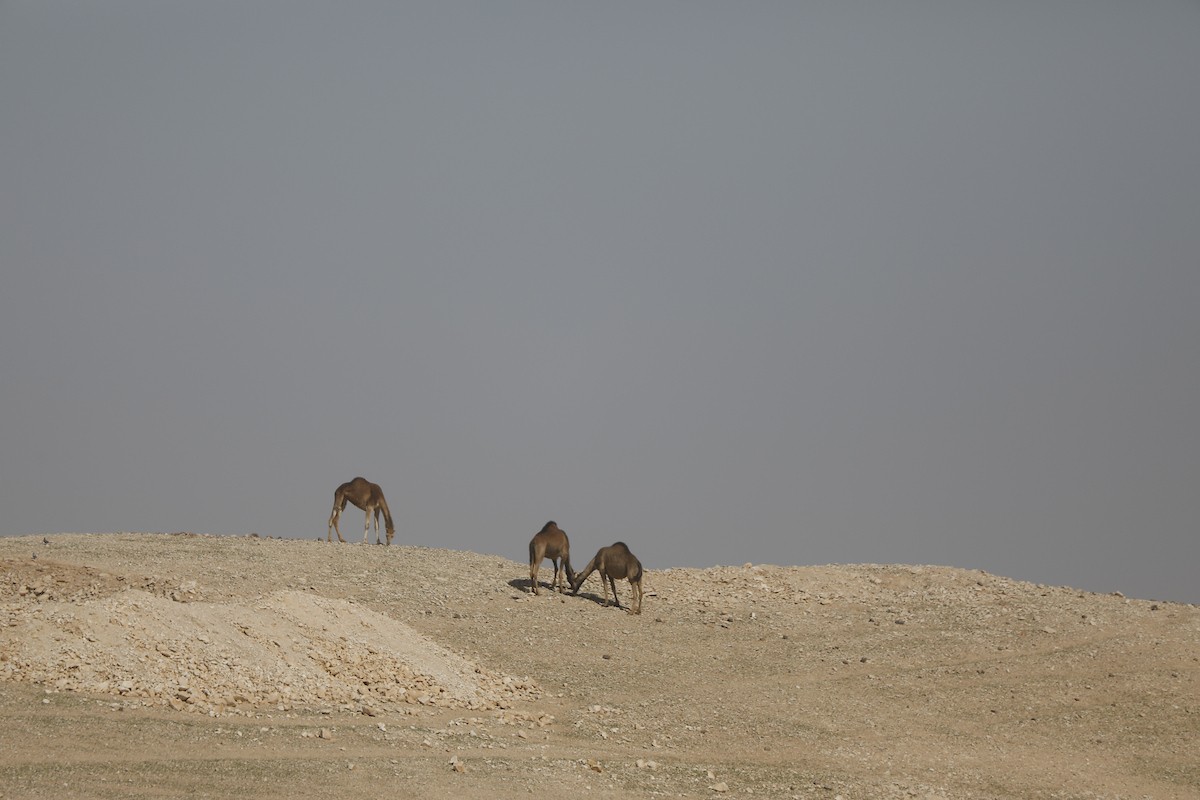 قطيع من الإبل يرعى بسلام في الجبال والمناطق الصحراوية جنوب الخليل، مشهد طبيعي يعكس بساطة حياة البدو وجمال الصحراء، 26 يناير 2026. تصوير: مأمون وزواز