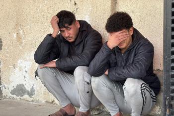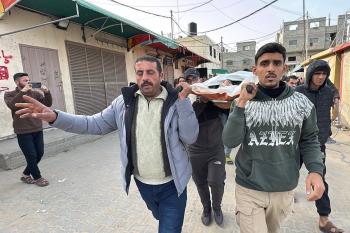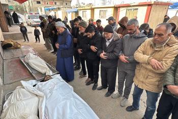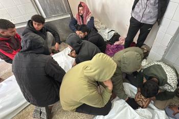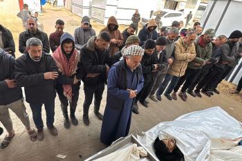 فلسطينيون يودعون جثامين ثلاثة مواطنين استشهدوا في غارات جوية إسرائيلية على مخيم المغازي للاجئين، قبل موكب جنازتهم في مستشفى الأقصى بدير البلح، وسط قطاع غزة. 30 يناير/كانون الثاني 2026. صورة: أحمد إبراهيم