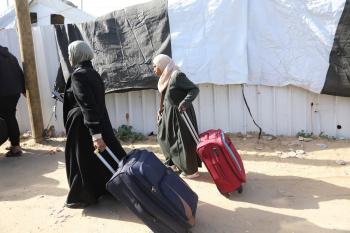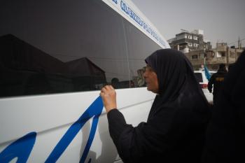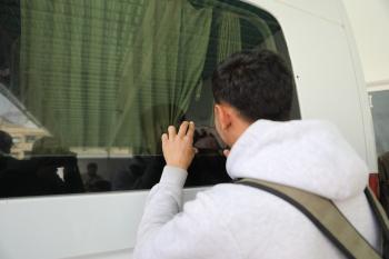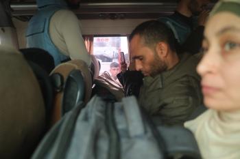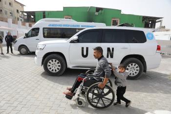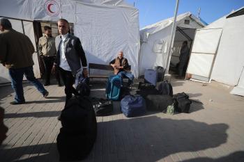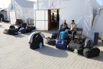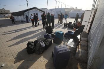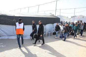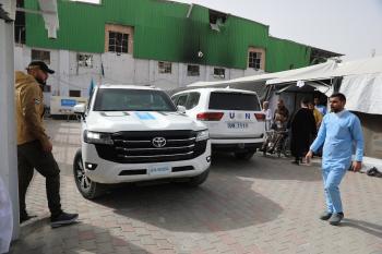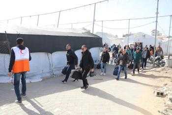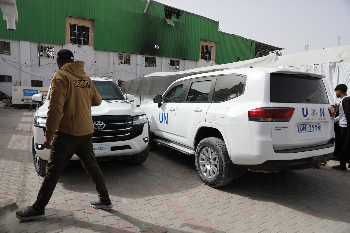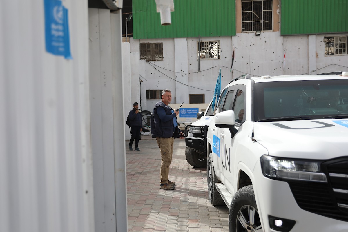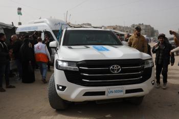 مركبات تابعة للأمم المتحدة تنقل عدداً من الجرحى ومرافقيهم من المقر الميداني لجمعية الهلال الأحمر الفلسطيني في خان يونس إلى معبر كرم أبو سالم لتلقي العلاج الطبي في الخارج،2 فبراير/شباط 2026