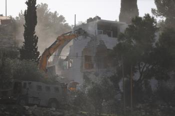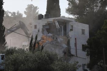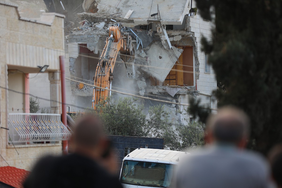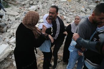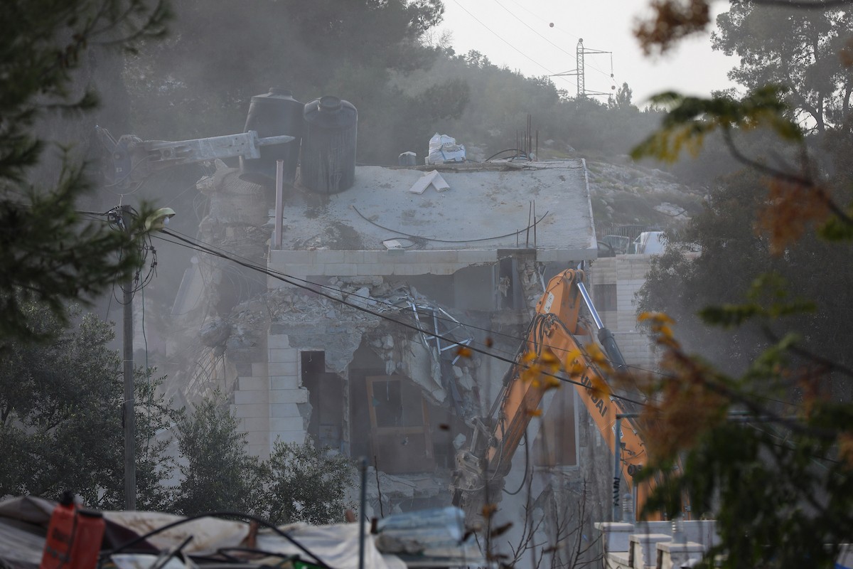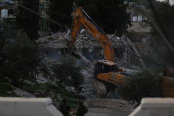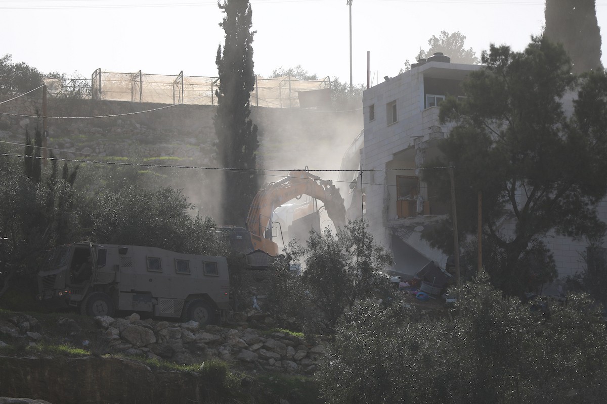 ردود فعل فلسطينية بعد أن هدمت القوات الإسرائيلية منزلاً فلسطينياً من ثلاثة طوابق بحجة عدم وجود رخصة بناء، في بلدة ترقوميا ، شمال غرب الخليل، بالضفة الغربية، في الأول من فبراير/شباط 2026. (صورة: مأمون وزواز)