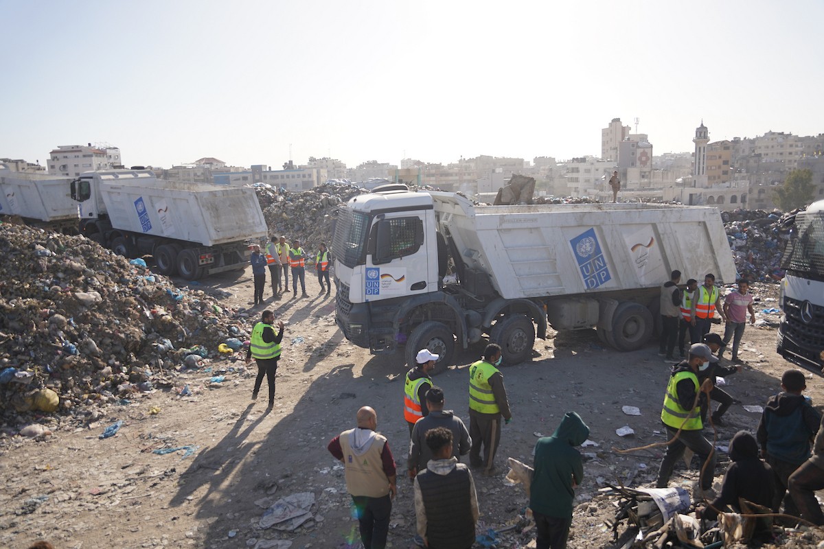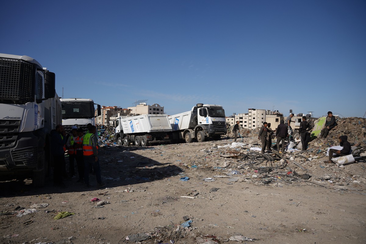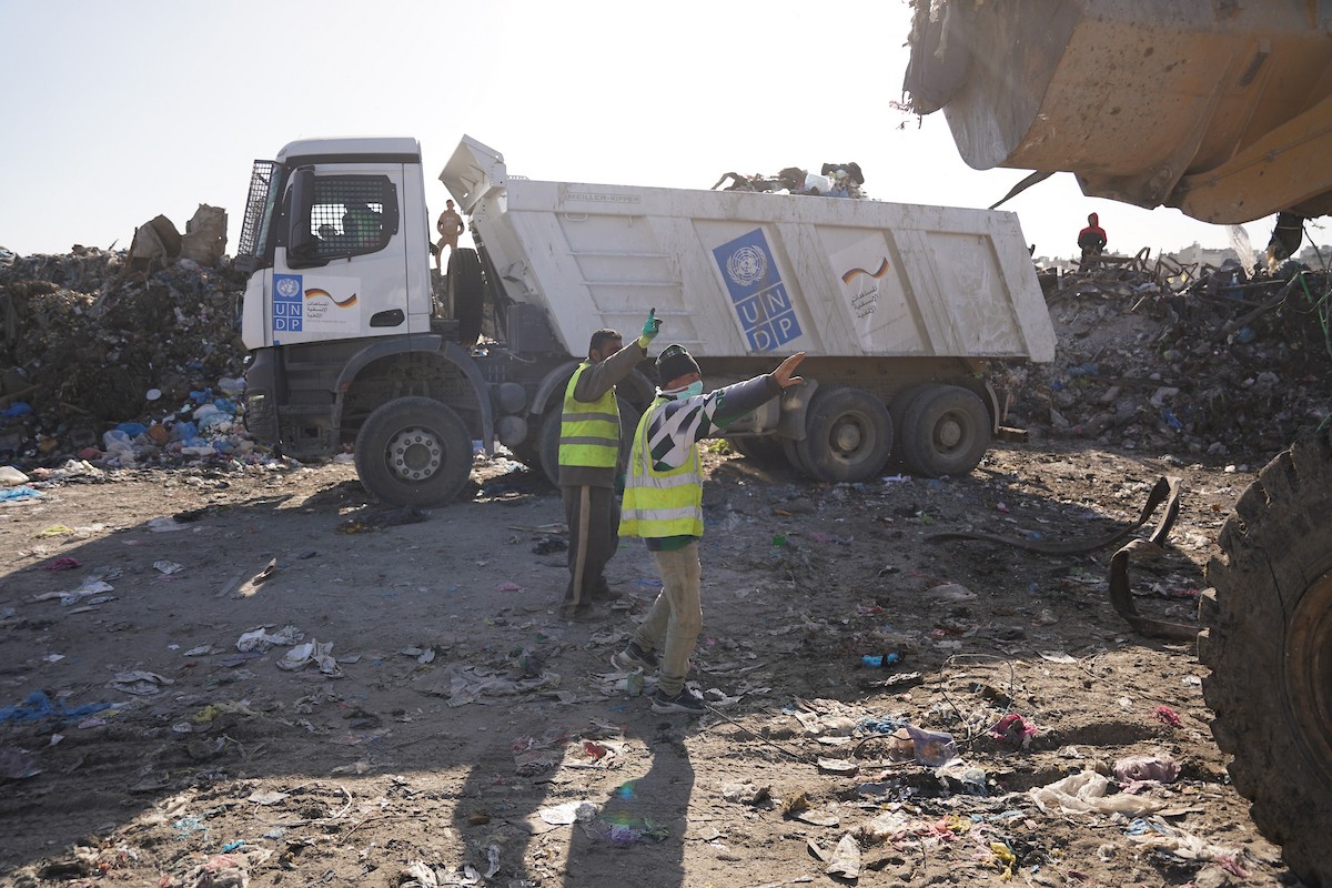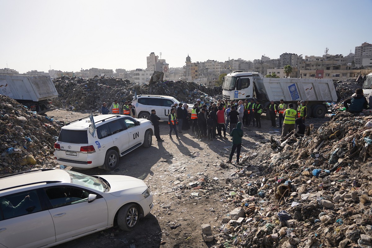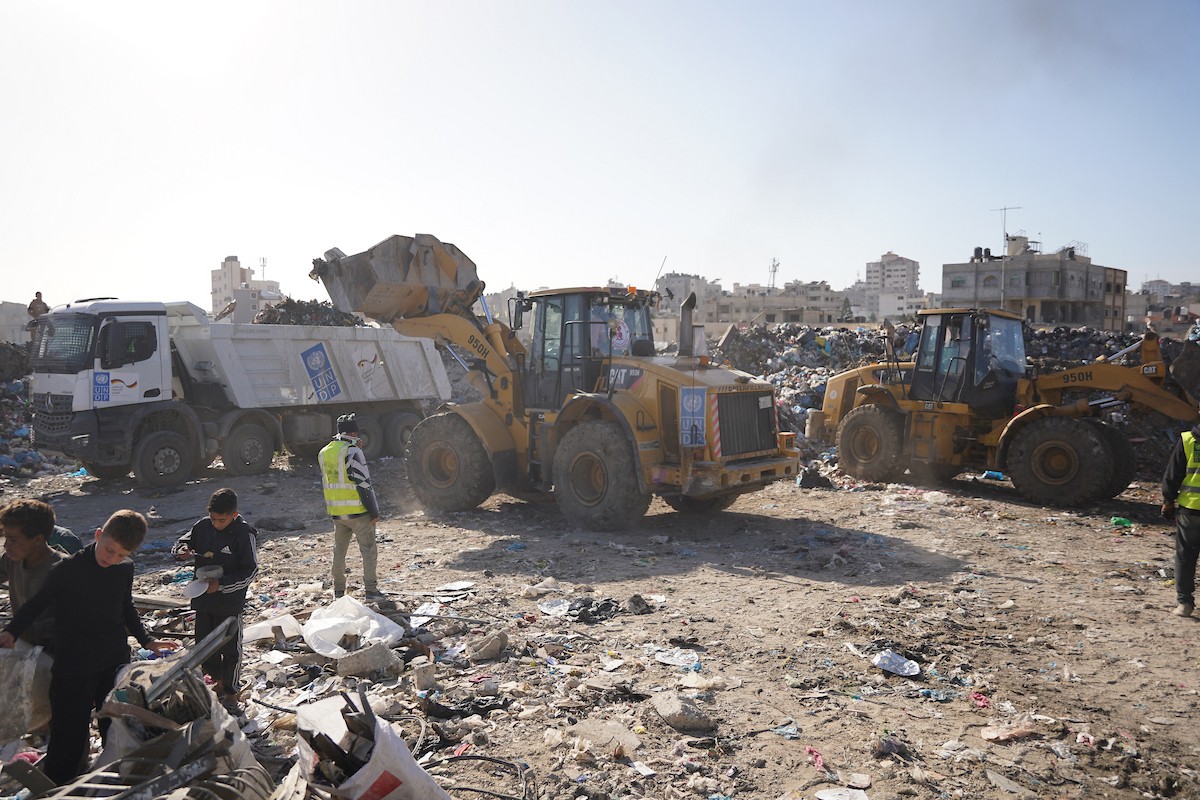 برنامج الأمم المتحدة الإنمائي يطلق عمليات تنظيف في أحد أكبر مواقع النفايات بمدينة غزة، والذي يُشكّل خطراً جسيماً على الصحة العامة، في منطقة سوق فراس على طول شارع عمر المختار ، 11 فبراير/شباط 2026. (صورة: عمر أشتوي)