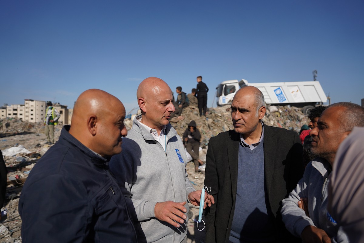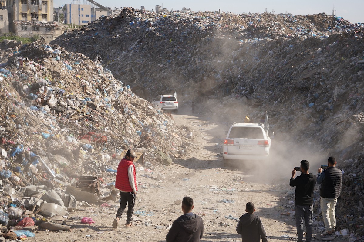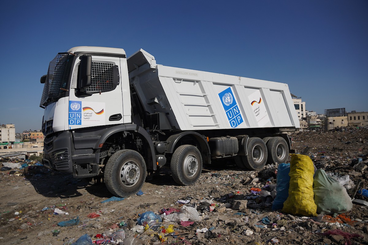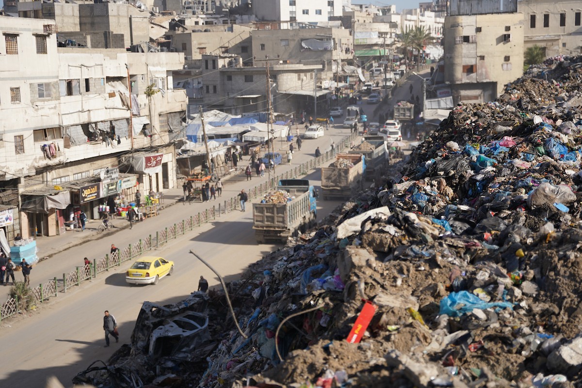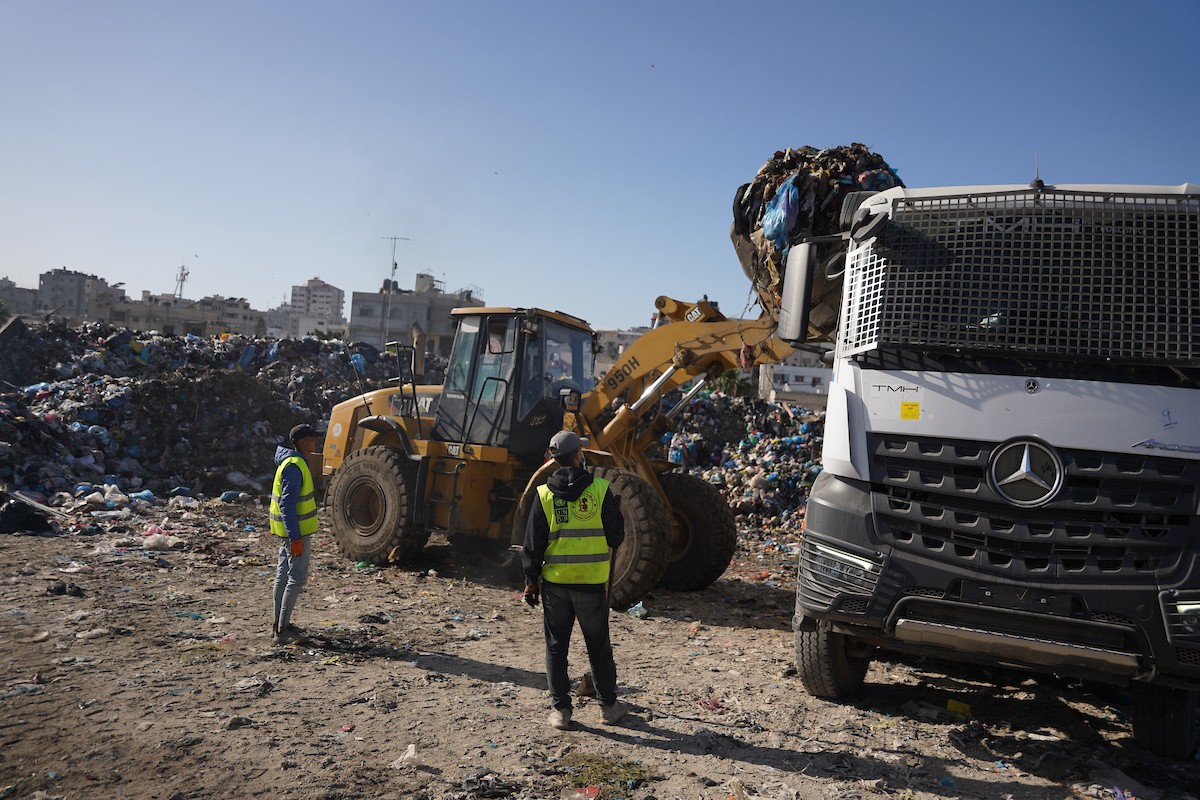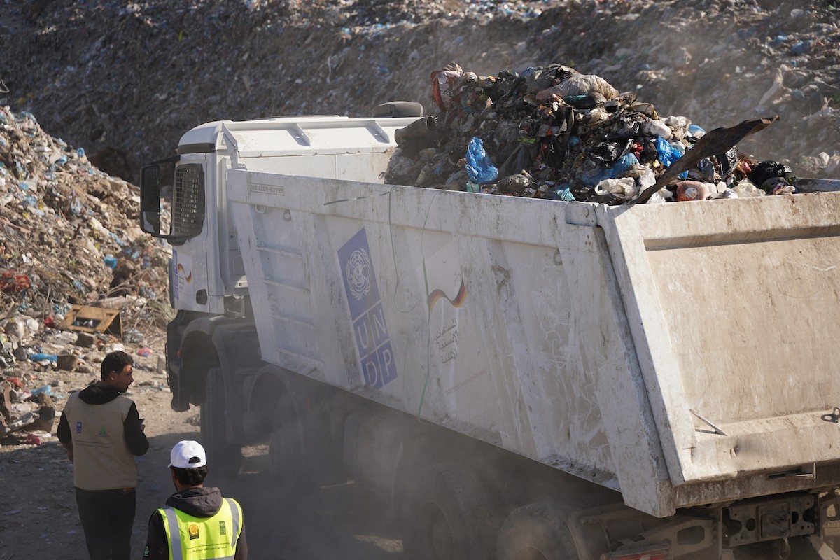 برنامج الأمم المتحدة الإنمائي يطلق عمليات تنظيف في أحد أكبر مواقع النفايات بمدينة غزة، والذي يُشكّل خطراً جسيماً على الصحة العامة، في منطقة سوق فراس على طول شارع عمر المختار ، 11 فبراير/شباط 2026. (صورة: عمر أشتوي)