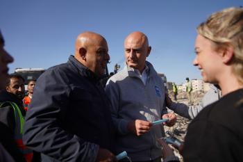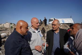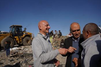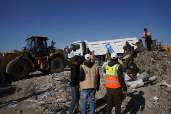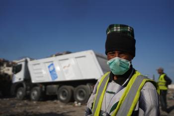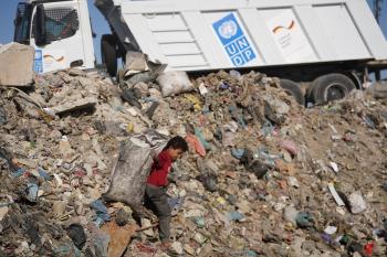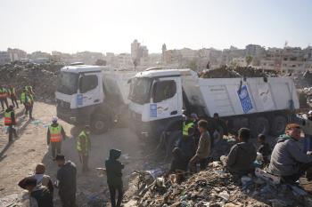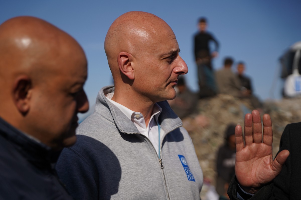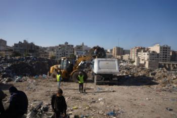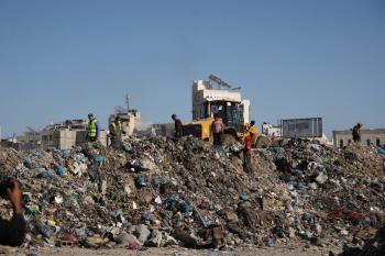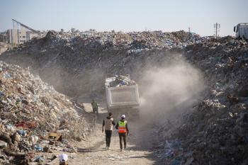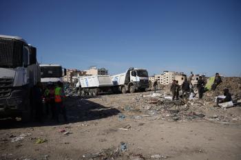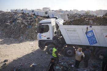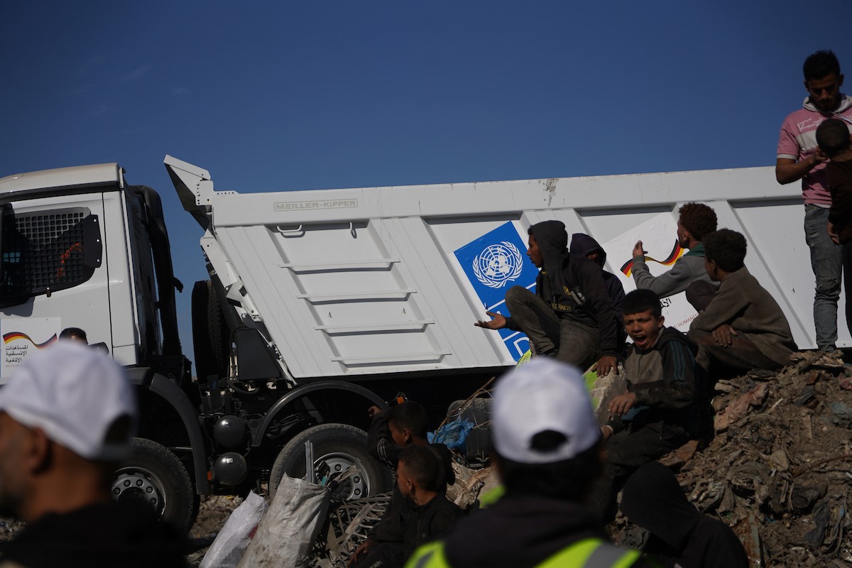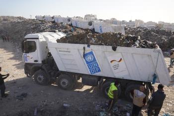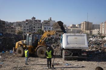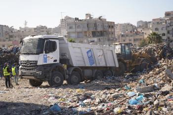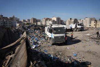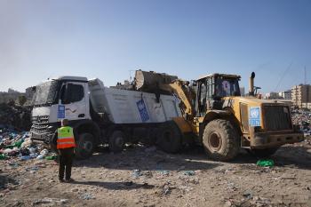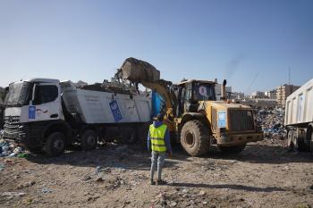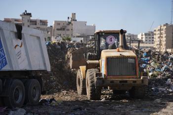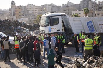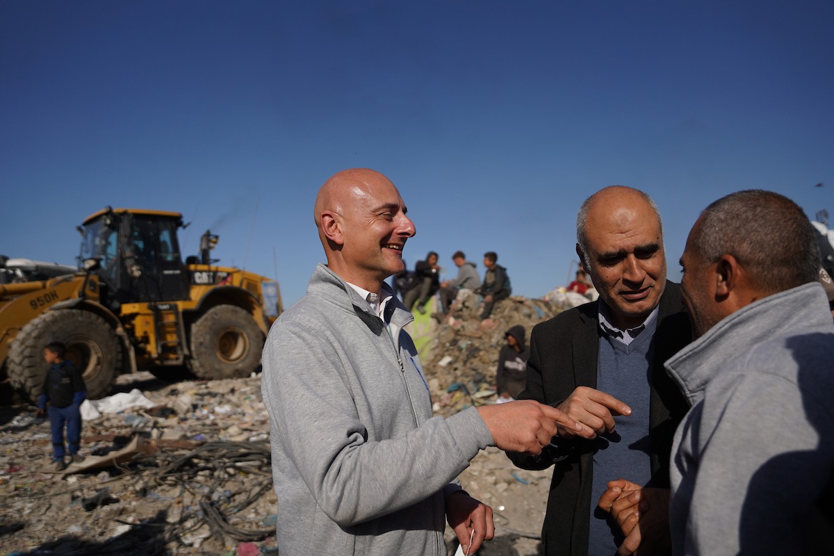 برنامج الأمم المتحدة الإنمائي يطلق عمليات تنظيف في أحد أكبر مواقع النفايات بمدينة غزة، والذي يُشكّل خطراً جسيماً على الصحة العامة، في منطقة سوق فراس على طول شارع عمر المختار ، 11 فبراير/شباط 2026. (صورة: عمر أشتوي)