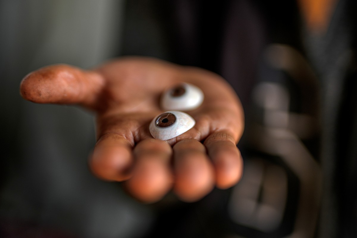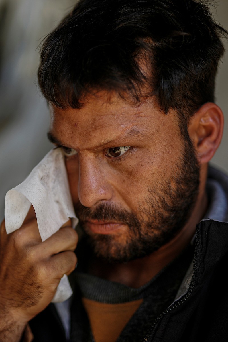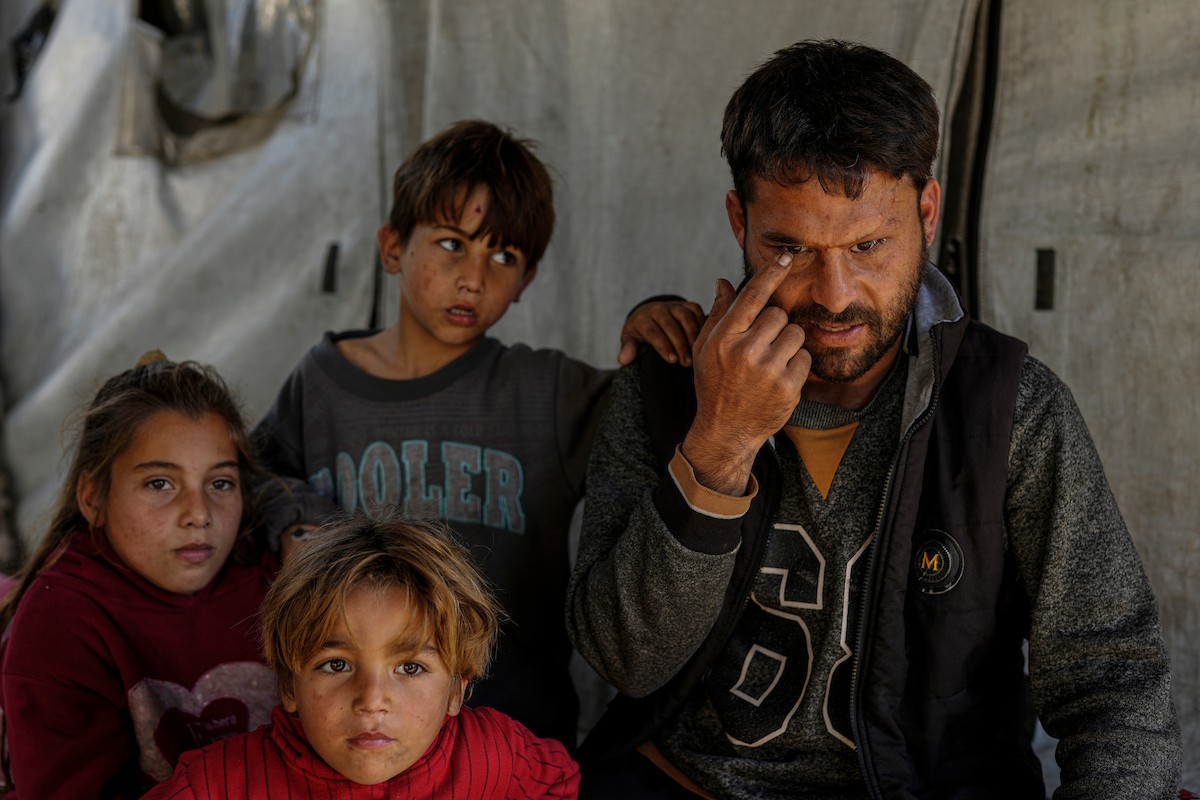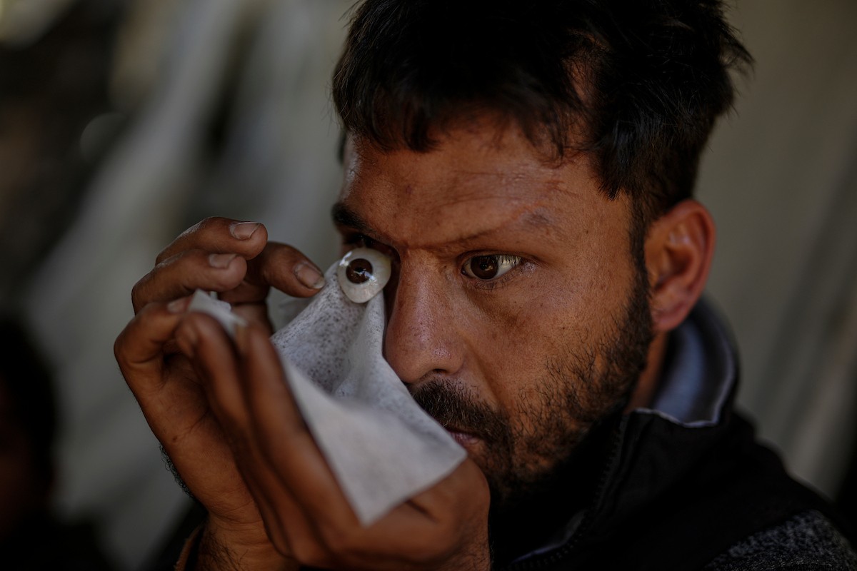 الفلسطيني لؤي أسامة صبح، 27 عامًا، أصيب بإعاقات دائمة وفقد بصره تمامًا جراء هجمات إسرائيلية، يكافح من أجل مواصلة حياته اليومية داخل خيمته في مدينة غزة في 11 فبراير/شباط 2026. صورة: عمر أشتوي