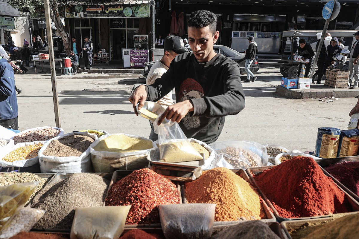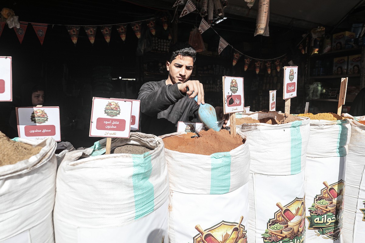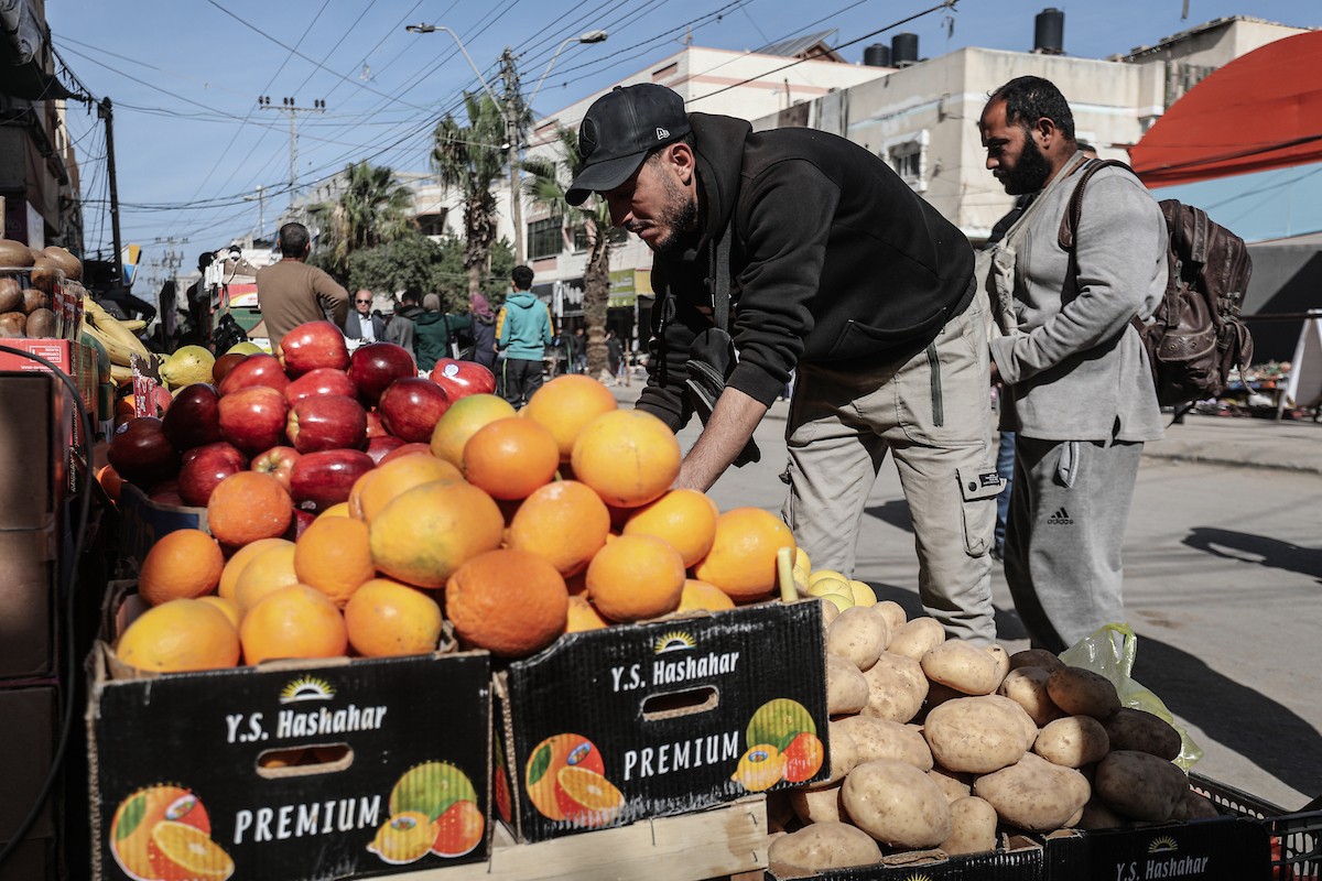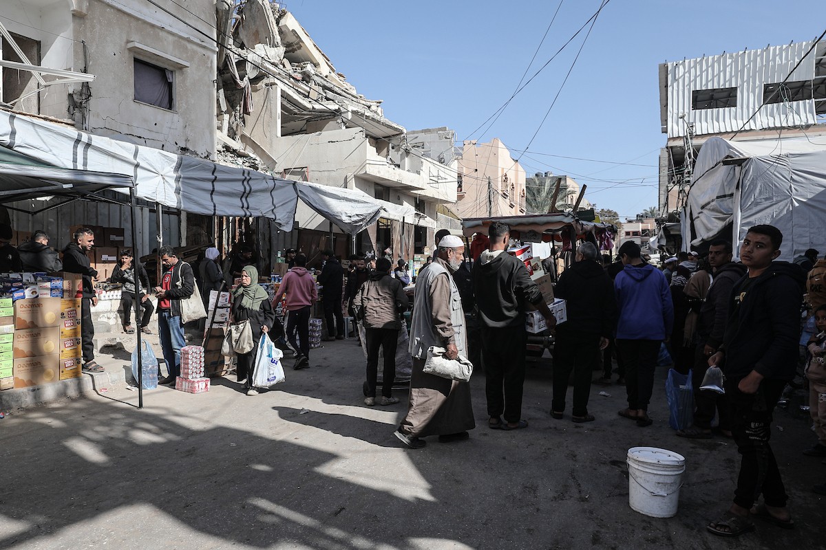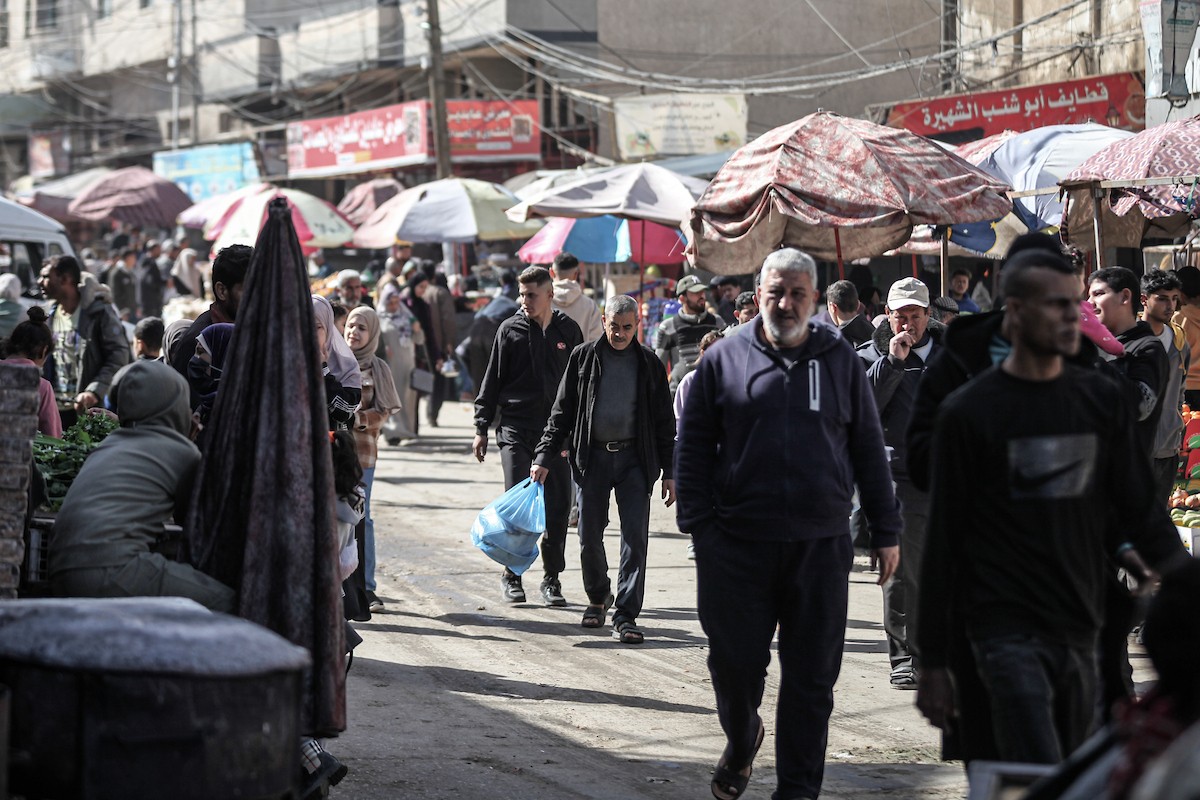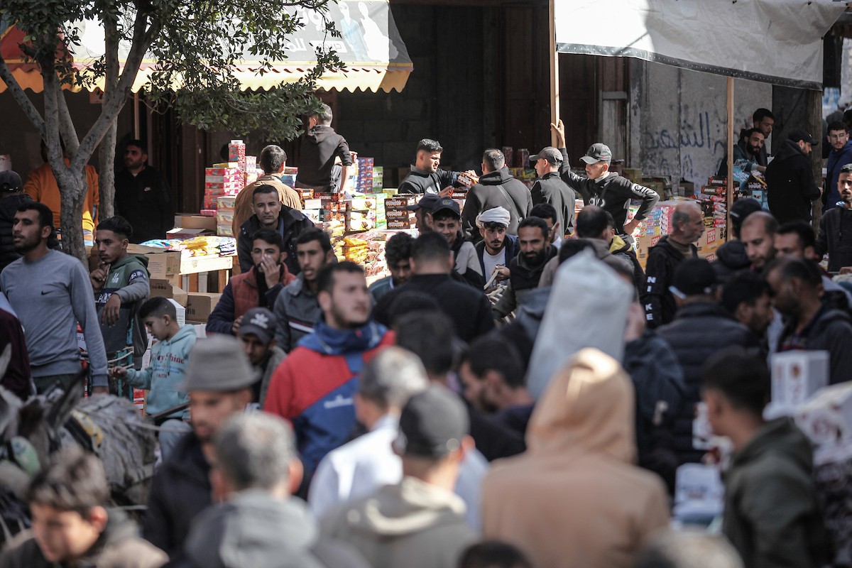 توافد الفلسطينيون باعداد غفيرة إلى السوق الشعبي في دير البلح، وسط قطاع غزة، في الأيام التي تسبق حلول شهر رمضان المبارك، 12 فبراير/شباط 2026. تصوير: معز صالحي
