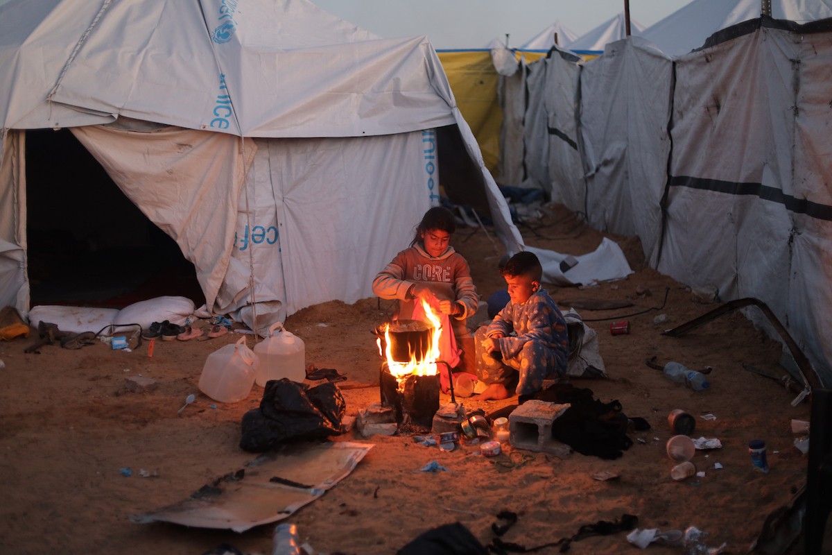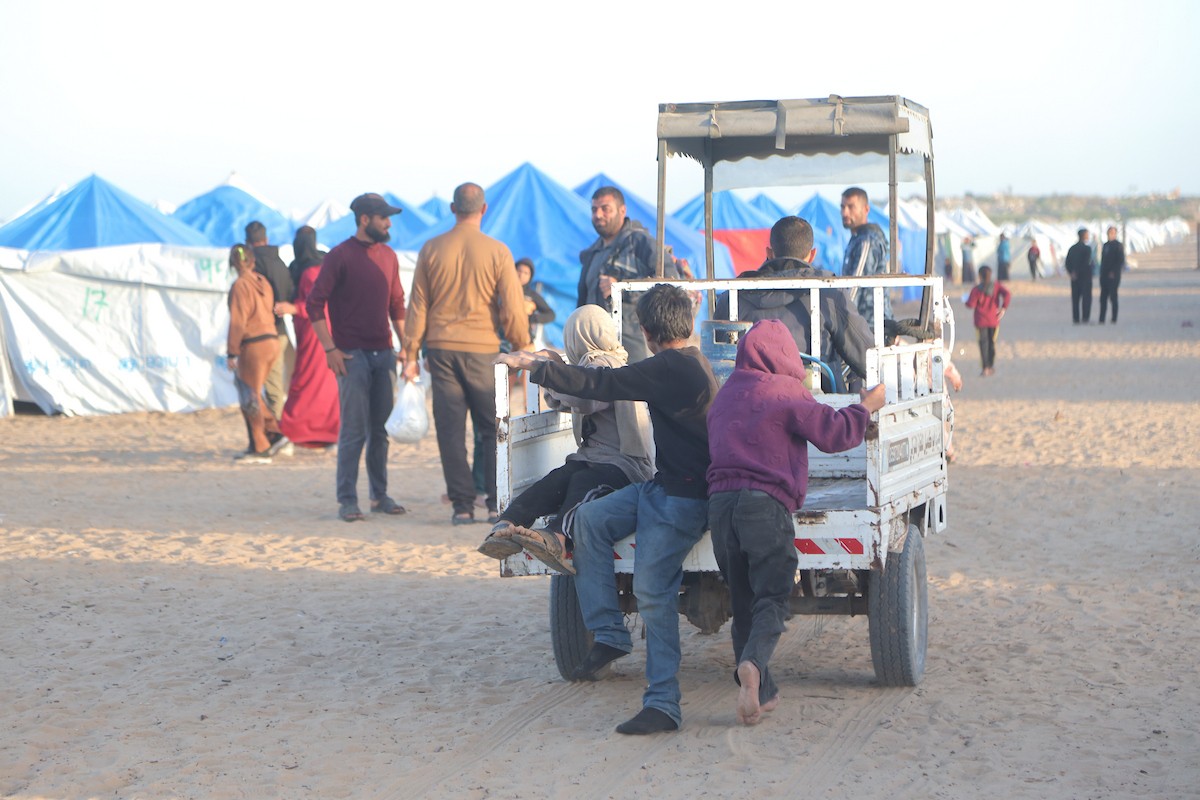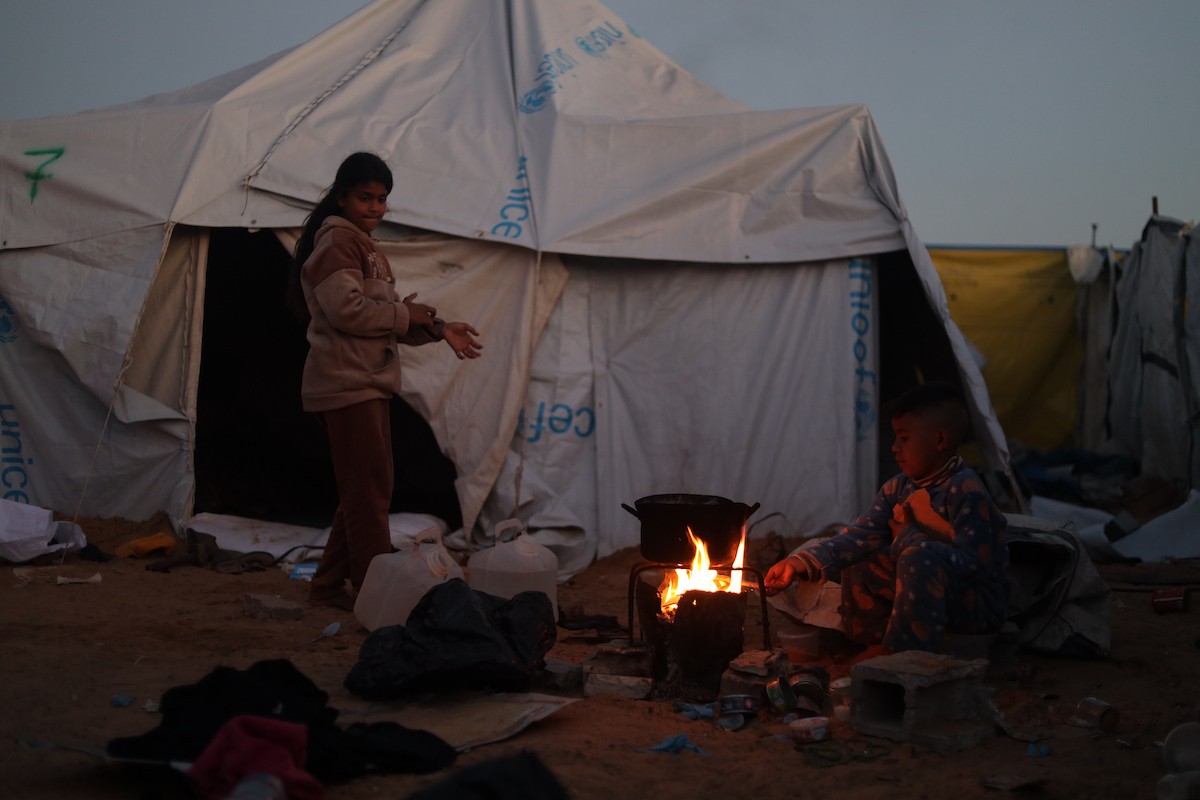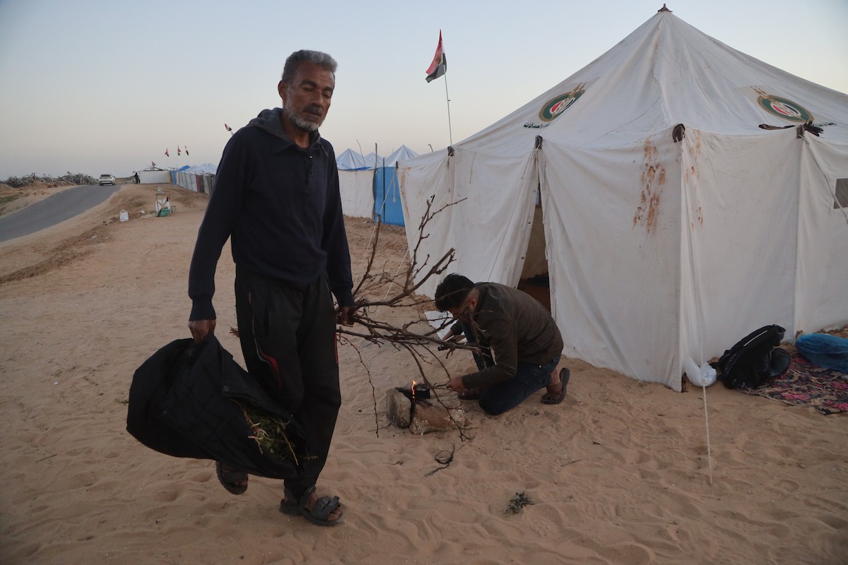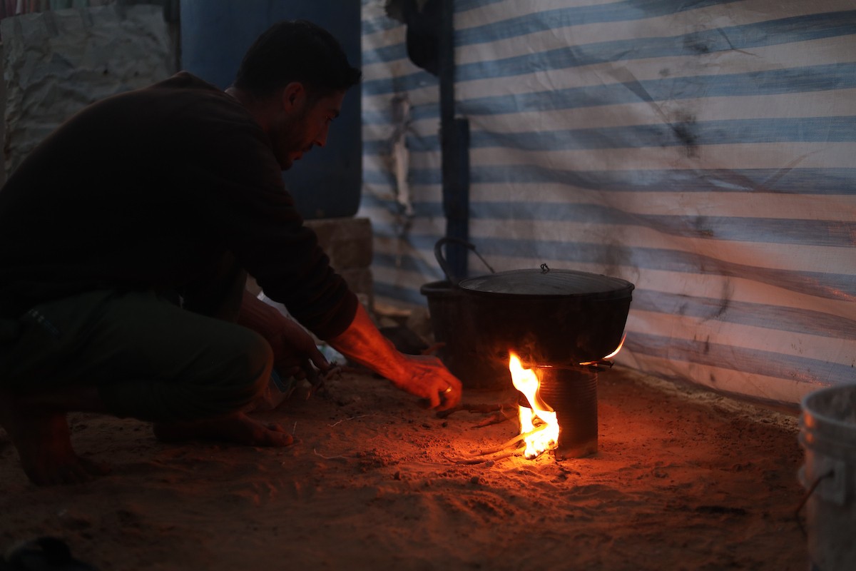وسط خيام النازحين في المخيم المصري بمنطقة نتساريم وسط قطاع غزة، يحاول السكان الحفاظ على تفاصيل حياتهم اليومية رغم الظروف القاسية والنقص الحاد في الضروريات الأساسية كالمأوى والغذاء والماء النظيف. وسط قطاع غزة، ١٢ فبراير ٢٠٢٦. تصوير: محمد الأسود