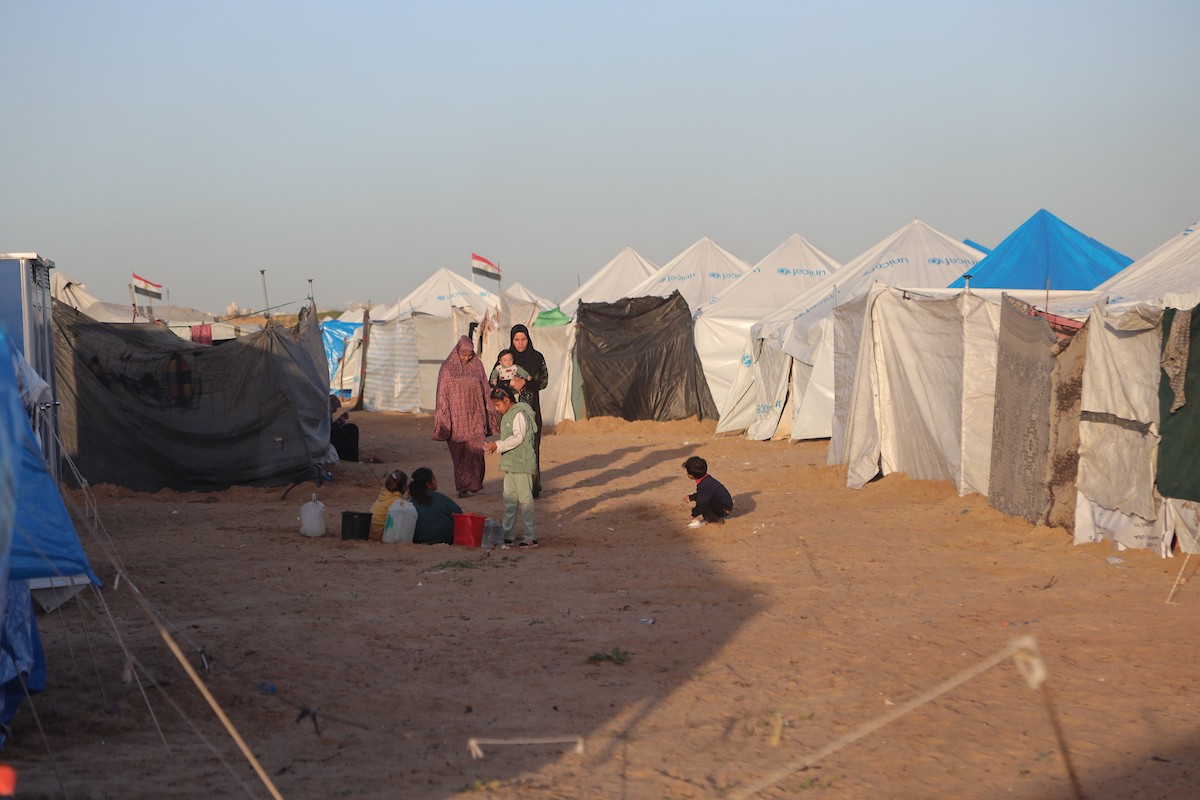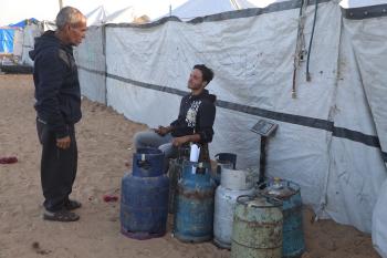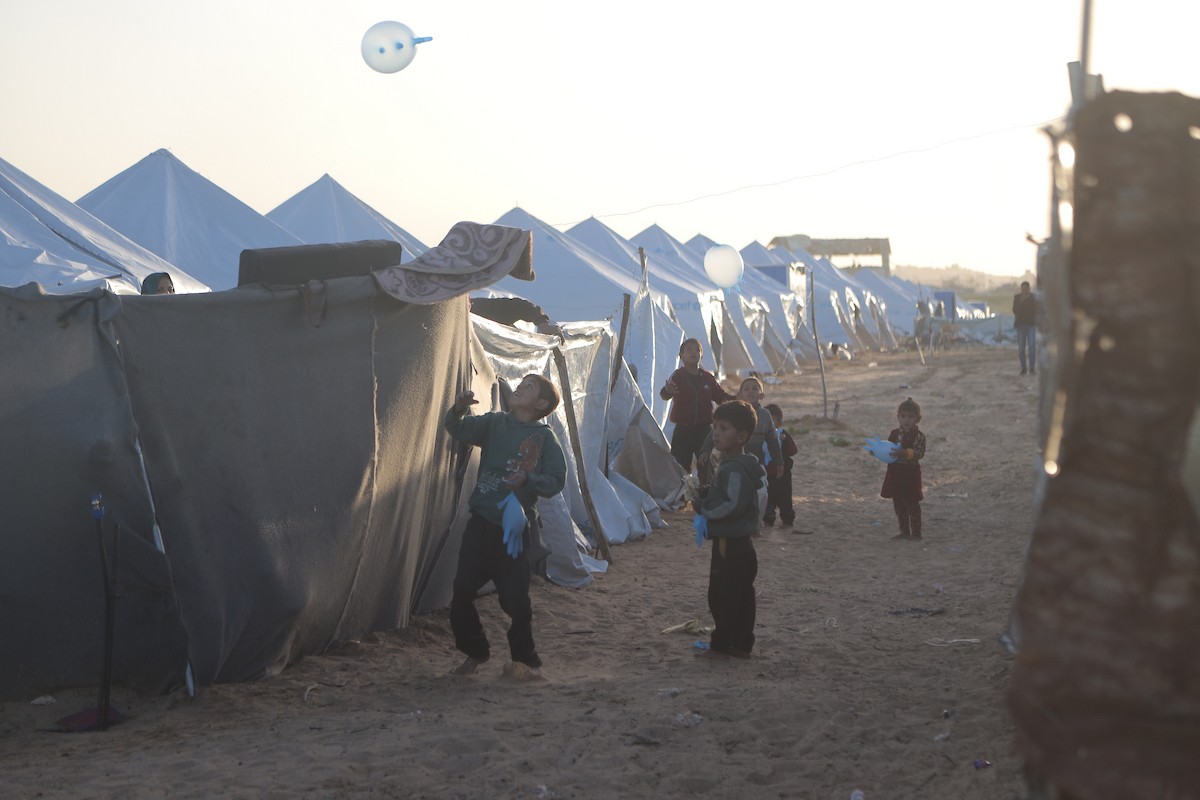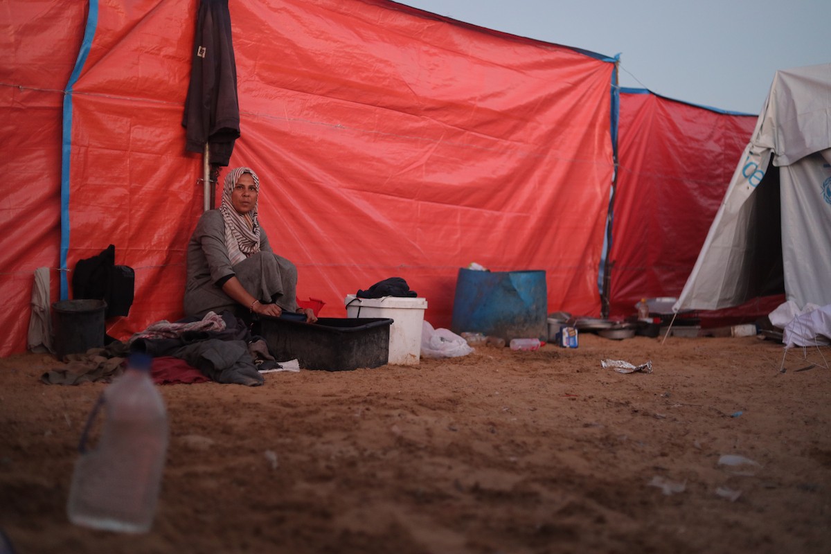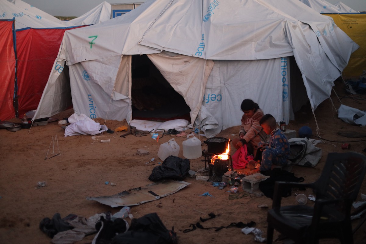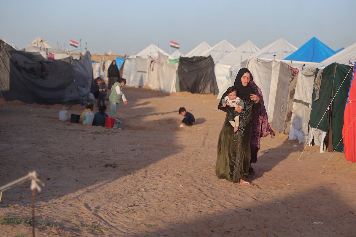 وسط خيام النازحين في المخيم المصري بمنطقة نتساريم وسط قطاع غزة، يحاول السكان الحفاظ على تفاصيل حياتهم اليومية رغم الظروف القاسية والنقص الحاد في الضروريات الأساسية كالمأوى والغذاء والماء النظيف. وسط قطاع غزة، ١٢ فبراير ٢٠٢٦. تصوير: محمد الأسود
