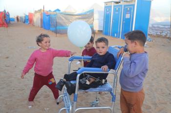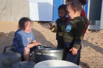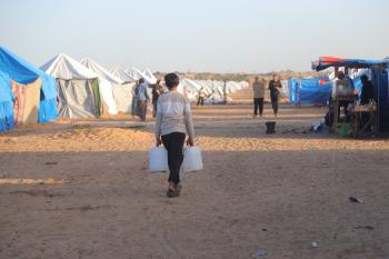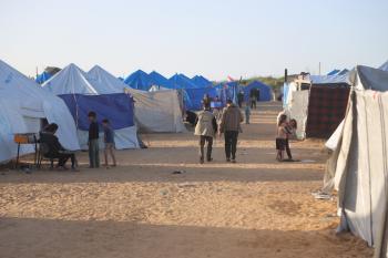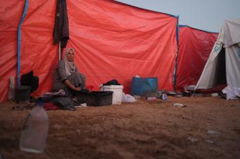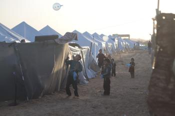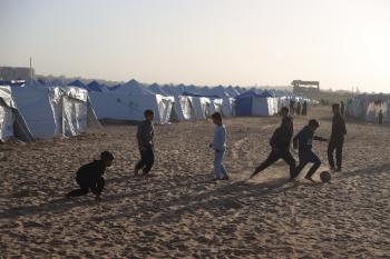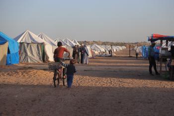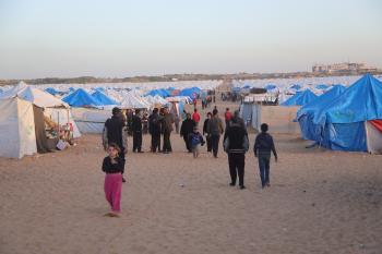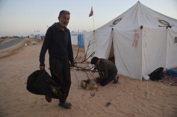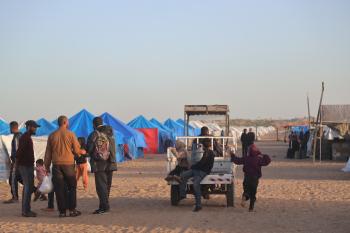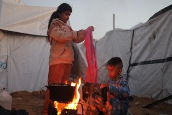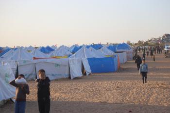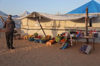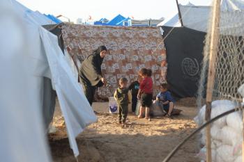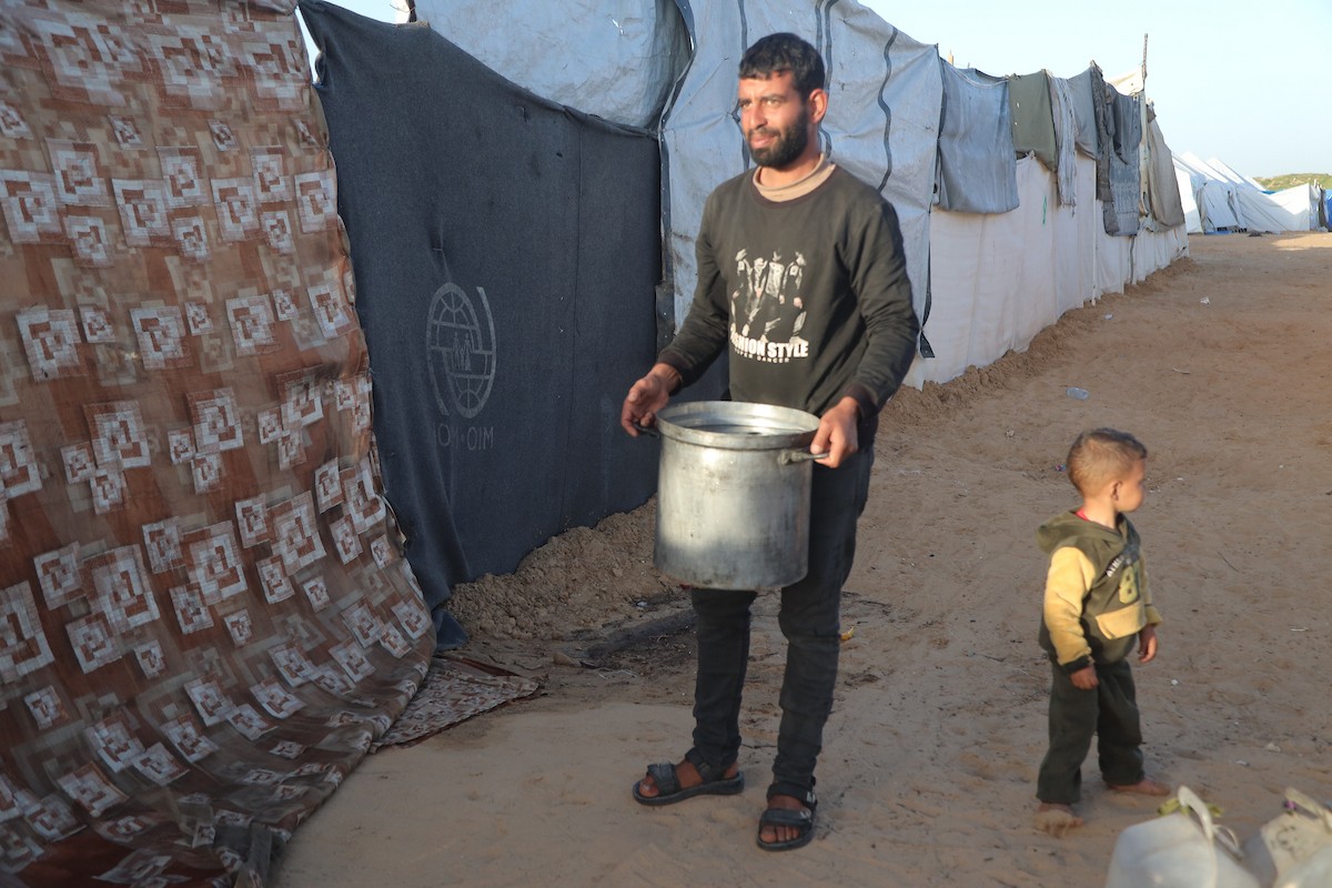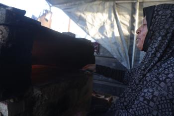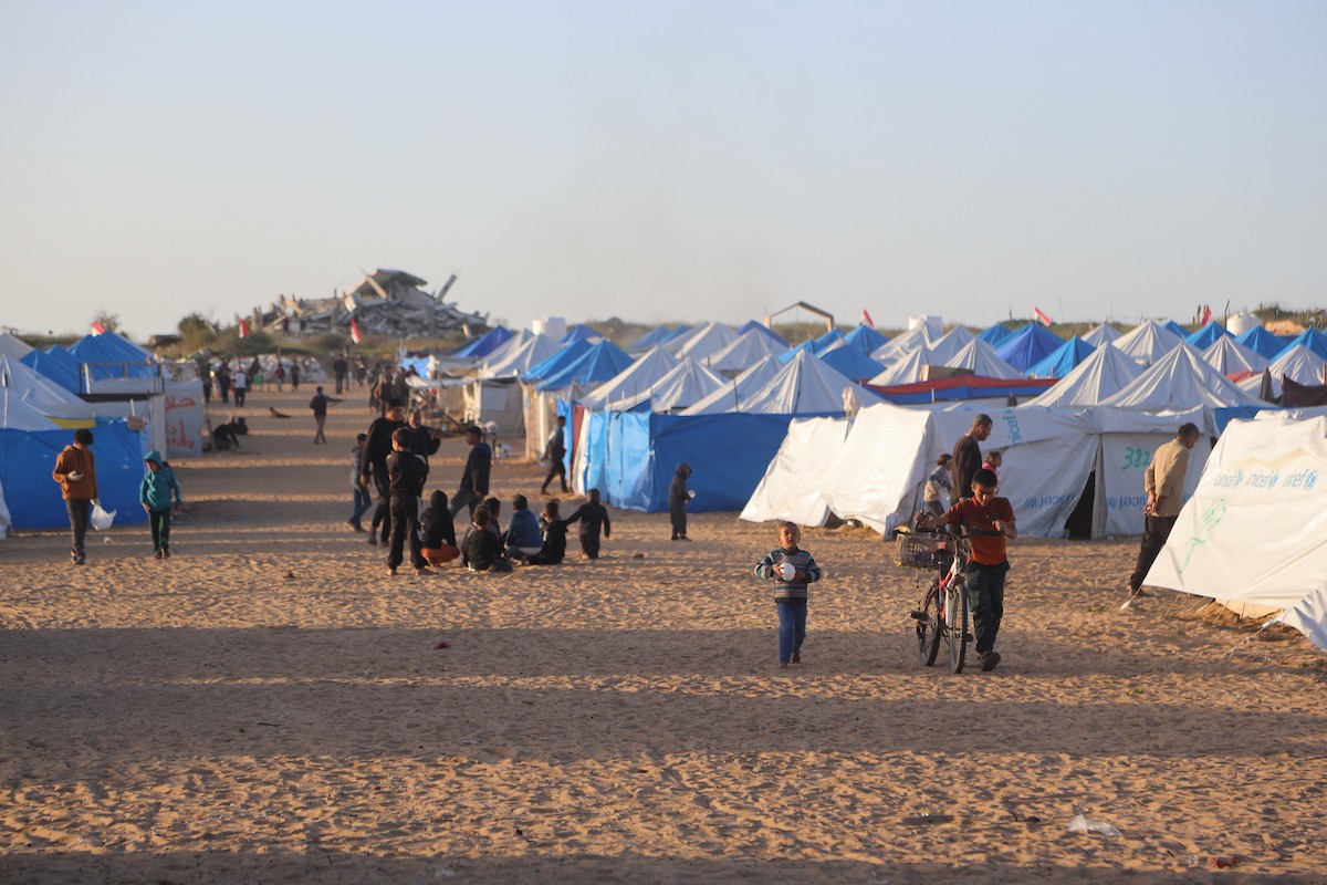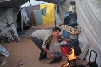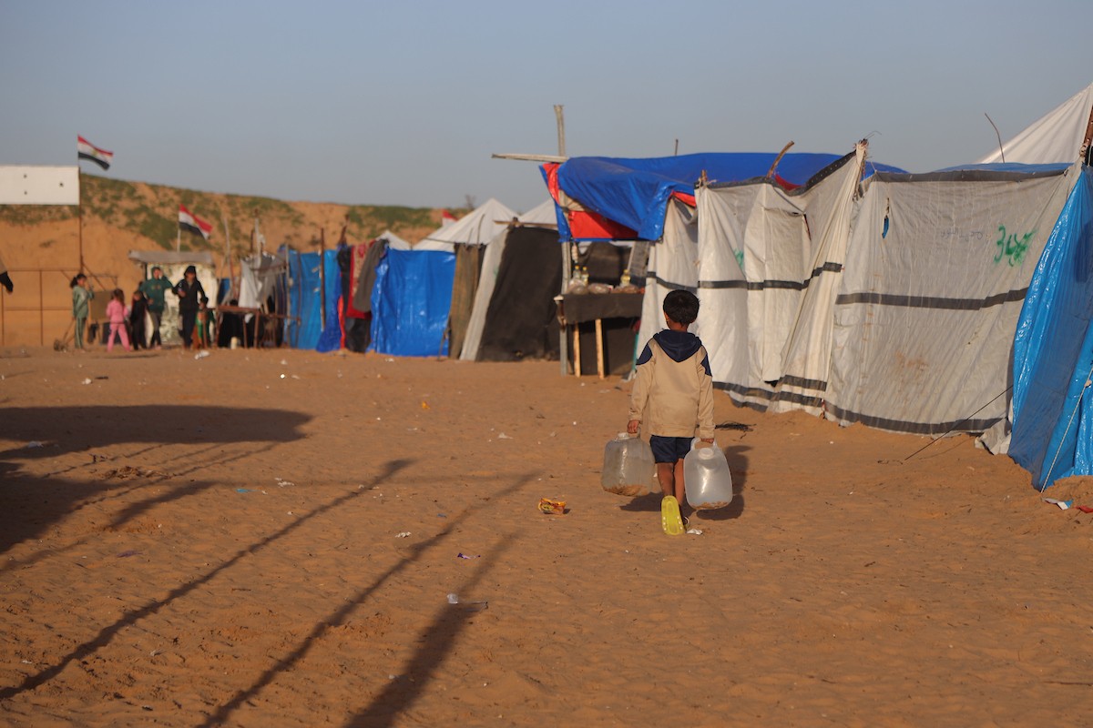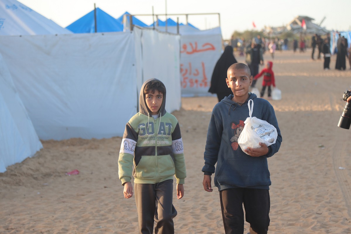 وسط خيام النازحين في المخيم المصري بمنطقة نتساريم وسط قطاع غزة، يحاول السكان الحفاظ على تفاصيل حياتهم اليومية رغم الظروف القاسية والنقص الحاد في الضروريات الأساسية كالمأوى والغذاء والماء النظيف. وسط قطاع غزة، ١٢ فبراير ٢٠٢٦. تصوير: محمد الأسود