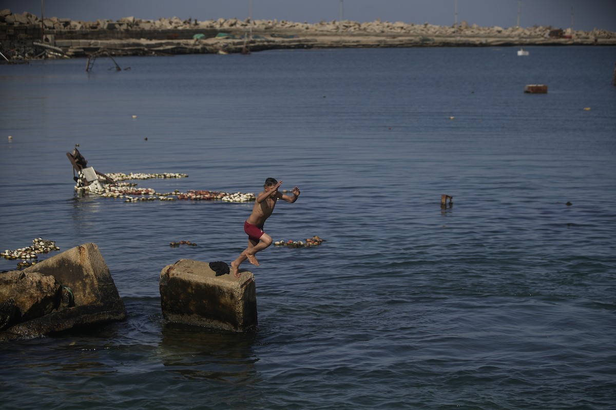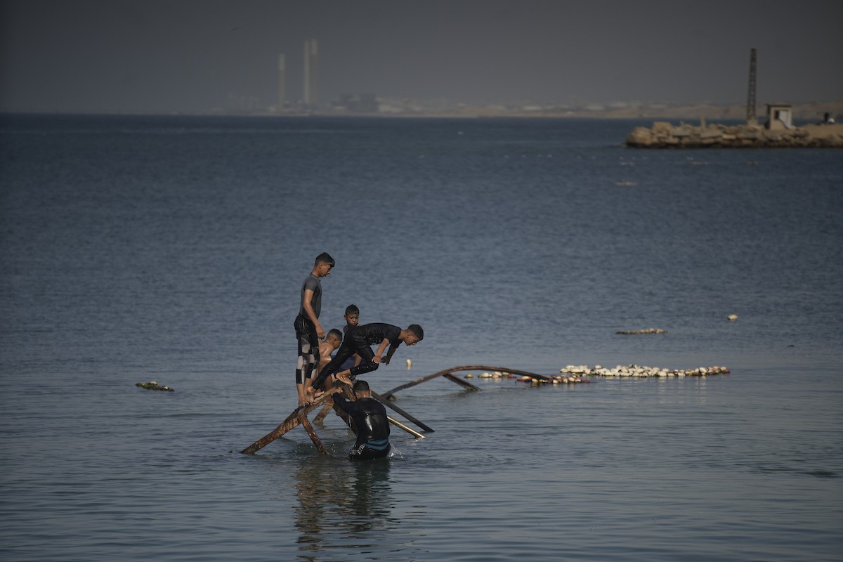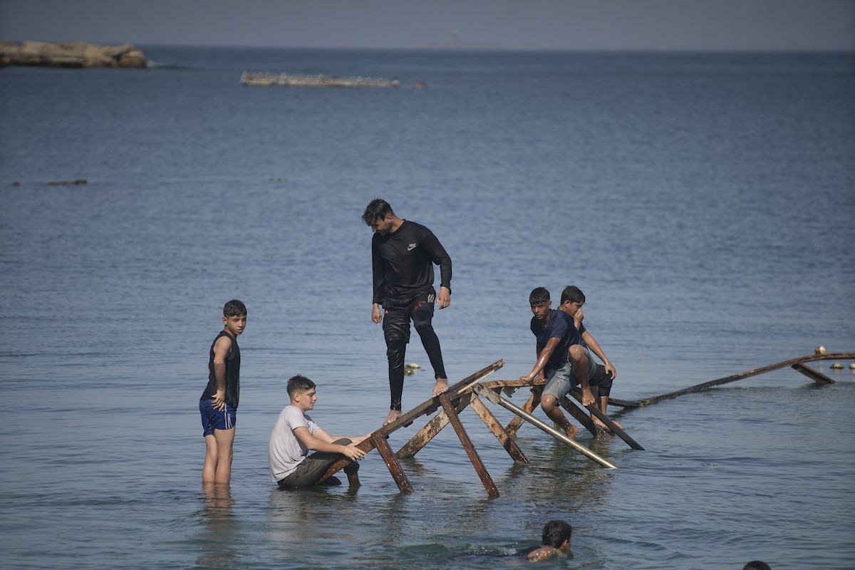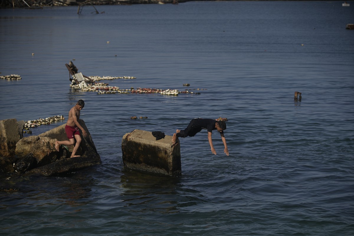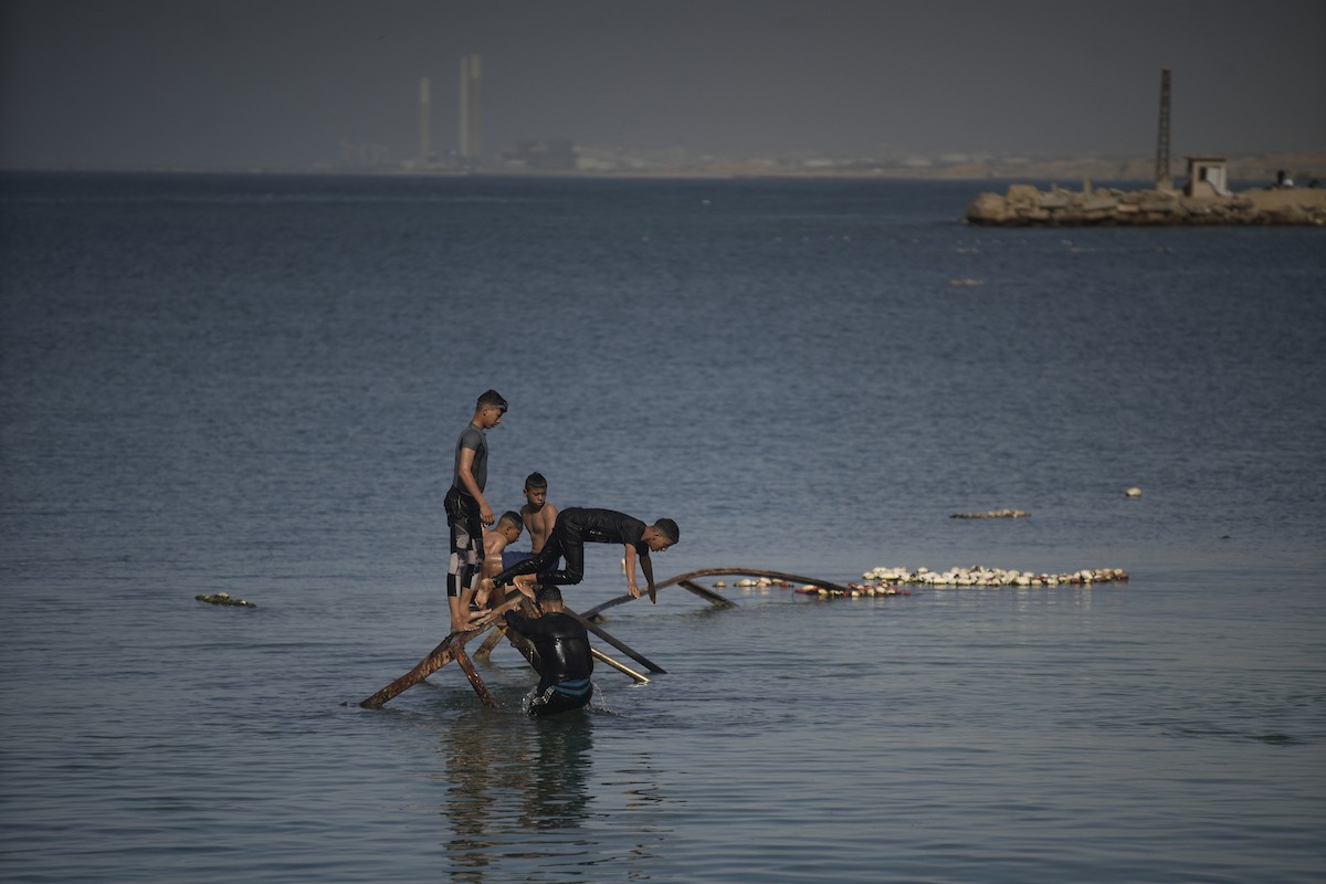 يسبح أطفال قرب ميناء غزة المدمر، في مشهد يعكس تمسكهم بلحظات الفرح رغم الدمار المحيط بهم. يُعدّ البحر في غزة المتنفس الوحيد لسكانها الذين يواجهون آثار الحرب والنزوح، والذين يعيشون في خيام تفتقر لأبسط مقومات الحياة، ١٢ فبراير ٢٠٢٦. تصوير: عمر أشتوي
