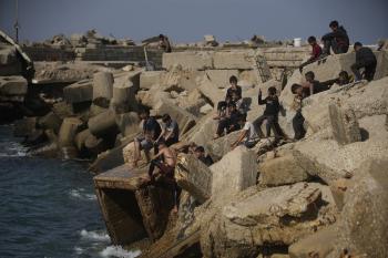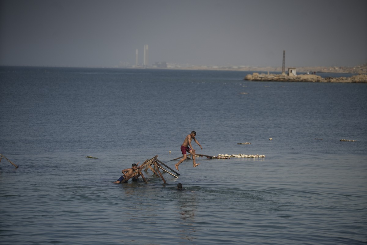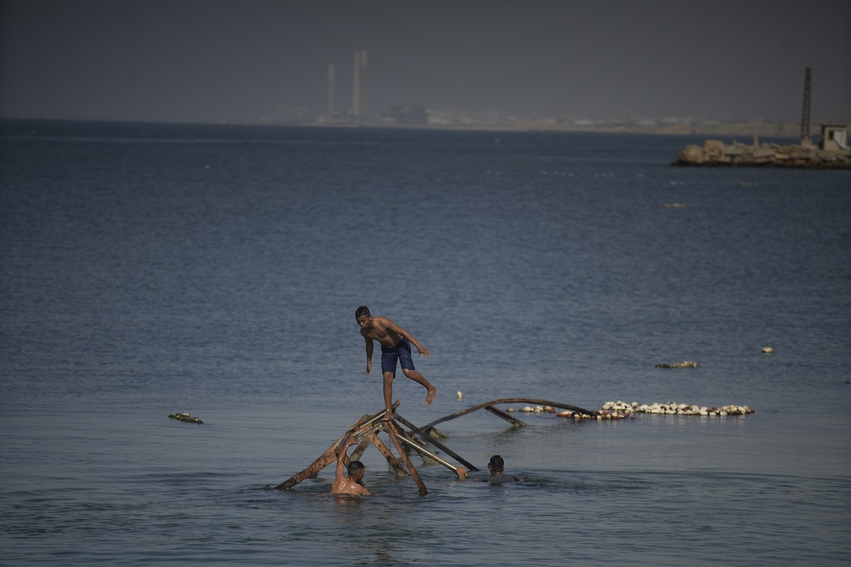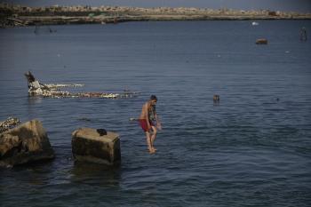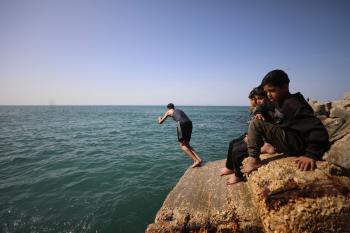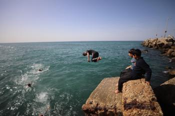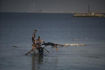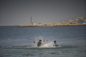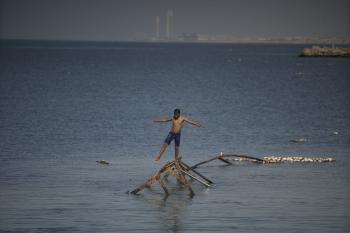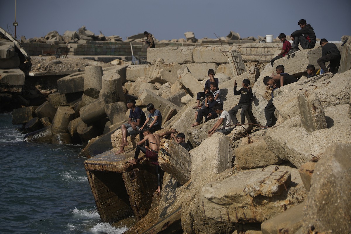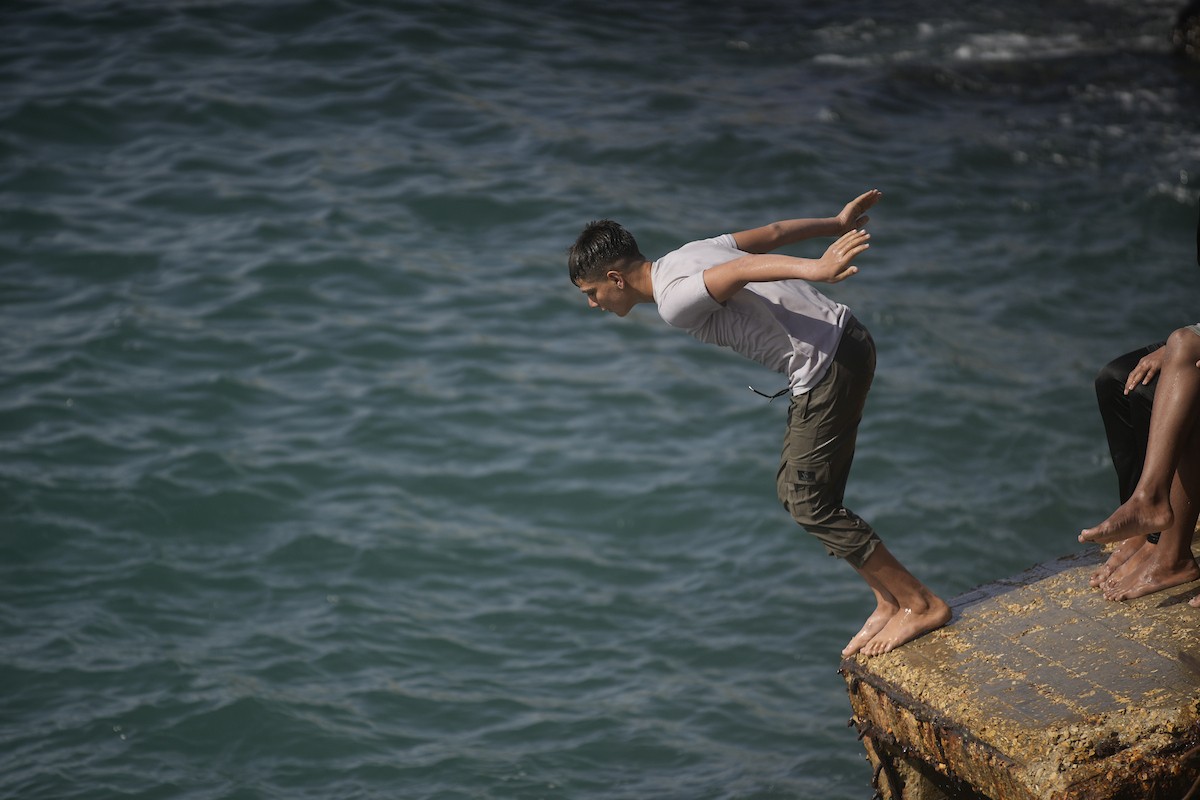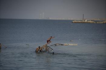 يسبح أطفال قرب ميناء غزة المدمر، في مشهد يعكس تمسكهم بلحظات الفرح رغم الدمار المحيط بهم. يُعدّ البحر في غزة المتنفس الوحيد لسكانها الذين يواجهون آثار الحرب والنزوح، والذين يعيشون في خيام تفتقر لأبسط مقومات الحياة، ١٢ فبراير ٢٠٢٦. تصوير: عمر أشتوي