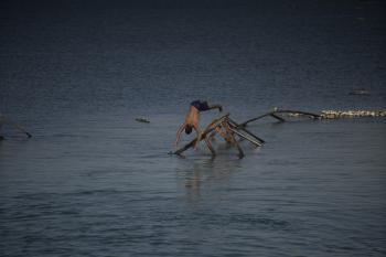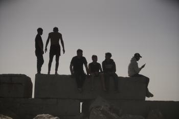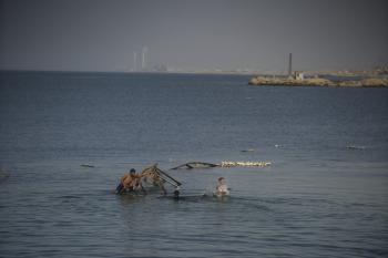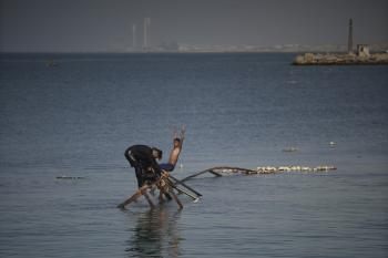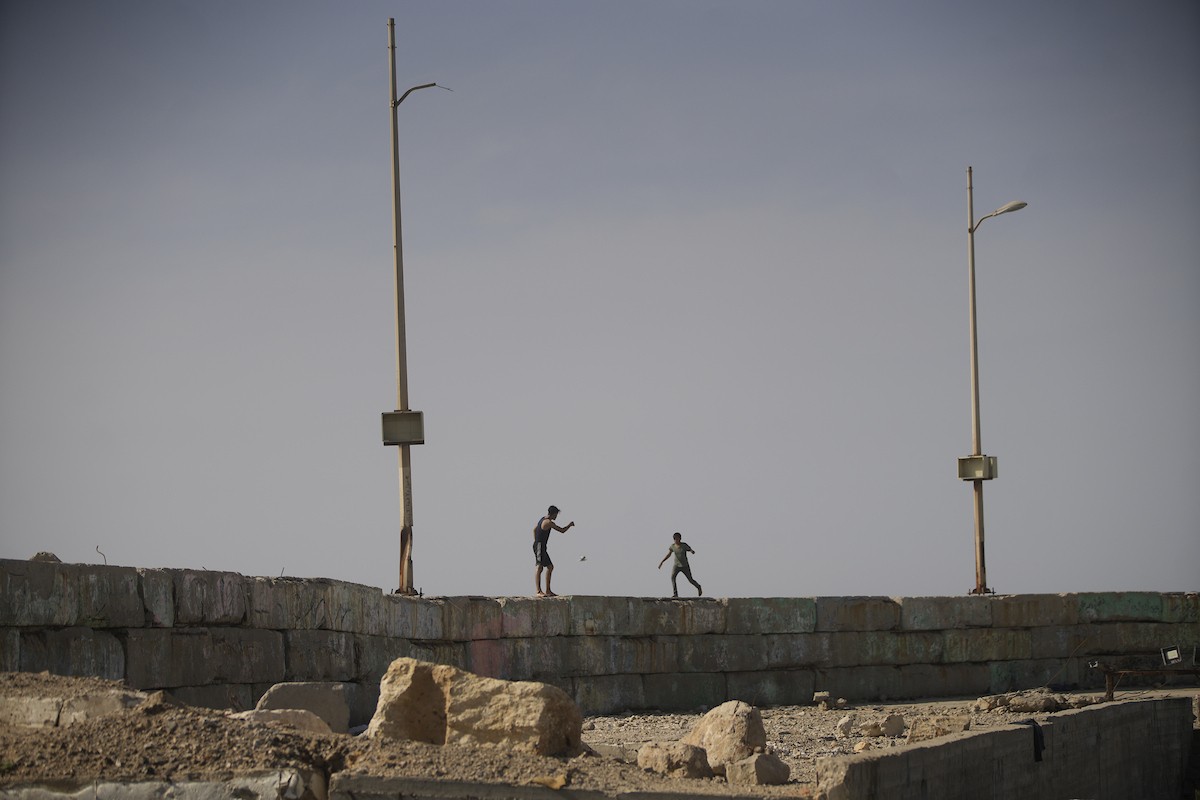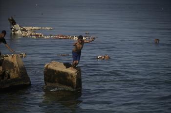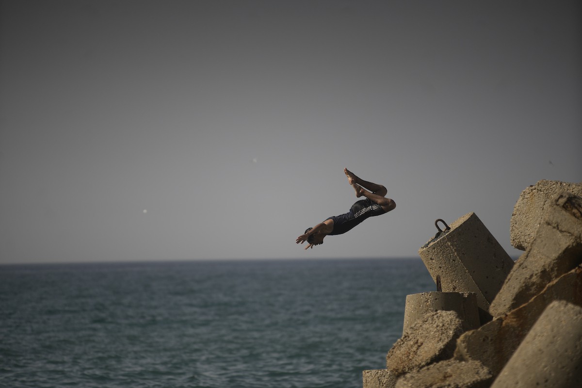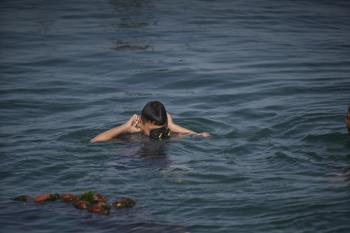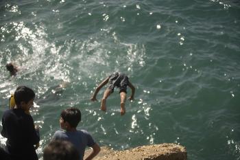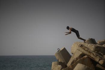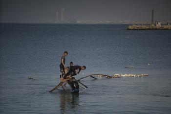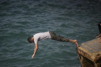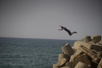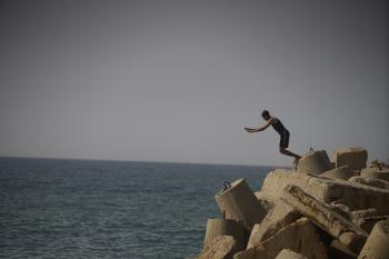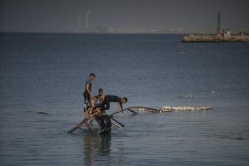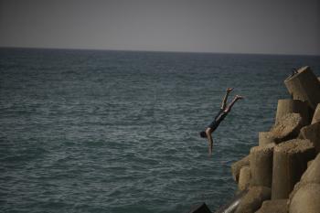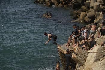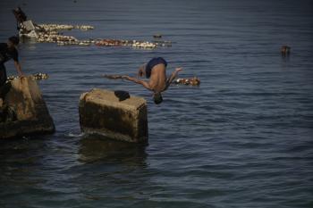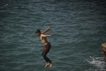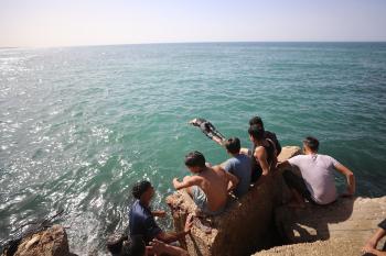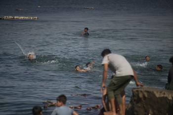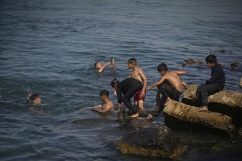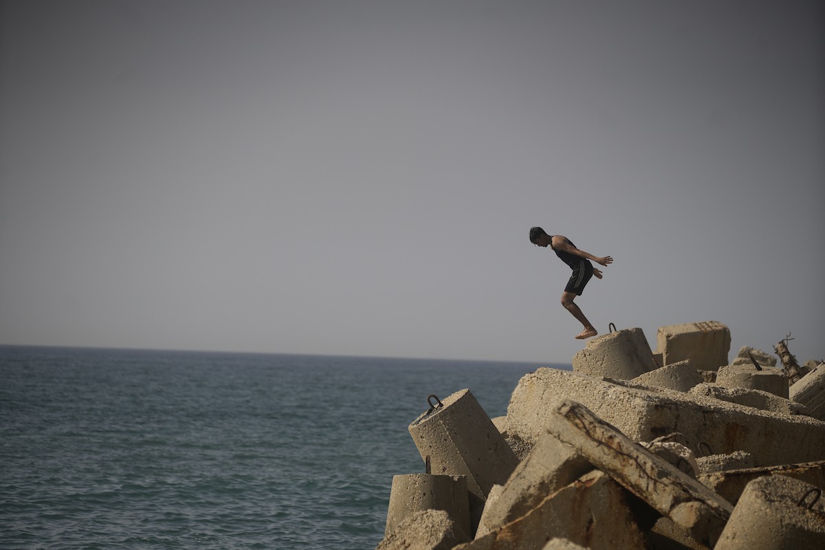 يسبح أطفال قرب ميناء غزة المدمر، في مشهد يعكس تمسكهم بلحظات الفرح رغم الدمار المحيط بهم. يُعدّ البحر في غزة المتنفس الوحيد لسكانها الذين يواجهون آثار الحرب والنزوح، والذين يعيشون في خيام تفتقر لأبسط مقومات الحياة، ١٢ فبراير ٢٠٢٦. تصوير: عمر أشتوي