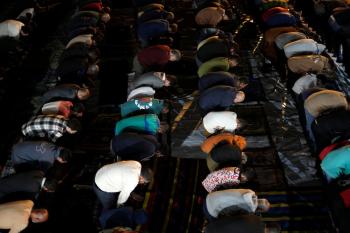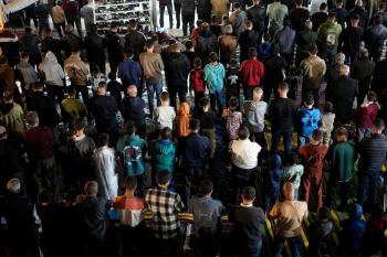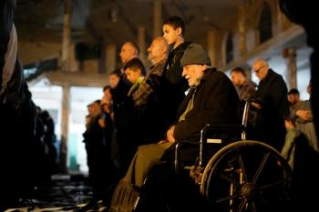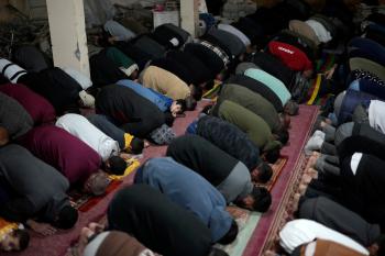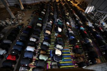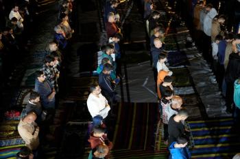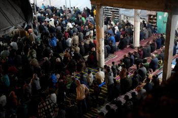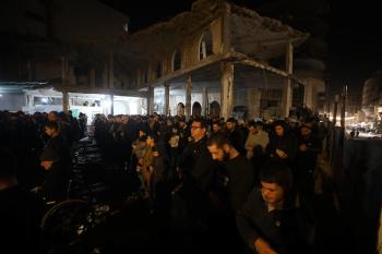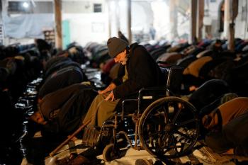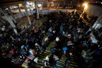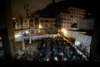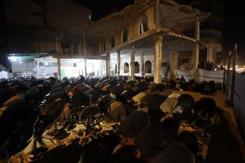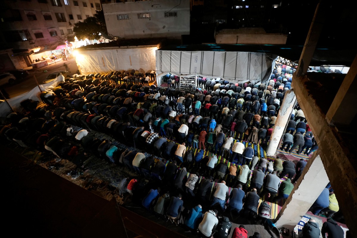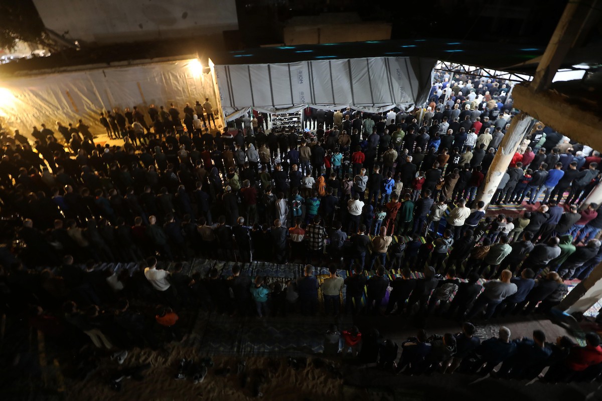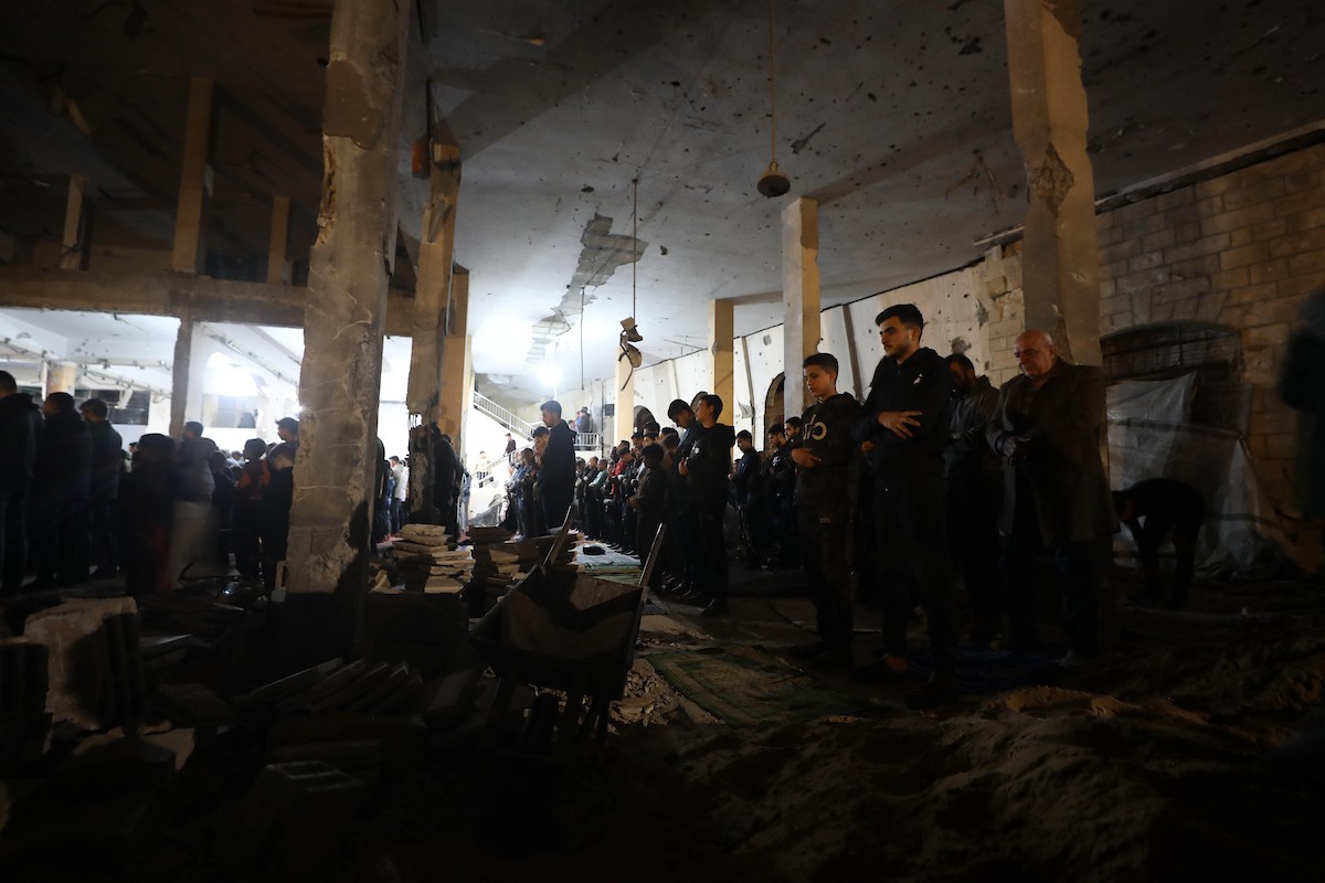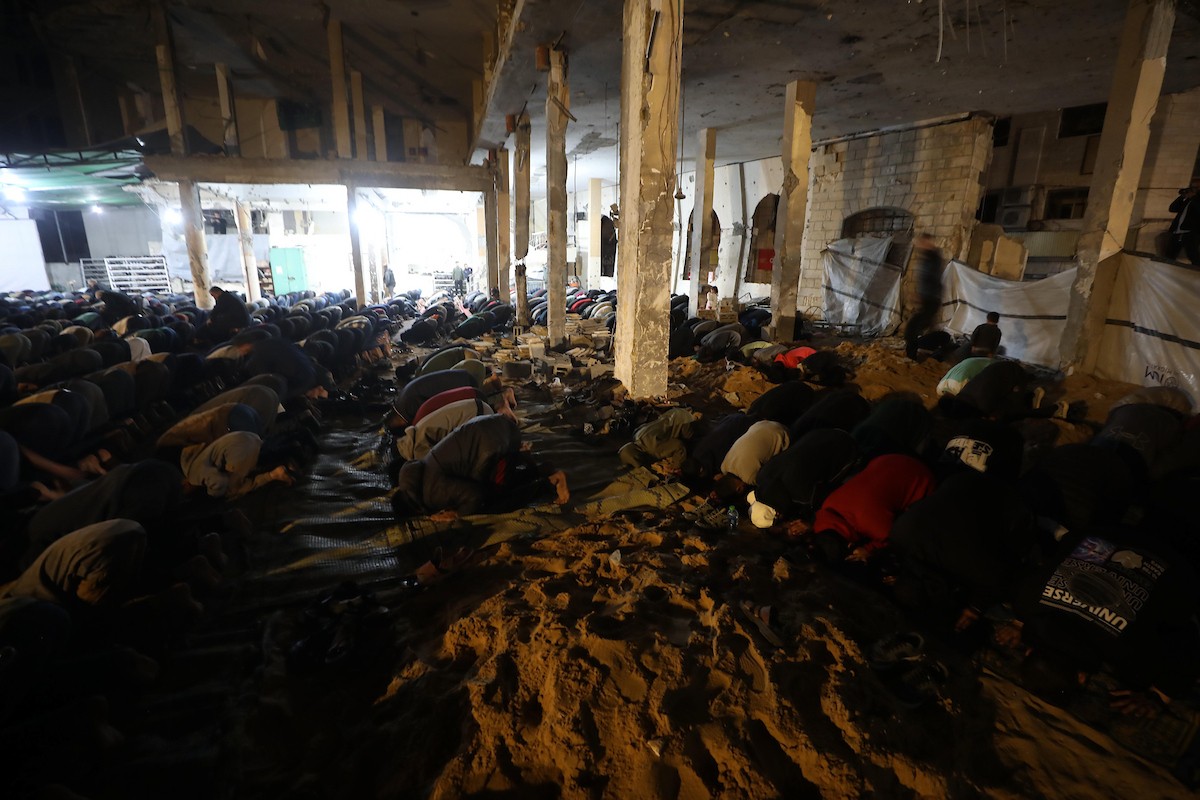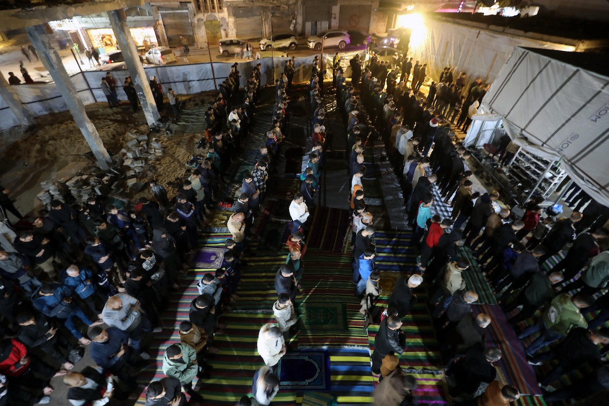 فلسطينيون يؤدون صلاة التراويح في أول ليلة من شهر رمضان على أنقاض مسجد الكنز المدمر في مدينة غزة، في 17 فبراير/شباط 2026. وكان مفتي القدس والأراضي الفلسطينية قد أعلن أن يوم الأربعاء 18 فبراير/شباط 2026 هو أول أيام رمضان. (صورة: عمر أشتوي)
