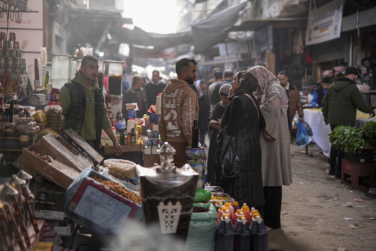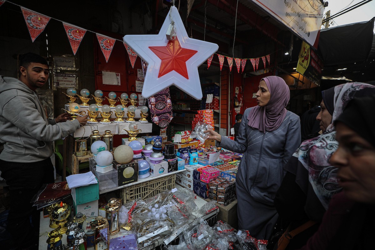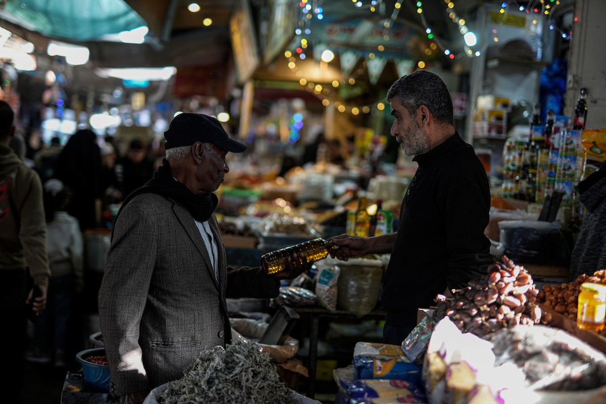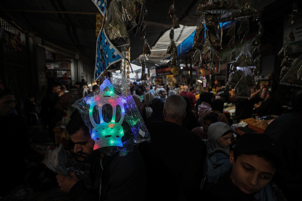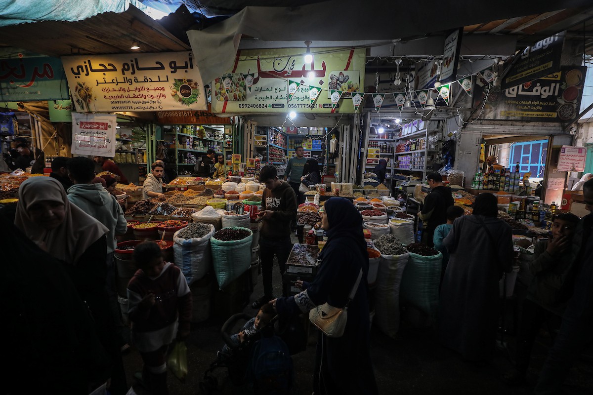 يتسوق الفلسطينيون في أول ليلة من شهر رمضان المبارك في سوق الزاوية، الواقع في قلب مدينة غزة والذي تضرر بشدة جراء الحرب الإسرائيلية. يعرض الباعة بضائعهم على أكشاك مزينة بالفوانيس والأضواء وأطعمة رمضان. مدينة غزة، 17 فبراير/شباط 2026. تصوير: عمر أشتوي