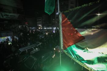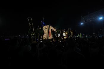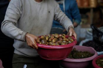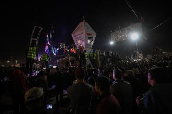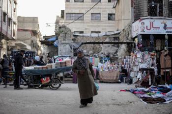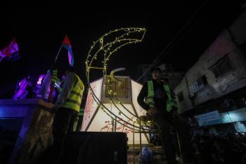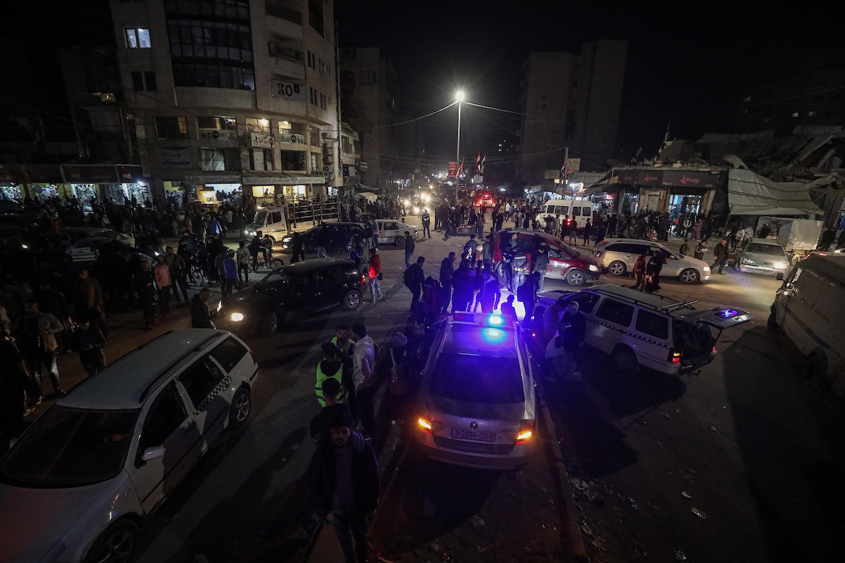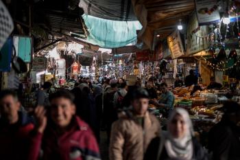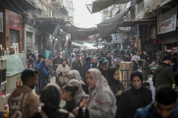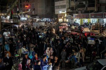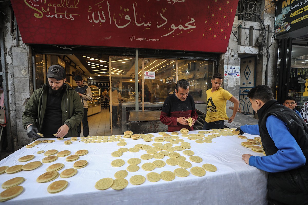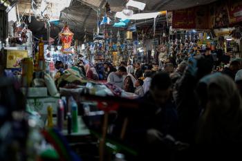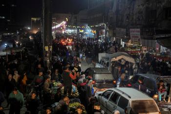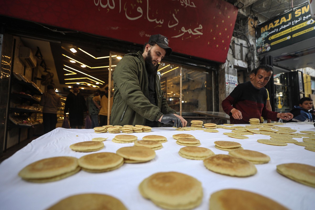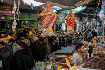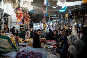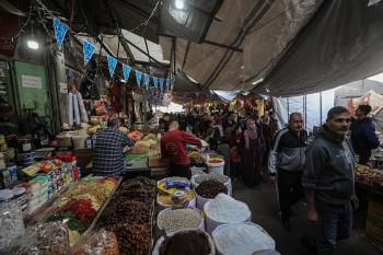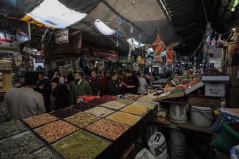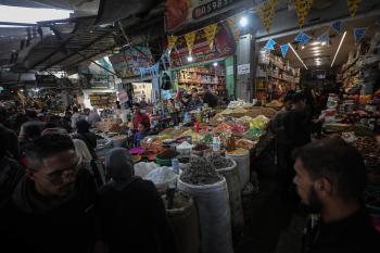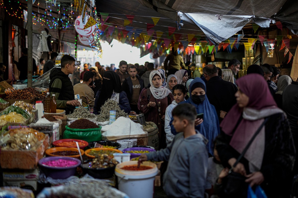 يتسوق الفلسطينيون في أول ليلة من شهر رمضان المبارك في سوق الزاوية، الواقع في قلب مدينة غزة والذي تضرر بشدة جراء الحرب الإسرائيلية. يعرض الباعة بضائعهم على أكشاك مزينة بالفوانيس والأضواء وأطعمة رمضان. مدينة غزة، 17 فبراير/شباط 2026. تصوير: عمر أشتوي