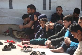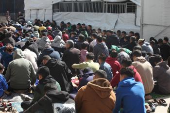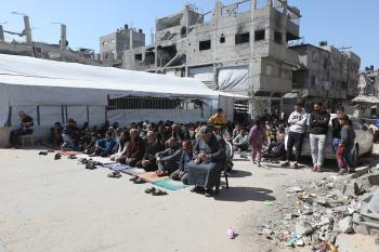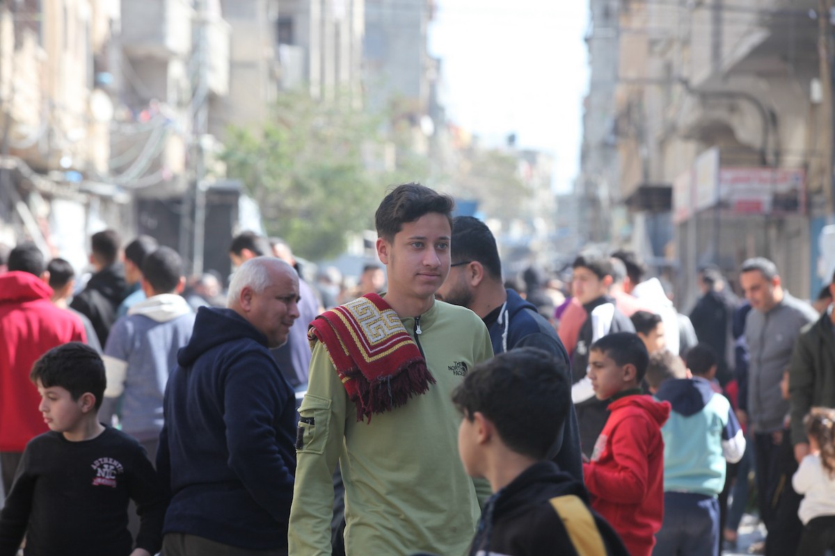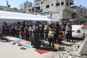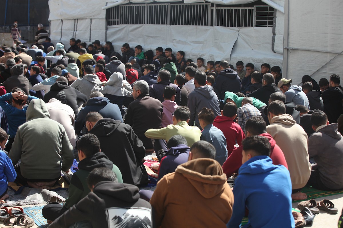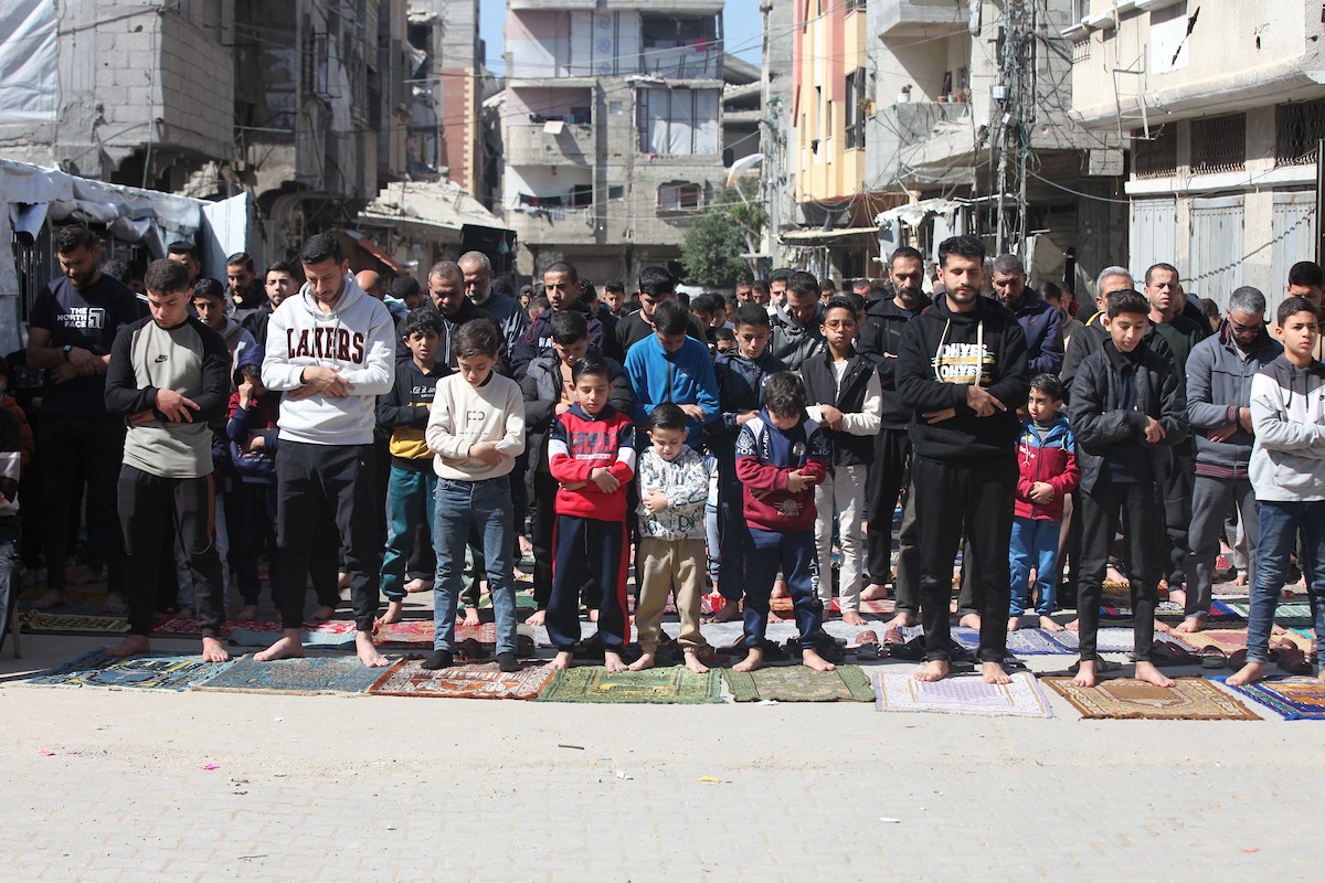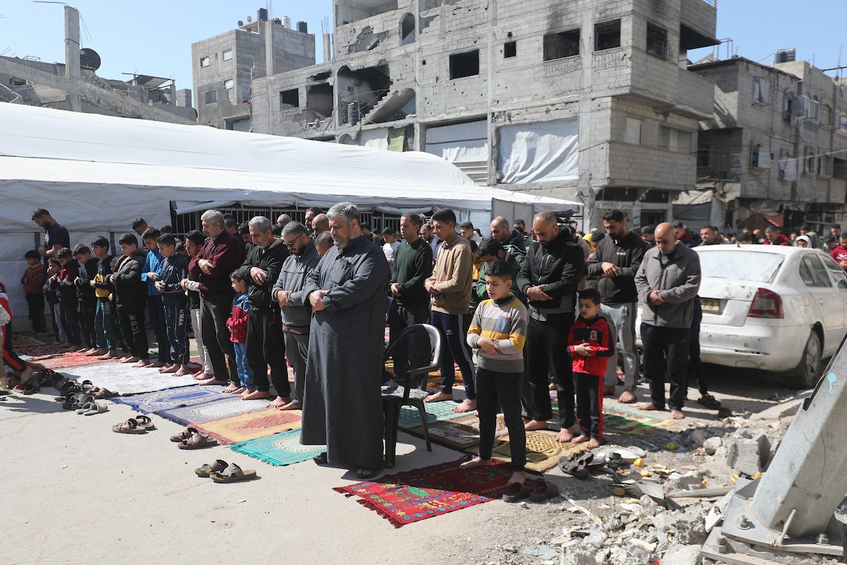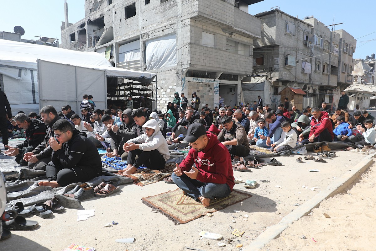 يؤدي النازحون أول صلاة جمعة في رمضان بجوار أنقاض مسجد الصفا المدمر بالكامل في مخيم البريج للاجئين وسط قطاع غزة. 20 فبراير/شباط 2026. تصوير: معز صالحي