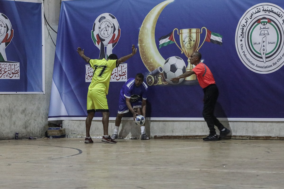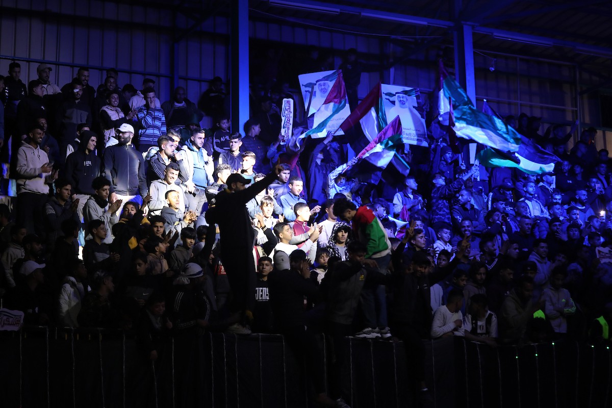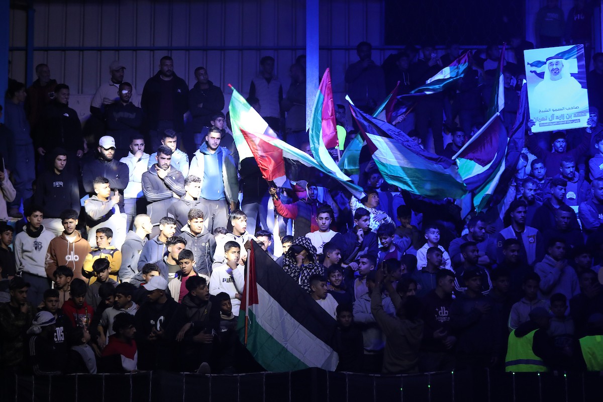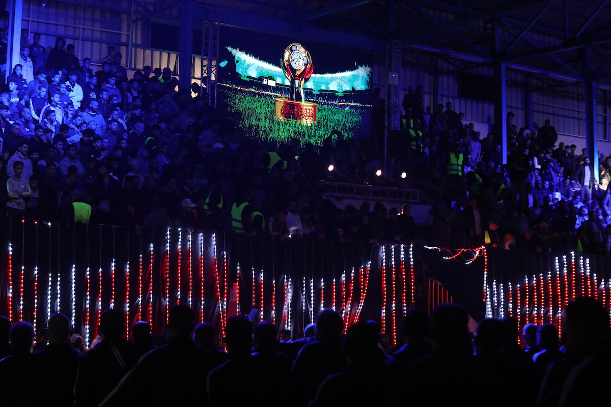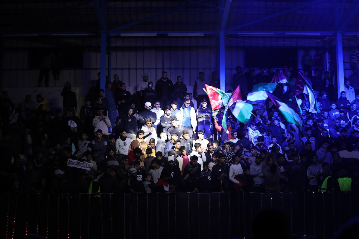 لاعبون فلسطينيون من فريقي النصيرات ورفح يتنافسون خلال مباراة كرة قدم على ملعب نادي خدمات النصيرات، ضمن بطولة غزة الرمضانية، بحضور حشد جماهيري كبير، في مخيم النصيرات بوسط قطاع غزة، بتاريخ 21 فبراير/شباط 2026. تصوير: معز صالحي / apaimages