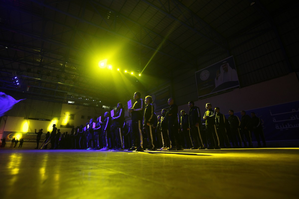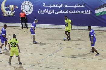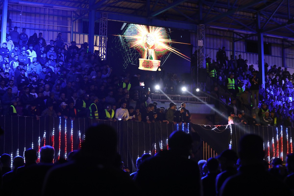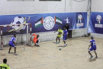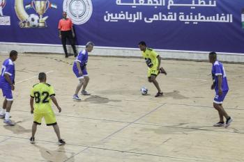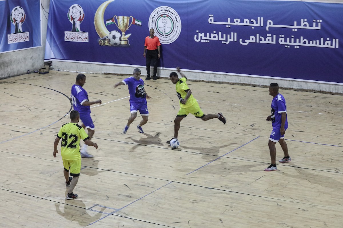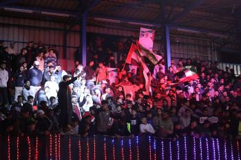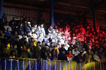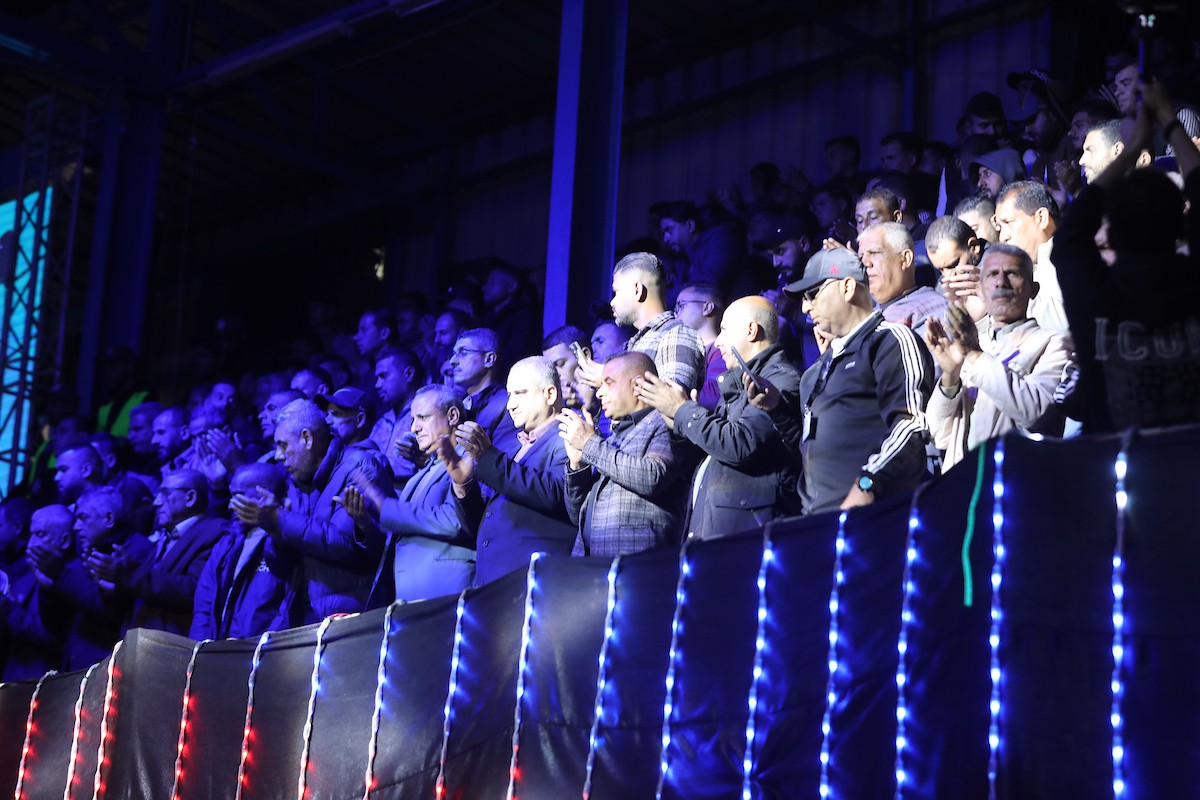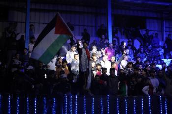 لاعبون فلسطينيون من فريقي النصيرات ورفح يتنافسون خلال مباراة كرة قدم على ملعب نادي خدمات النصيرات، ضمن بطولة غزة الرمضانية، بحضور حشد جماهيري كبير، في مخيم النصيرات بوسط قطاع غزة، بتاريخ 21 فبراير/شباط 2026. تصوير: معز صالحي / apaimages