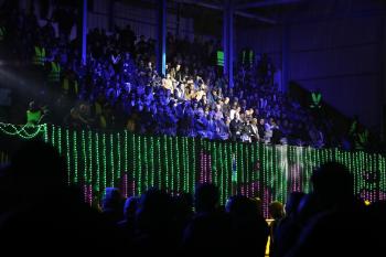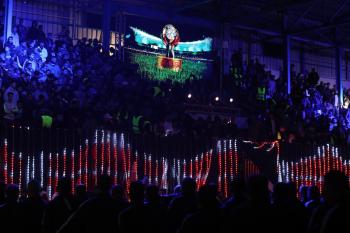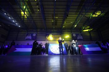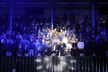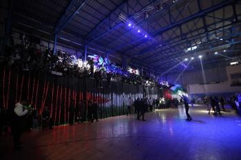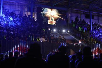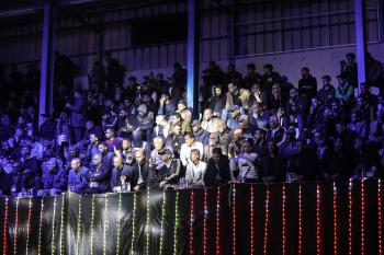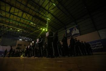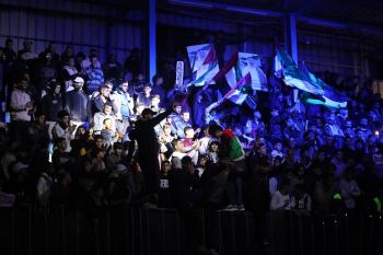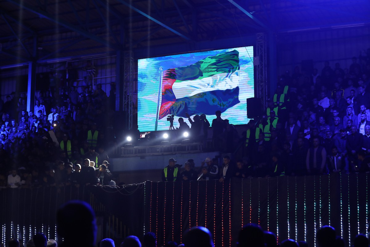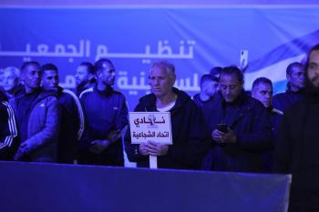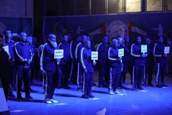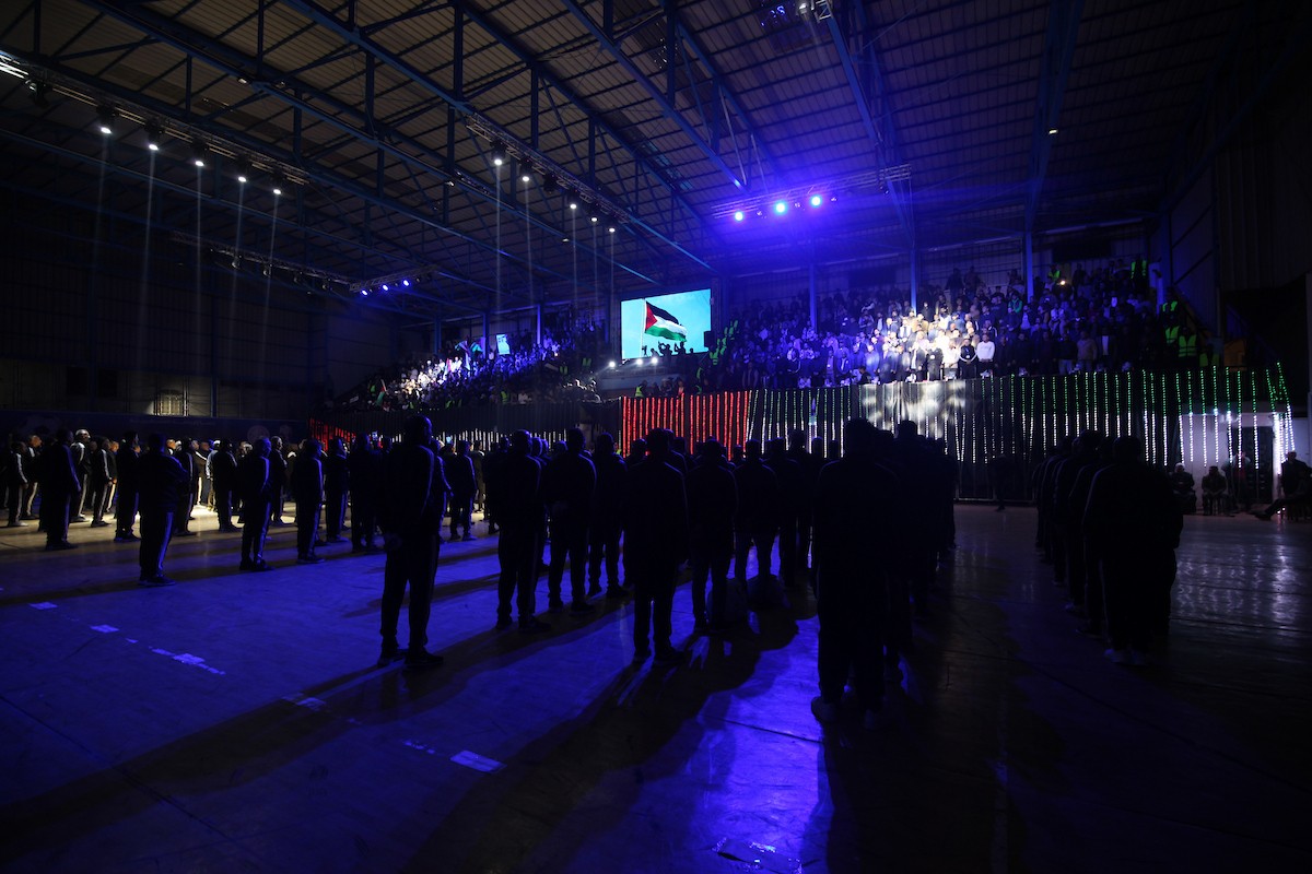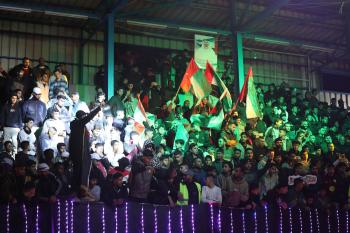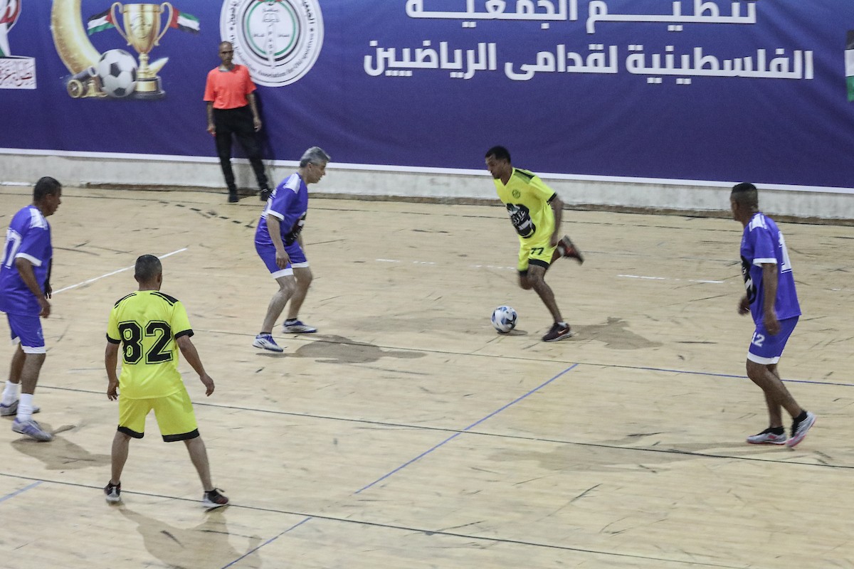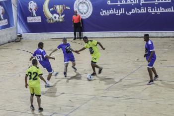 لاعبون فلسطينيون من فريقي النصيرات ورفح يتنافسون خلال مباراة كرة قدم على ملعب نادي خدمات النصيرات، ضمن بطولة غزة الرمضانية، بحضور حشد جماهيري كبير، في مخيم النصيرات بوسط قطاع غزة، بتاريخ 21 فبراير/شباط 2026. تصوير: معز صالحي / apaimages