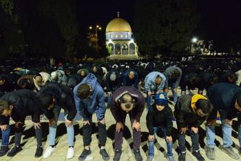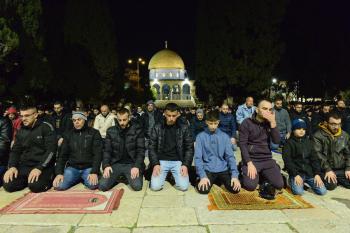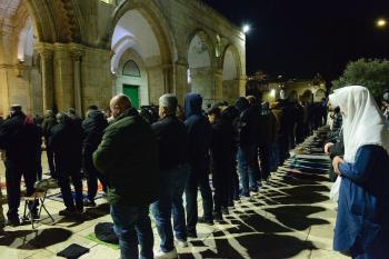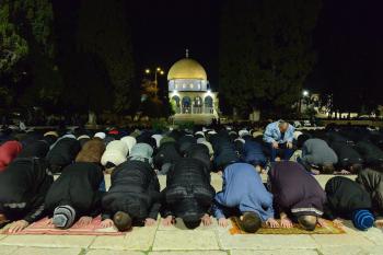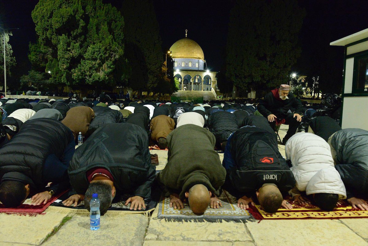يؤدي الفلسطينيون صلاتي العشاء والتراويح في ساحات المسجد الأقصى في اليوم الخامس من رمضان، القدس، 22 فبراير 2026. صورة من دائرة الأوقاف الإسلامية في القدس.