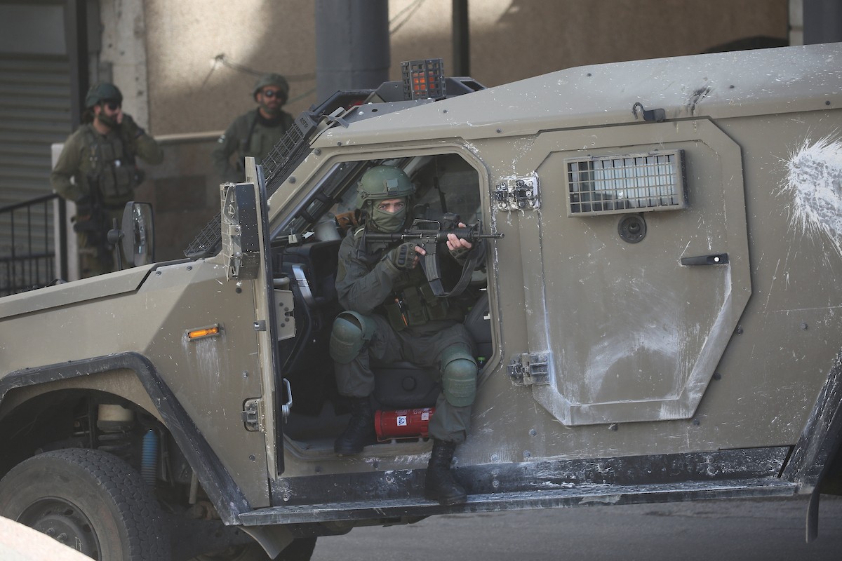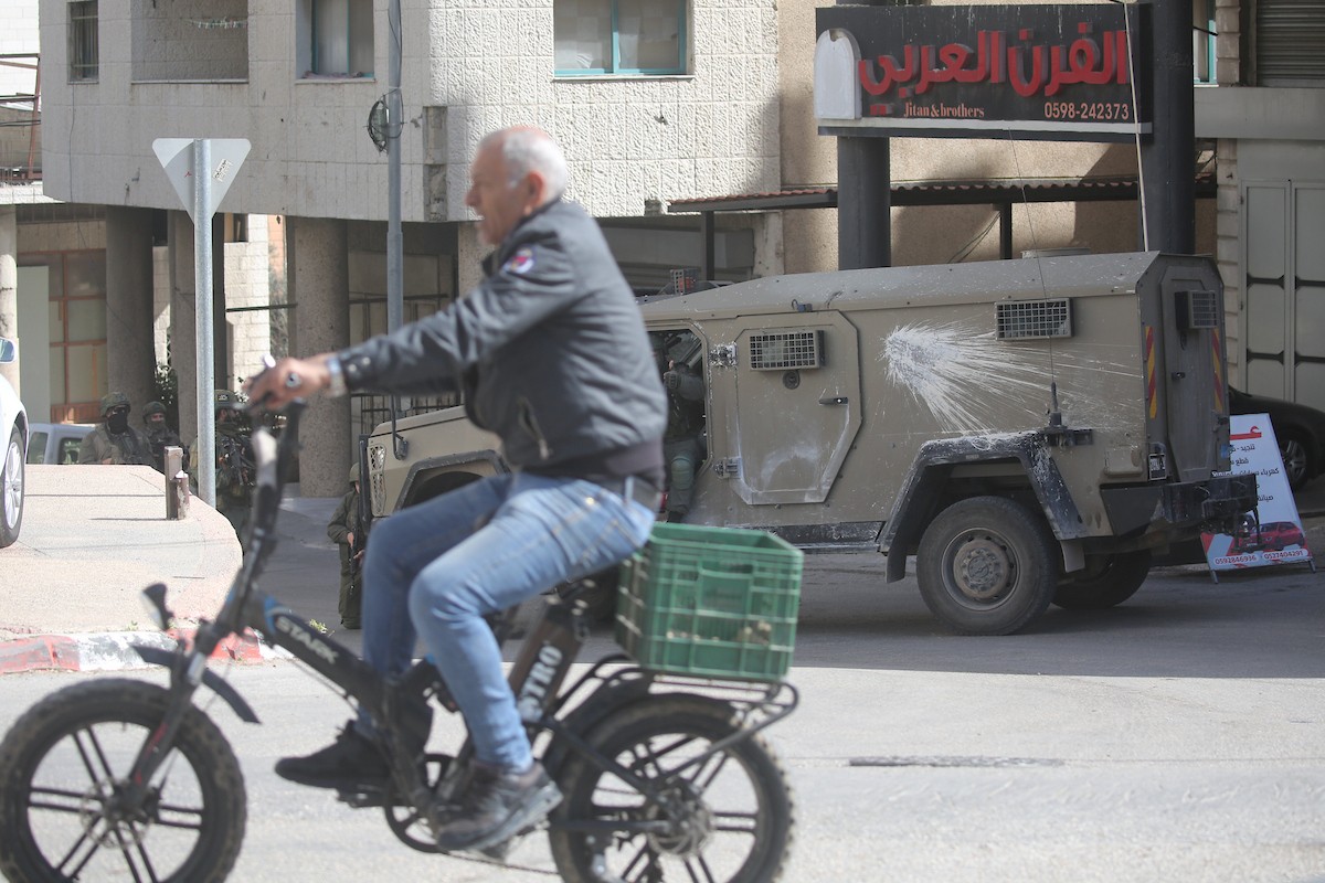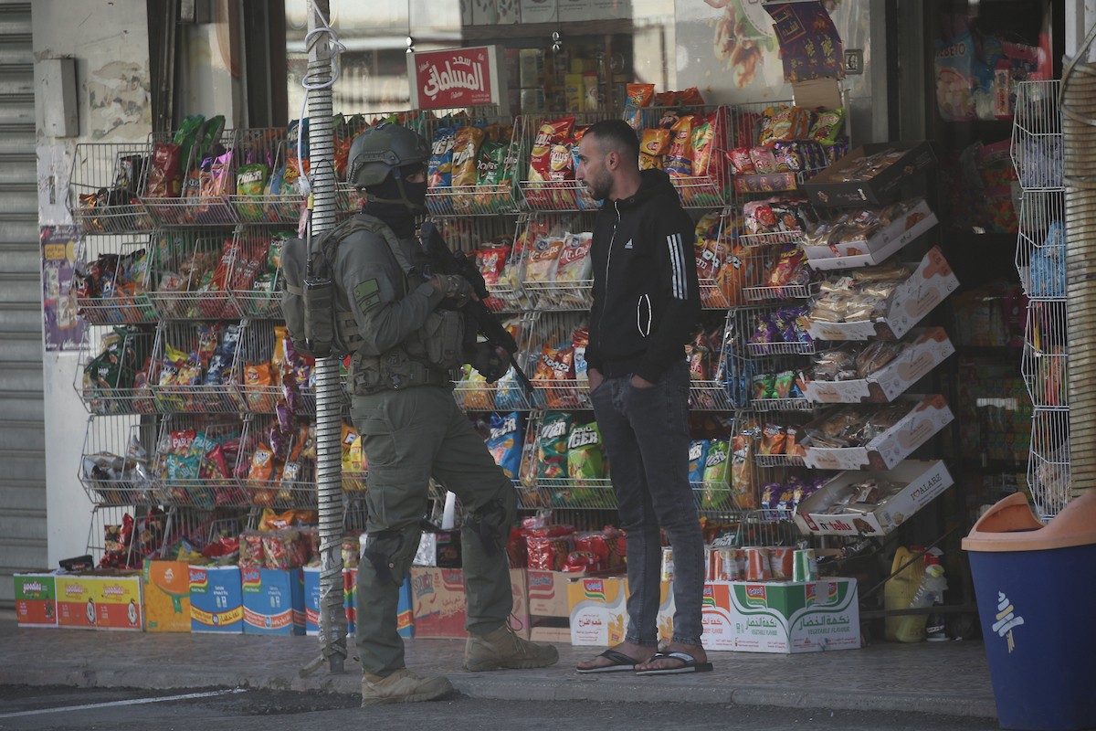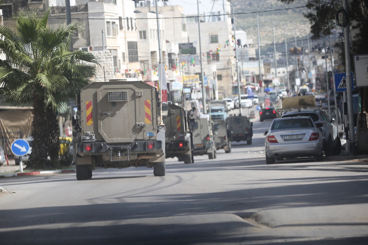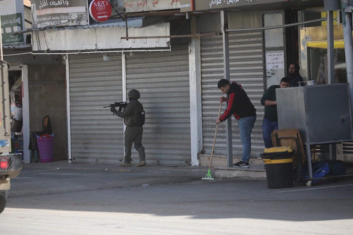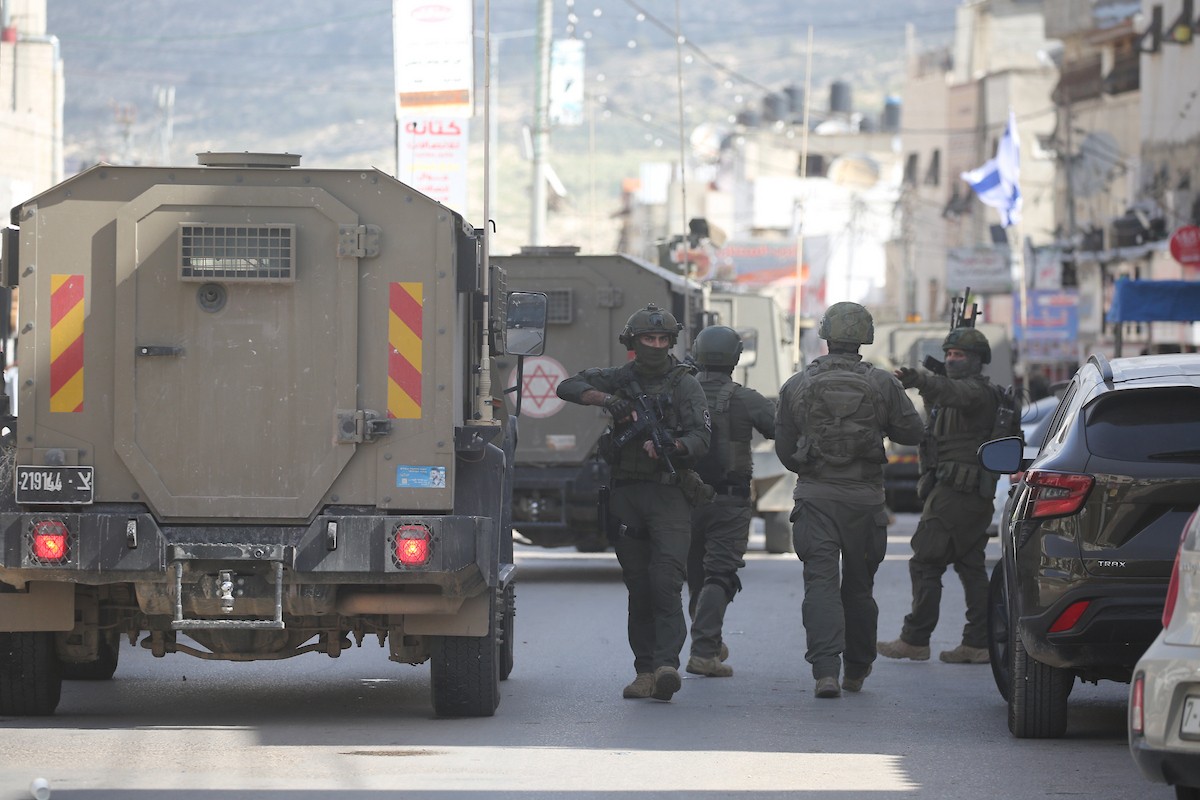 نفّذت قوات الجيش الإسرائيلي مداهمات ودوريات في شوارع مخيم عسكر للاجئين، شرق نابلس في الضفة الغربية، خلال عملية عسكرية داهمت خلالها متاجر واعتقلت عدداً من الشبان الفلسطينيين. ٢٢ فبراير/شباط ٢٠٢٦. صورة: محمد ناصر