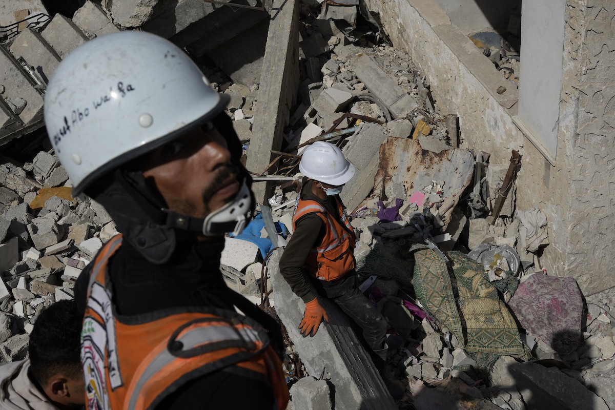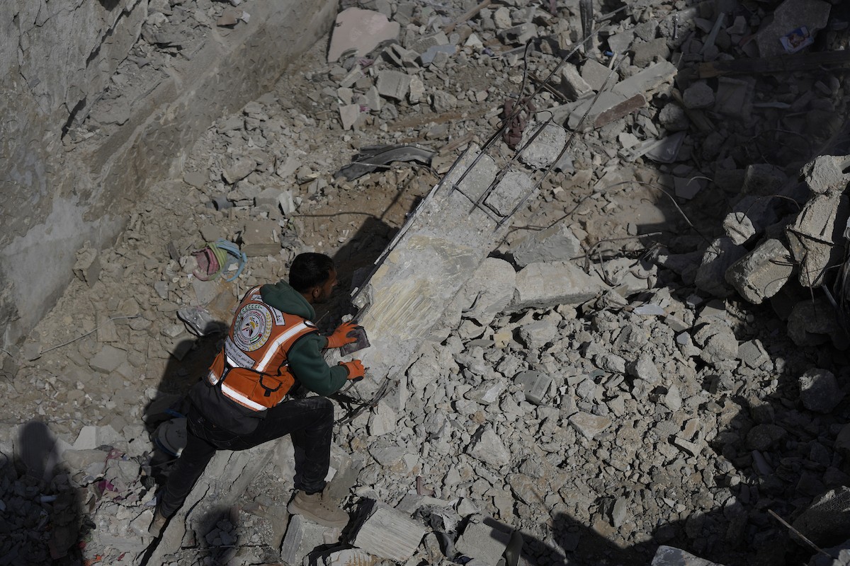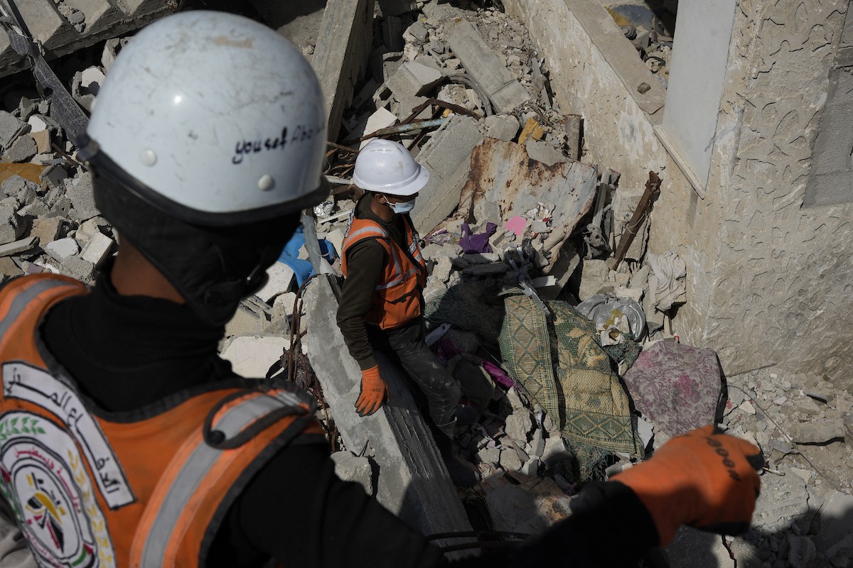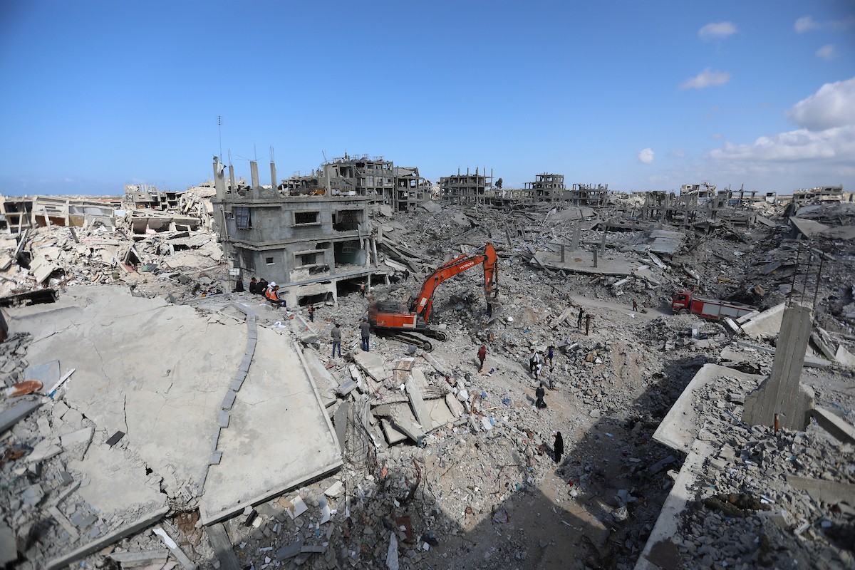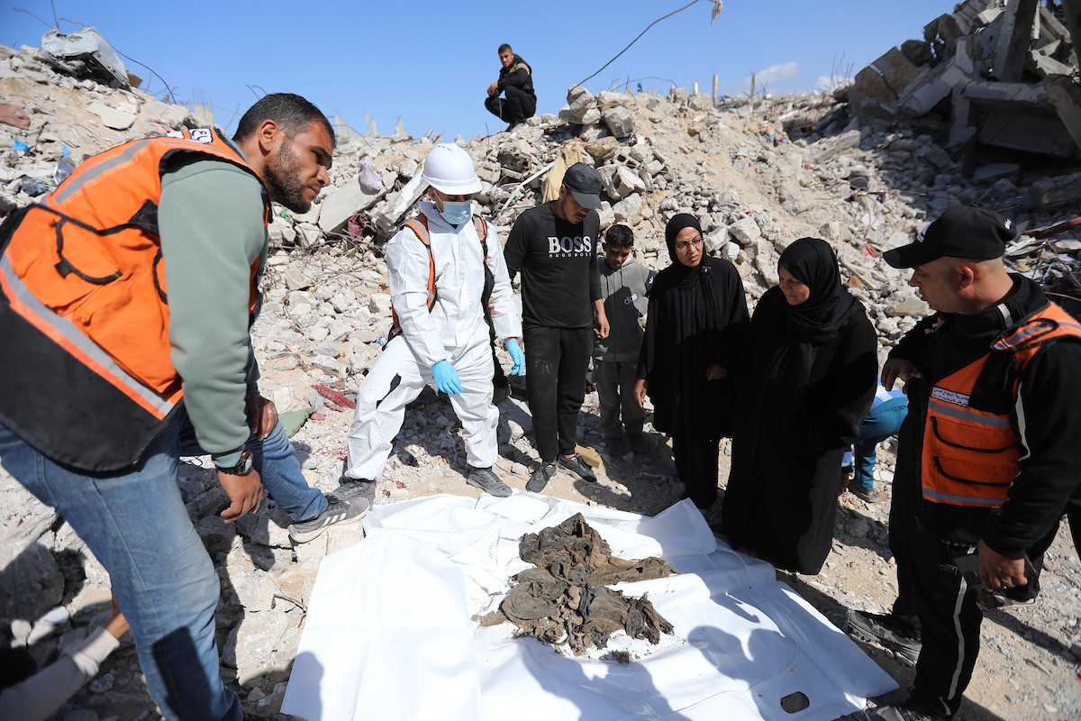 تحاول فرق الدفاع المدني الفلسطيني، بالتنسيق مع اللجنة الدولية للصليب الأحمر، انتشال جثث عائلتي عيادة وغنيم من تحت أنقاض منزل عائلة غباين، في بيت لاهيا، شمال قطاع غزة. 22 فبراير/شباط 2026. صورة: عمر أشتوي
