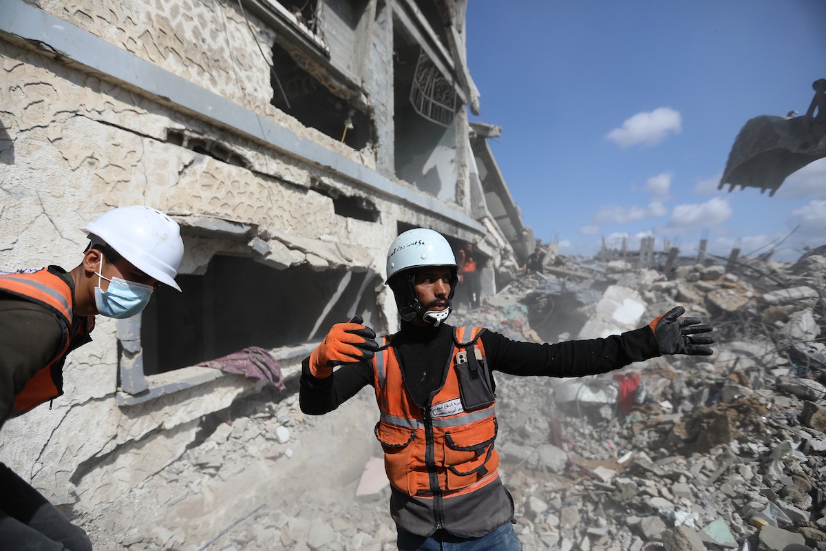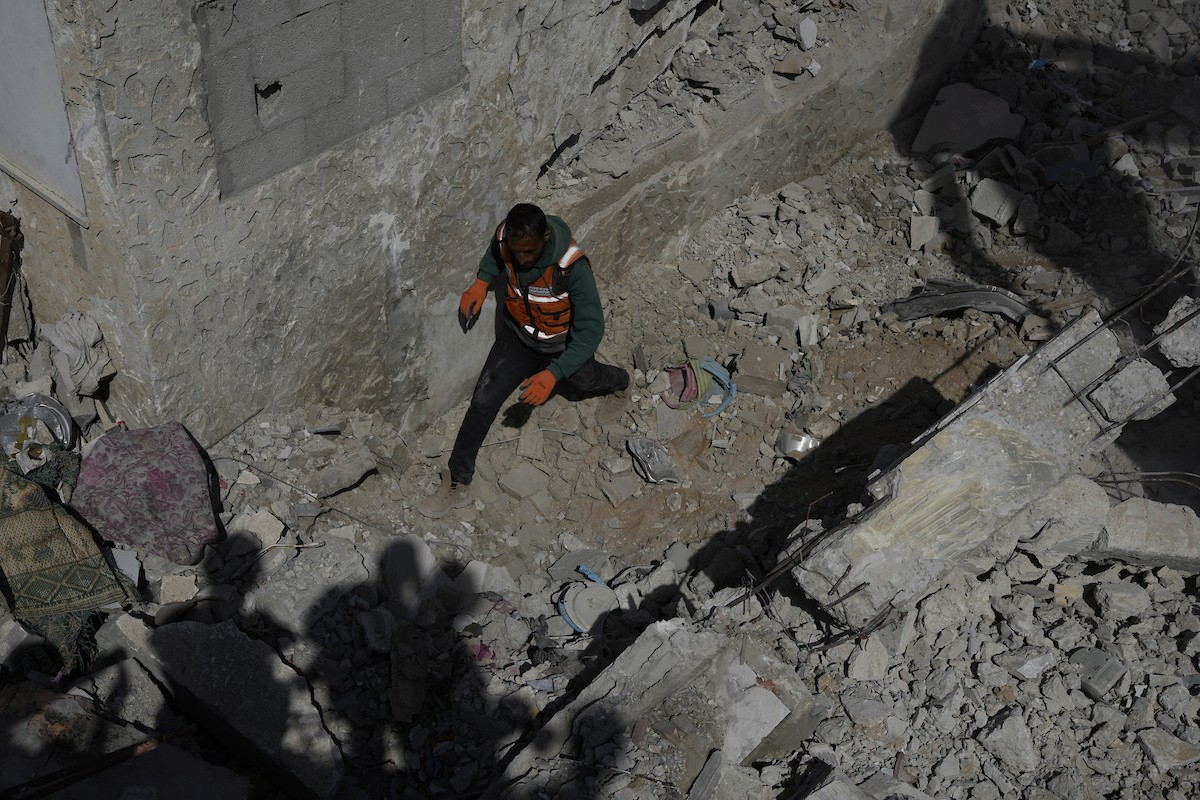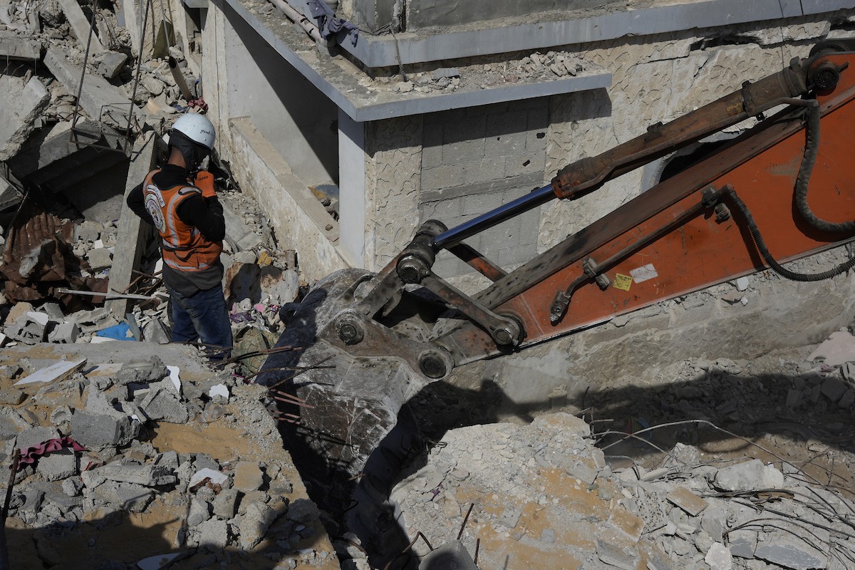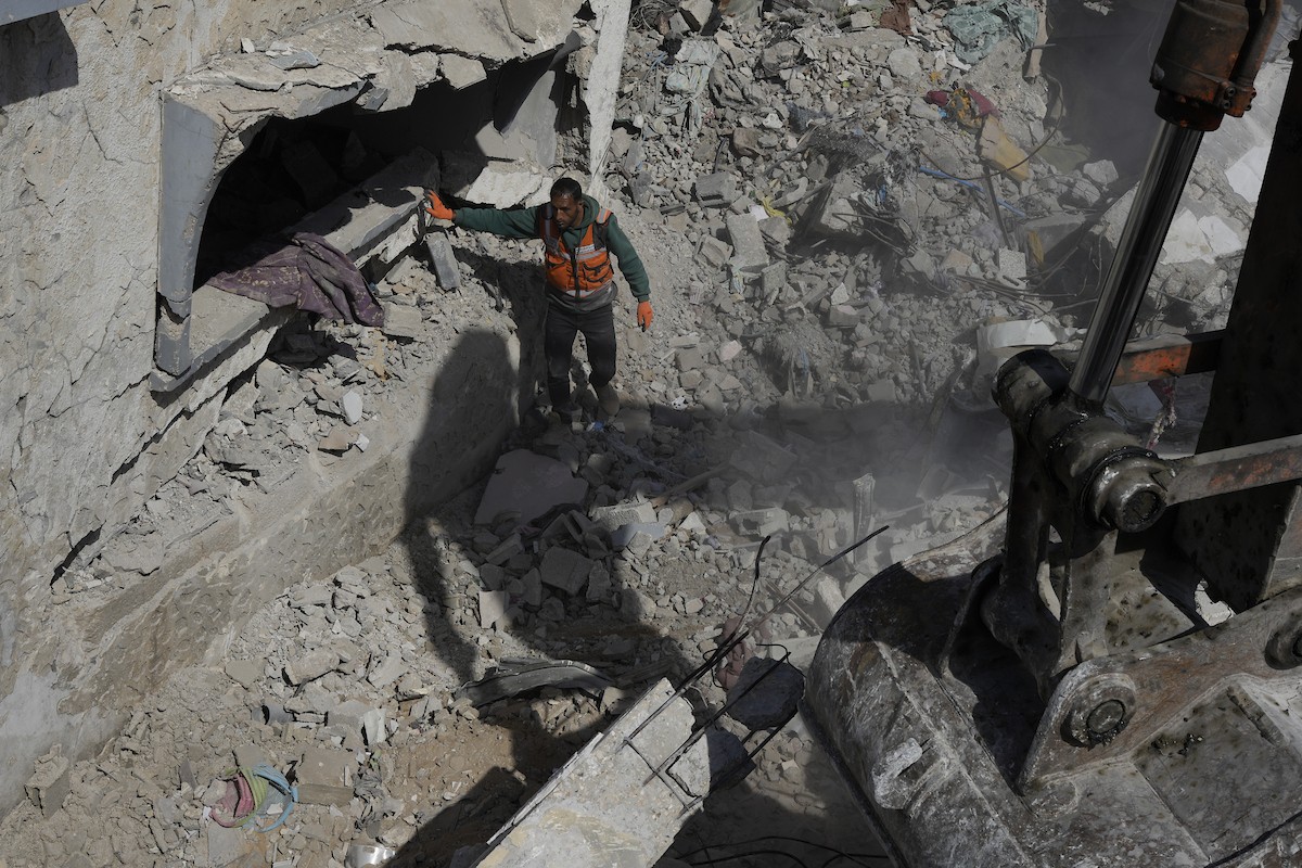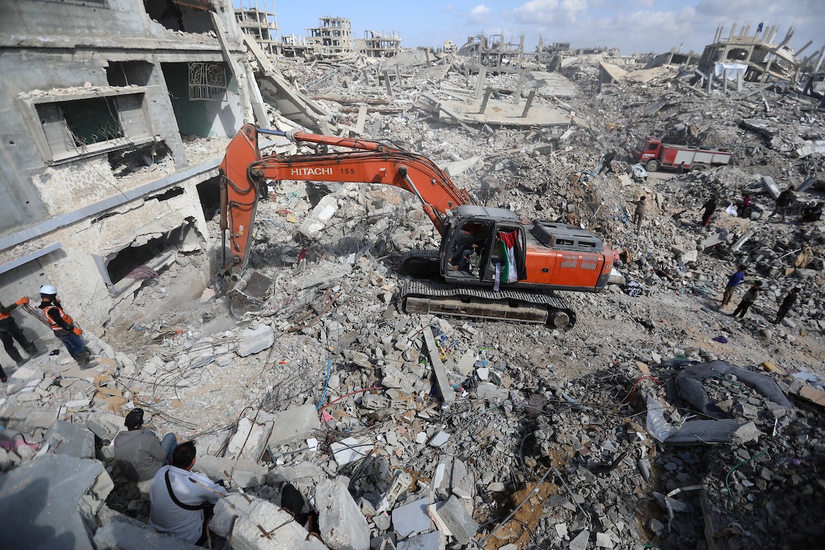 تحاول فرق الدفاع المدني الفلسطيني، بالتنسيق مع اللجنة الدولية للصليب الأحمر، انتشال جثث عائلتي عيادة وغنيم من تحت أنقاض منزل عائلة غباين، في بيت لاهيا، شمال قطاع غزة. 22 فبراير/شباط 2026. صورة: عمر أشتوي