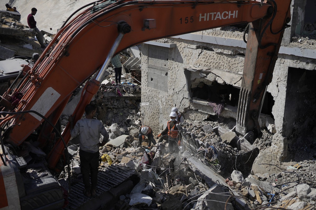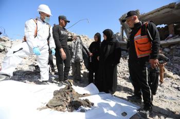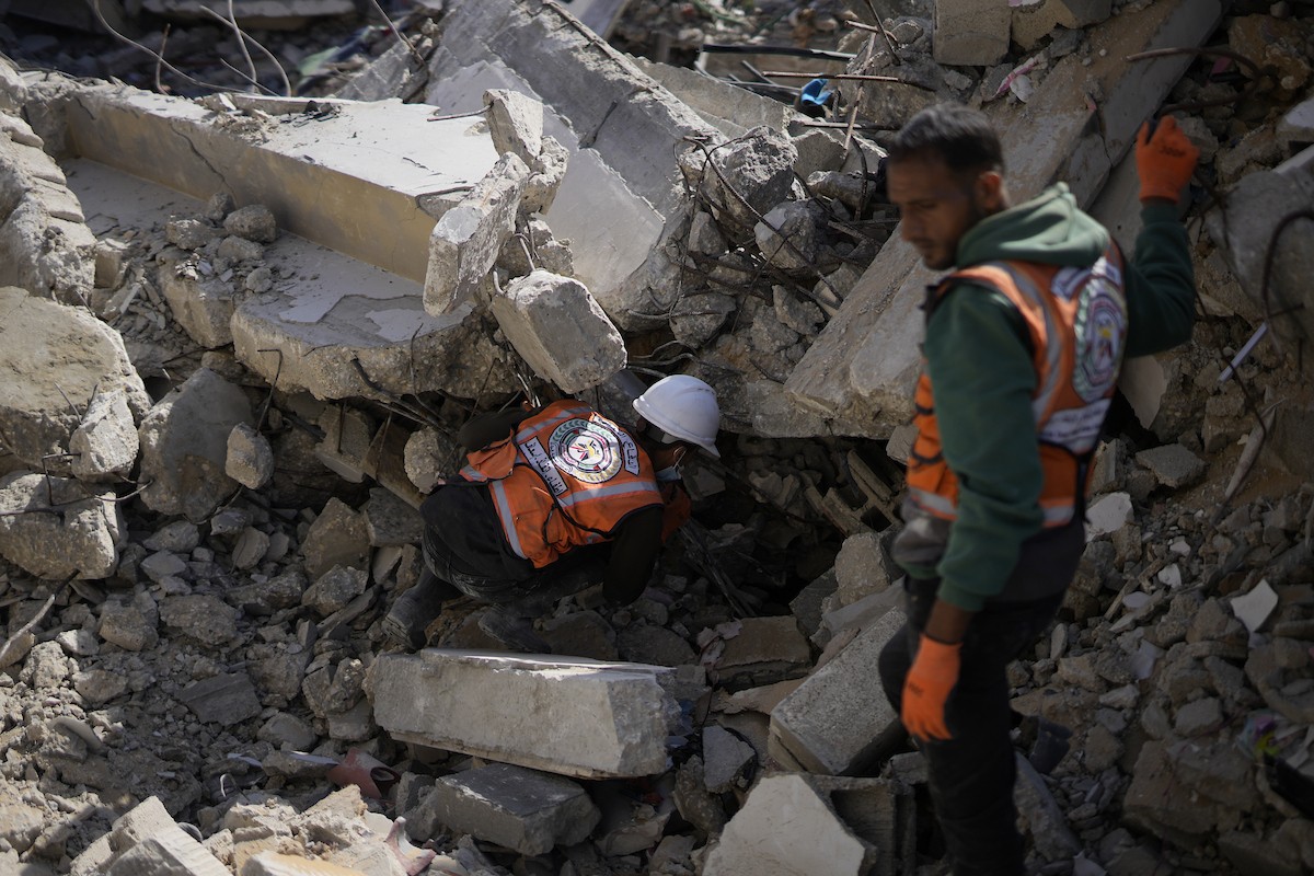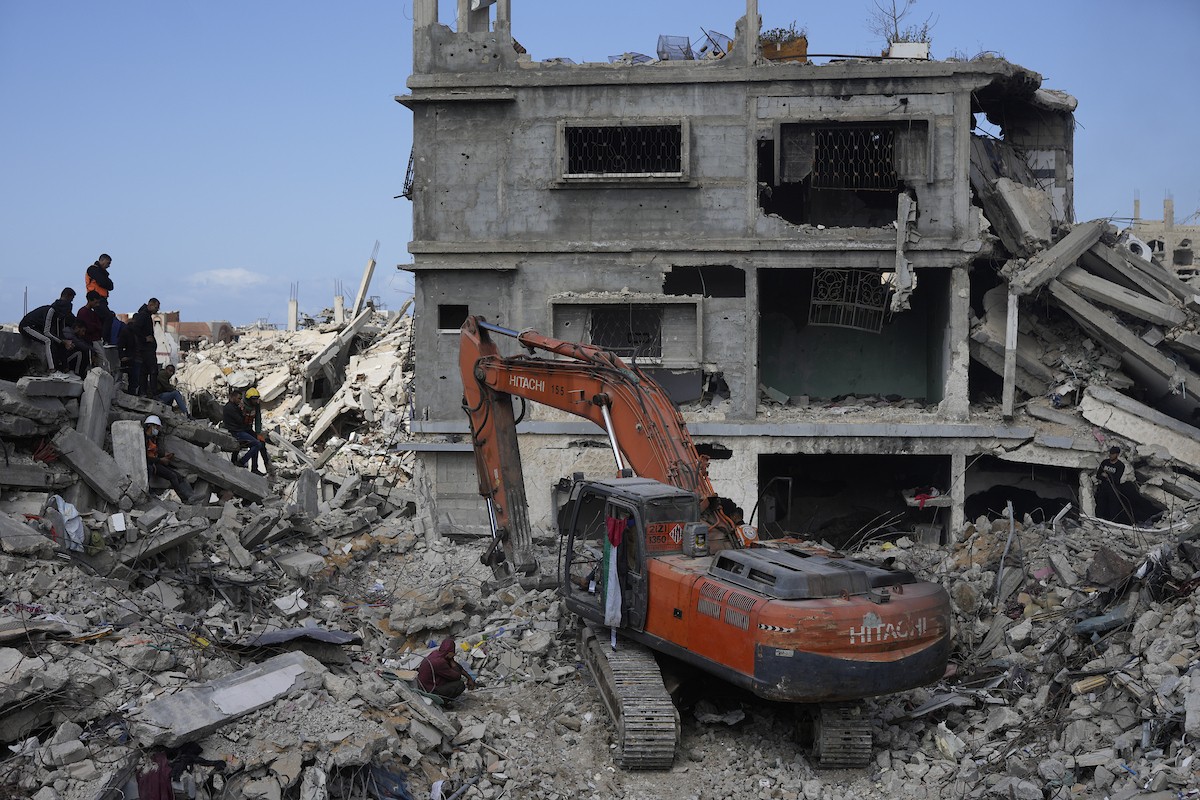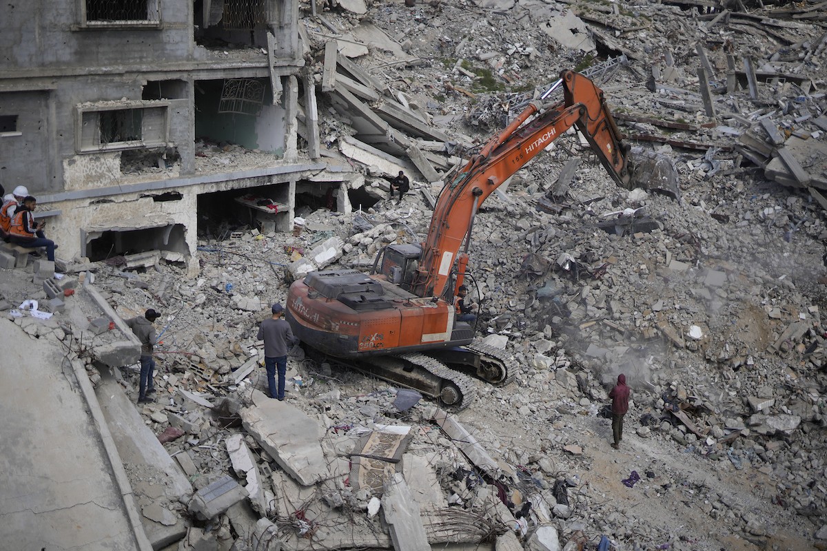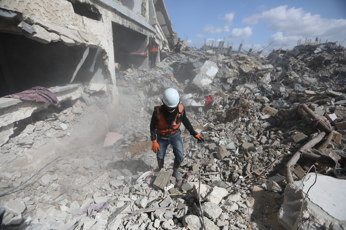 تحاول فرق الدفاع المدني الفلسطيني، بالتنسيق مع اللجنة الدولية للصليب الأحمر، انتشال جثث عائلتي عيادة وغنيم من تحت أنقاض منزل عائلة غباين، في بيت لاهيا، شمال قطاع غزة. 22 فبراير/شباط 2026. صورة: عمر أشتوي