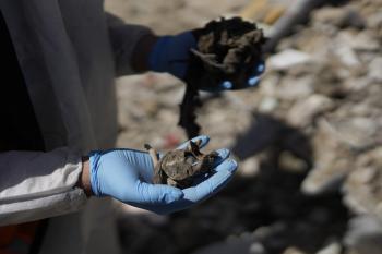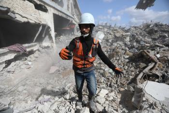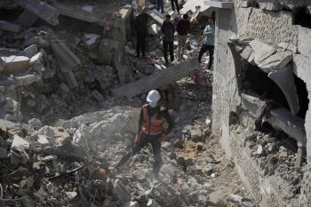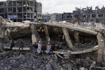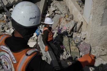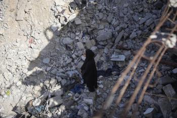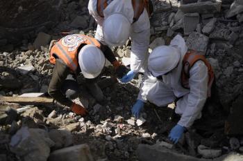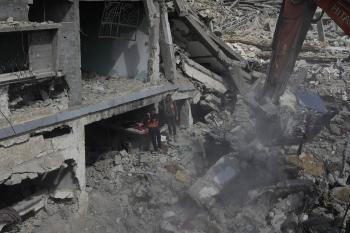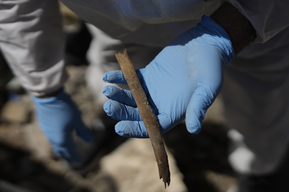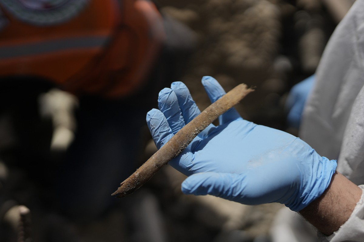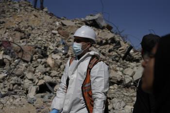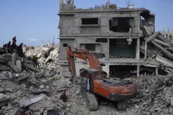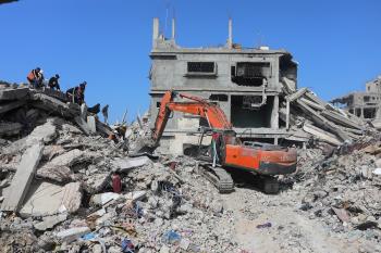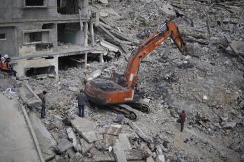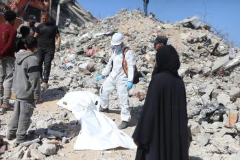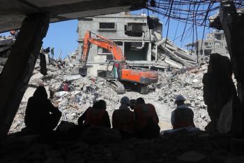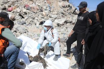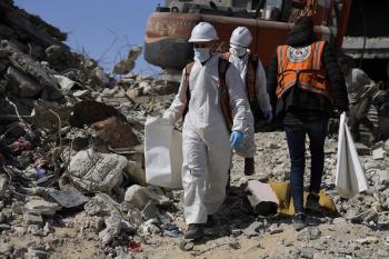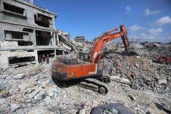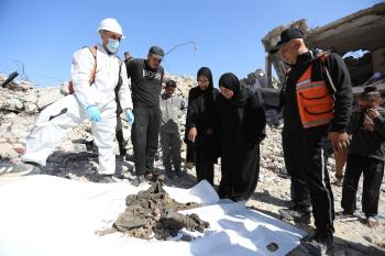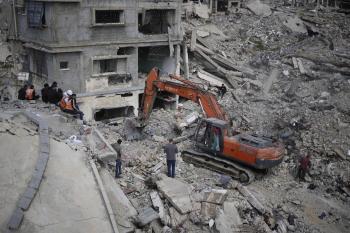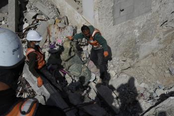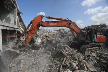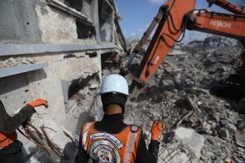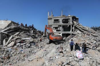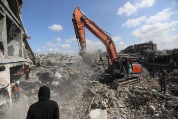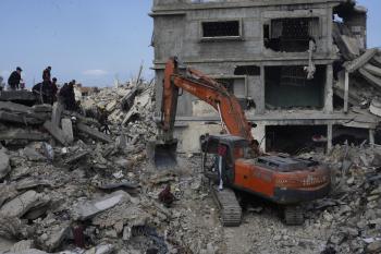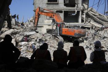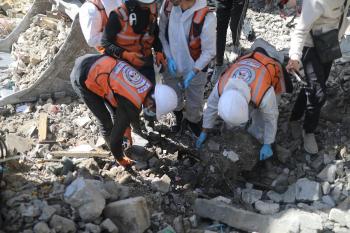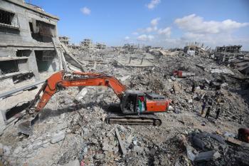 تحاول فرق الدفاع المدني الفلسطيني، بالتنسيق مع اللجنة الدولية للصليب الأحمر، انتشال جثث عائلتي عيادة وغنيم من تحت أنقاض منزل عائلة غباين، في بيت لاهيا، شمال قطاع غزة. 22 فبراير/شباط 2026. صورة: عمر أشتوي