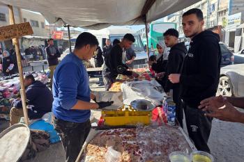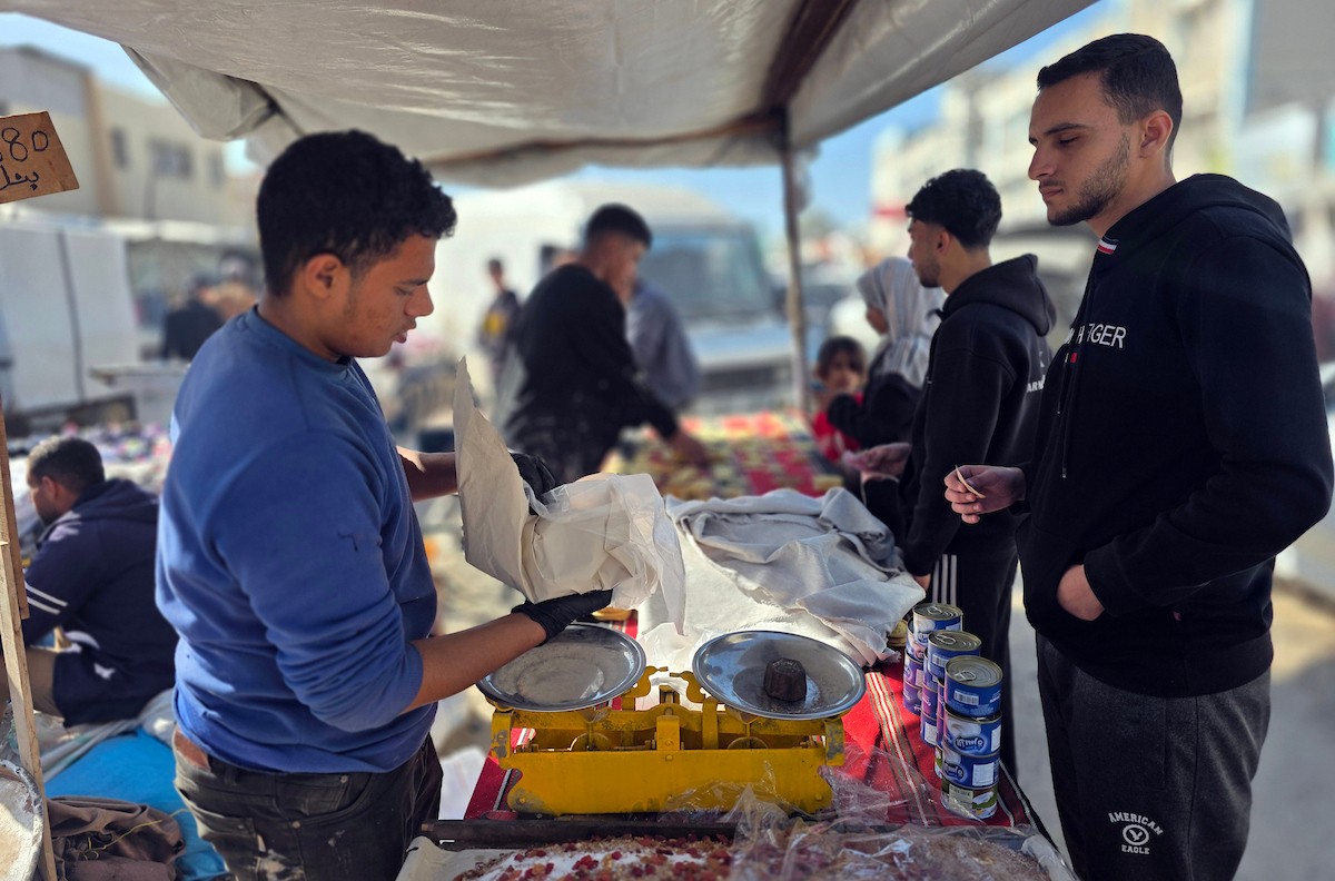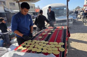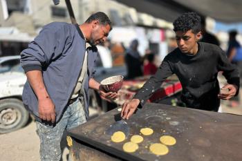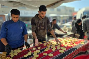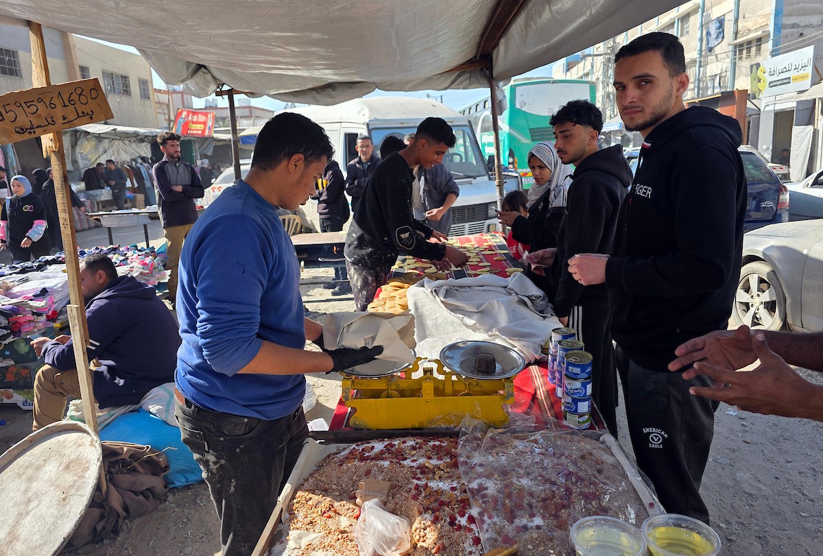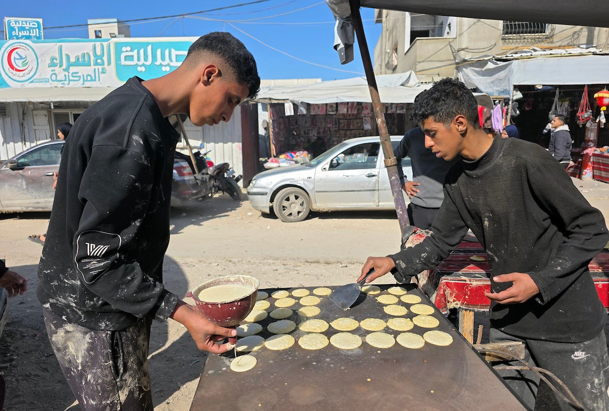 بائعٌ يُعدّ حلوى القطايف الشهيرة بالطرق التقليدية احتفالاً بشهر رمضان المبارك. ورغم الظروف المعيشية الصعبة، يواصل السكان شراء هذه الحلوى التقليدية. خان يونس، جنوب قطاع غزة، ٢٢ فبراير ٢٠٢٦. تصوير: طارق محمد