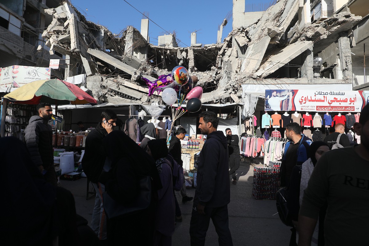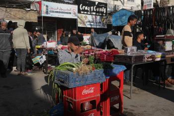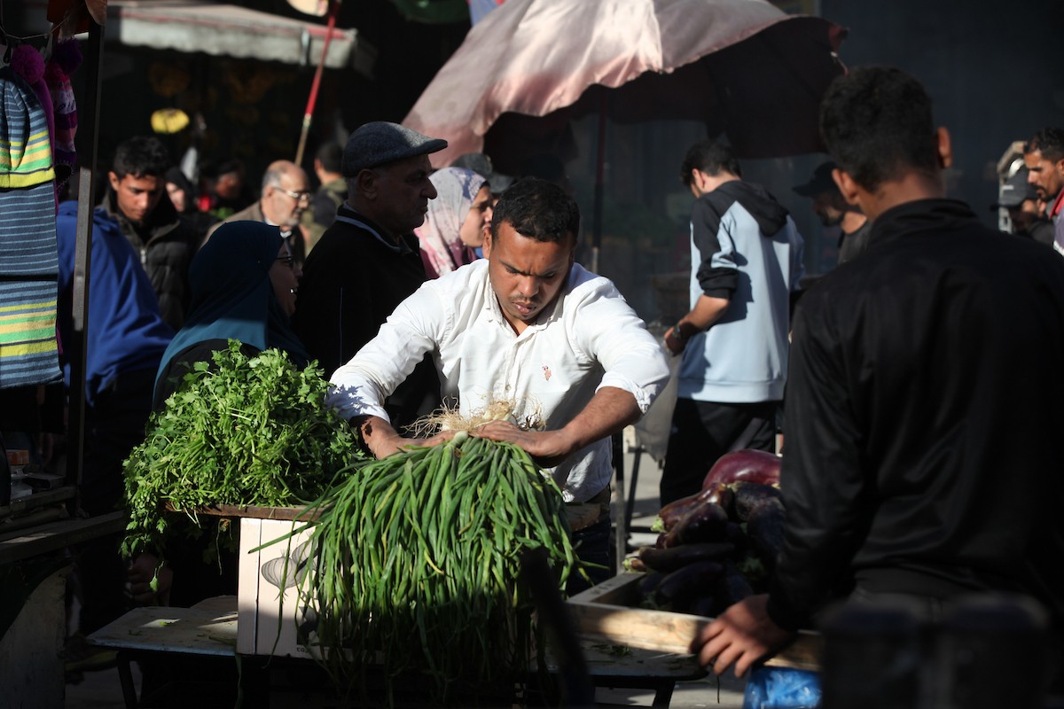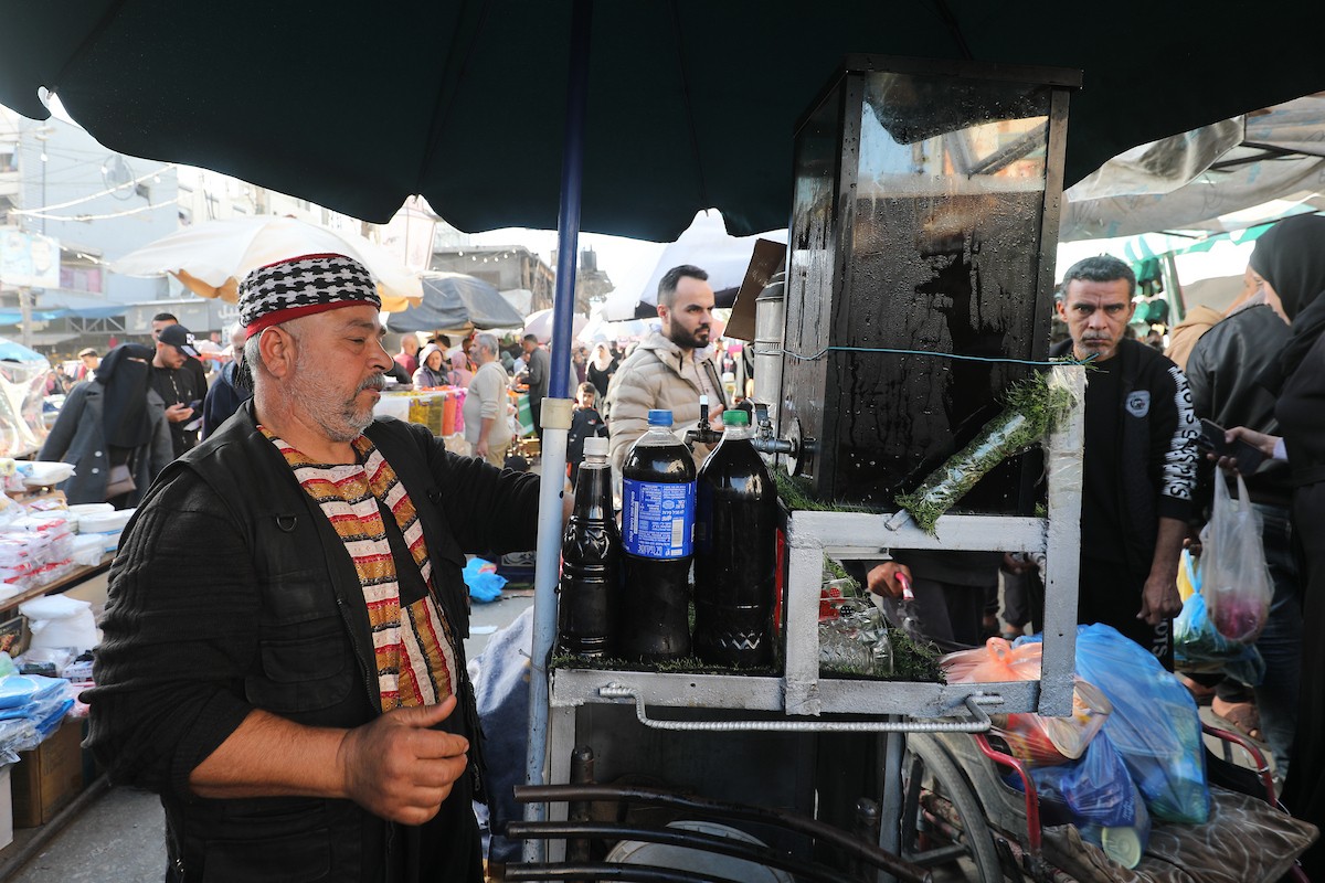 مشهد من الأسواق والبازارات في مخيم النصيرات، وسط قطاع غزة، حيث يستعد المواطنون للإفطار خلال شهر رمضان، في 22 فبراير/شباط 2026. تصوير: معز صالحي