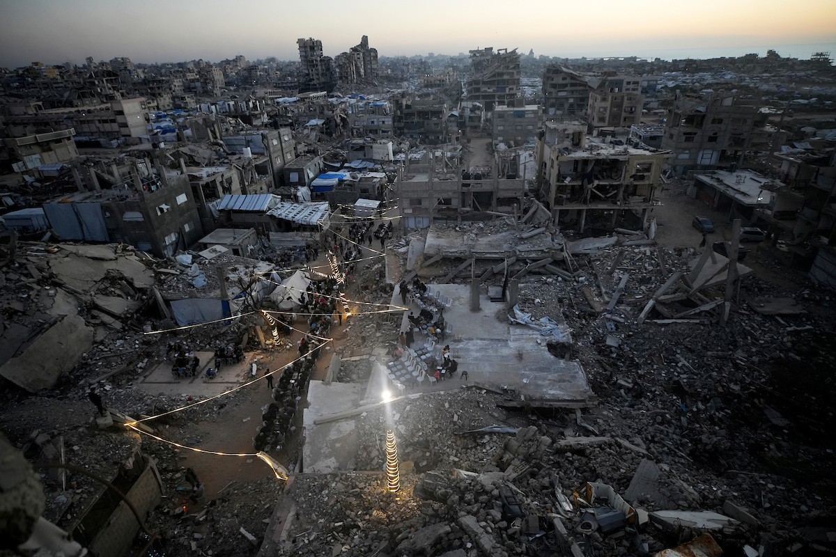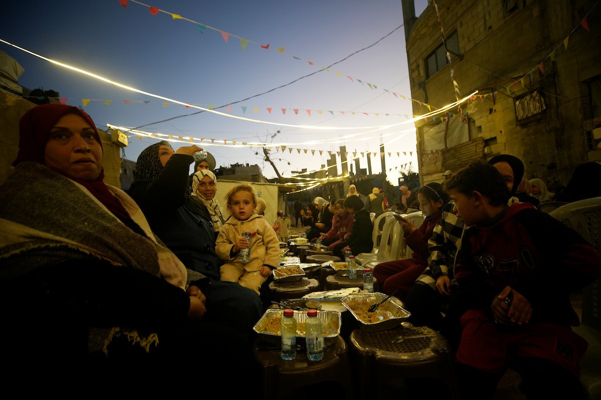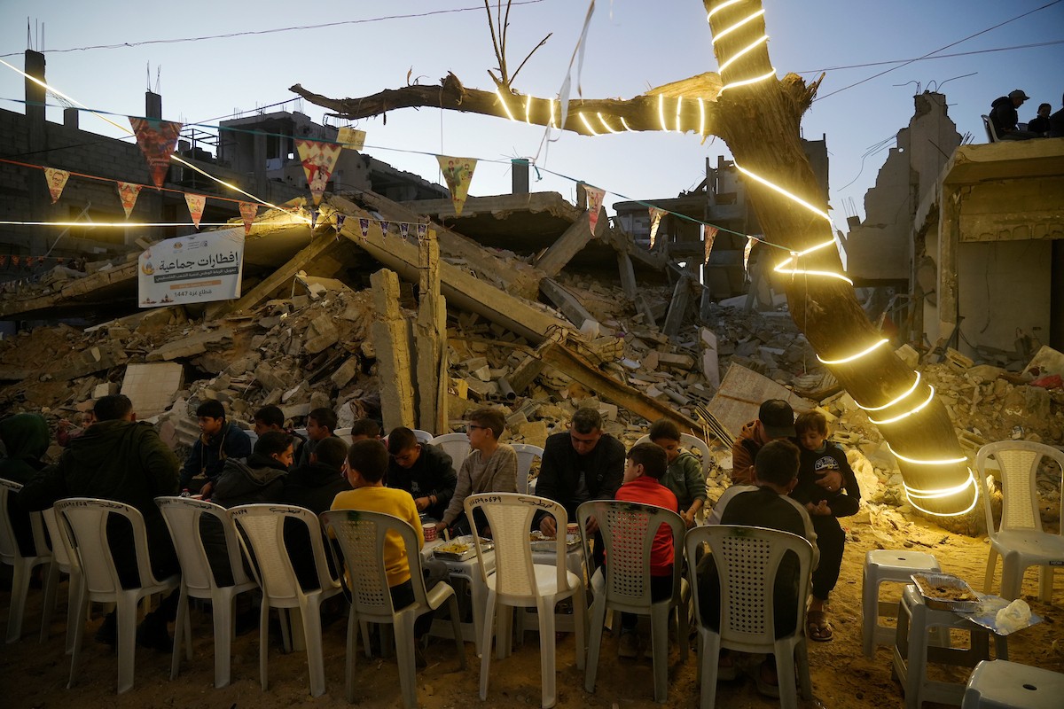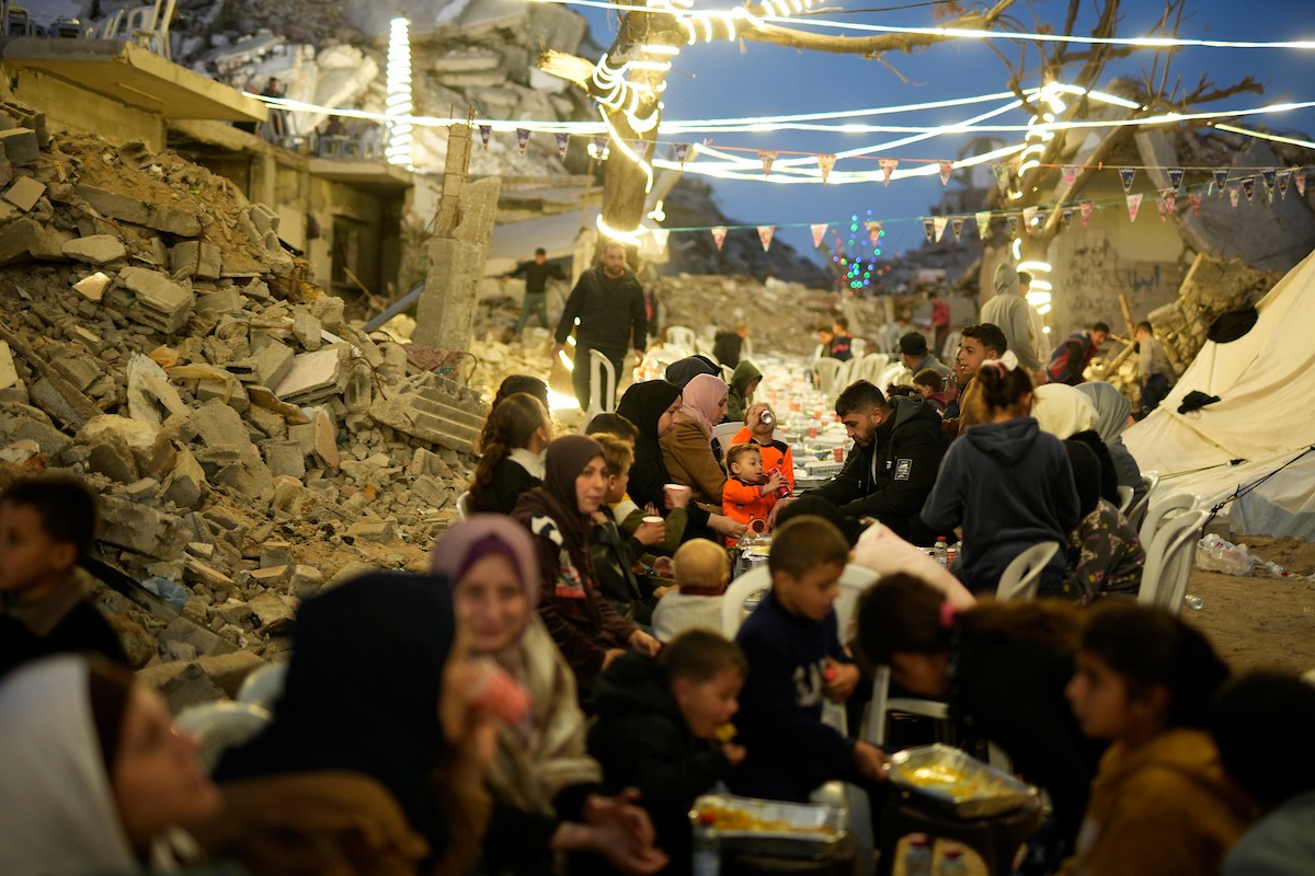 يتجمع الفلسطينيون بين المنازل المدمرة لتناول وجبة الإفطار معًا خلال شهر رمضان المبارك في شمال قطاع غزة، 22 فبراير/شباط 2026. صورة: عمر أشتوي
