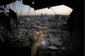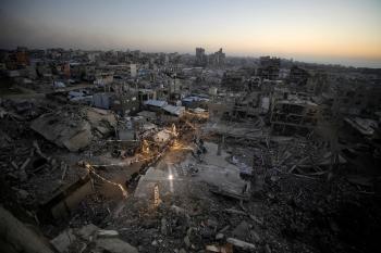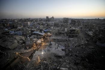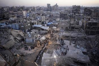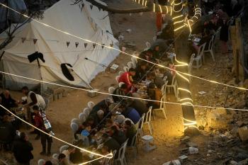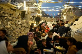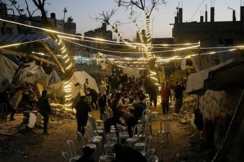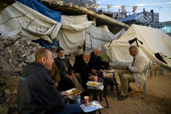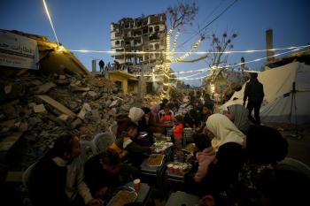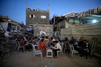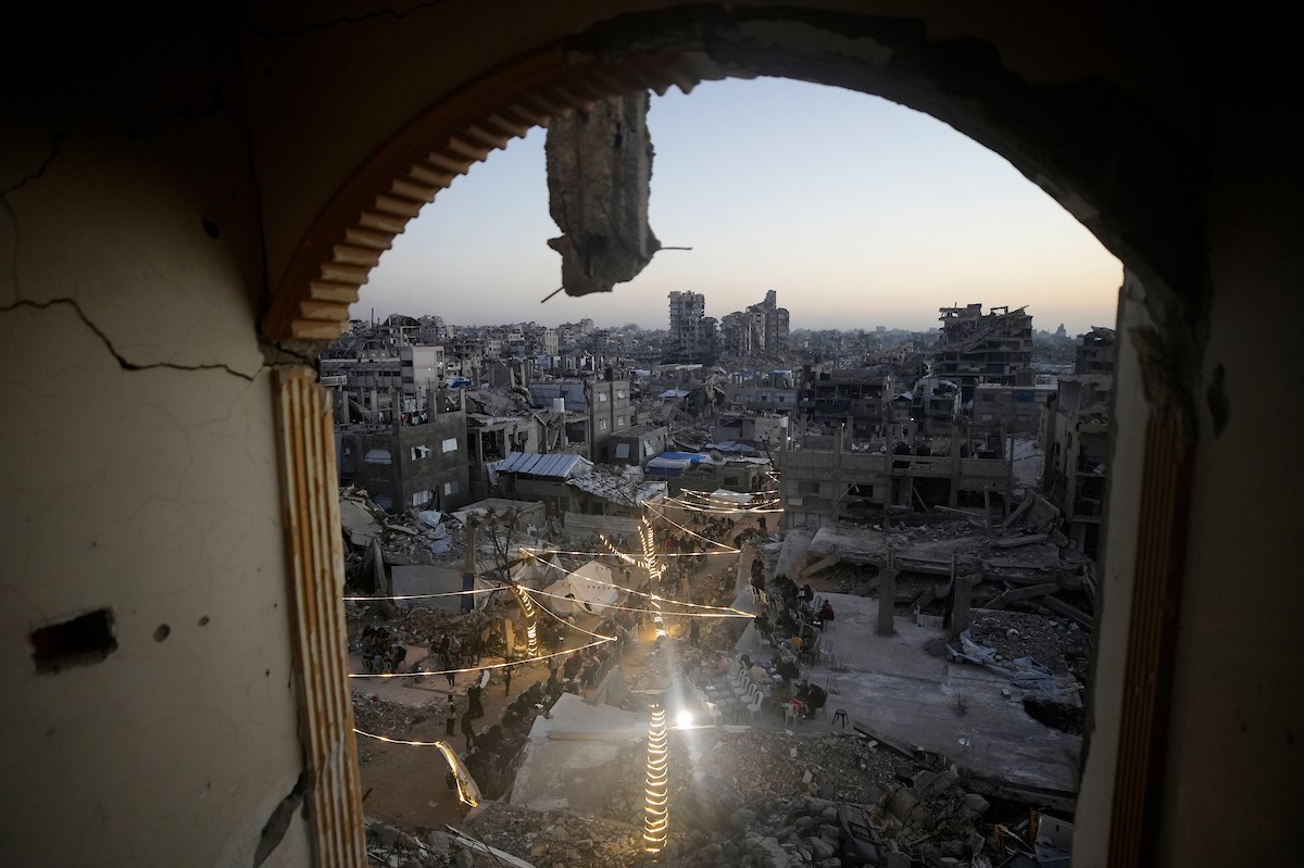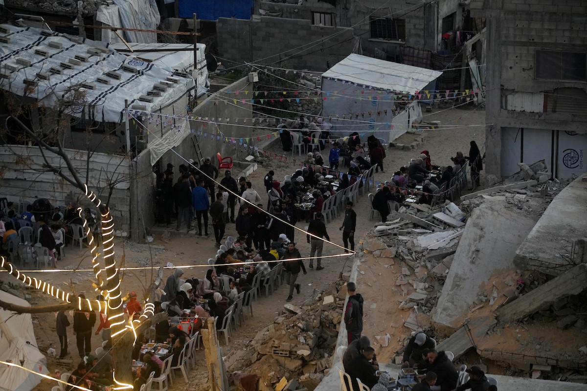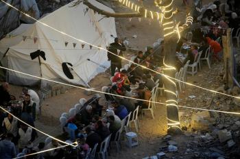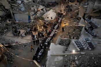 يتجمع الفلسطينيون بين المنازل المدمرة لتناول وجبة الإفطار معًا خلال شهر رمضان المبارك في شمال قطاع غزة، 22 فبراير/شباط 2026. صورة: عمر أشتوي