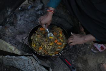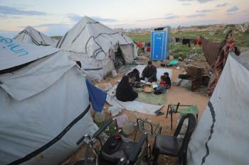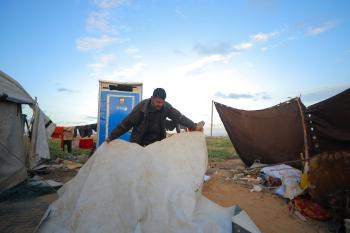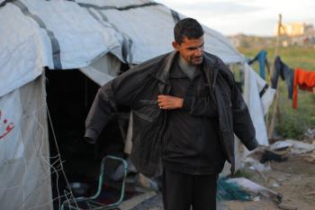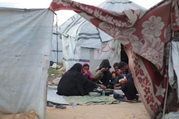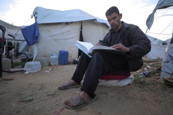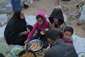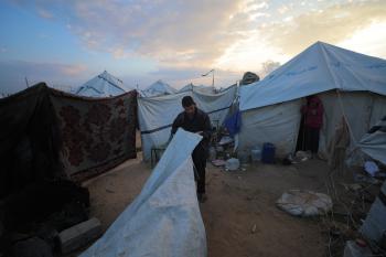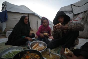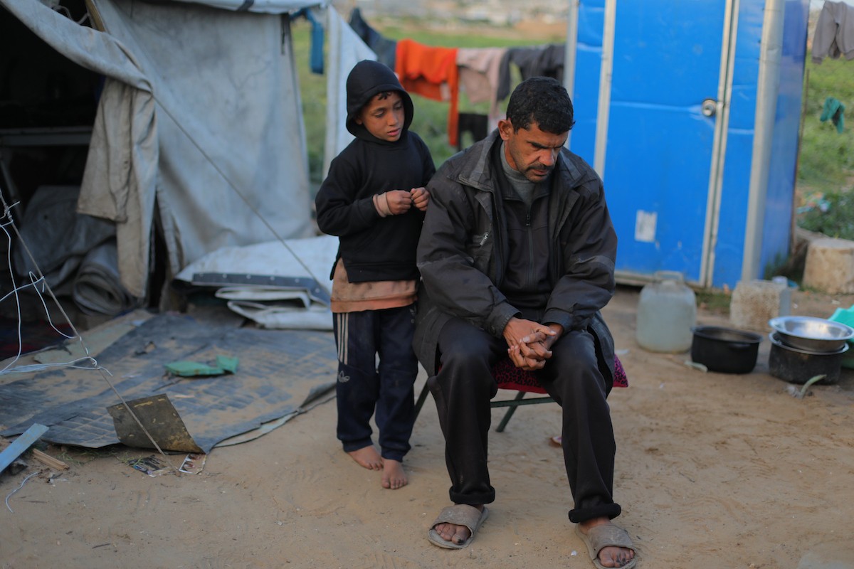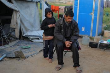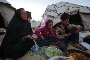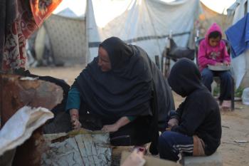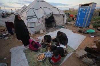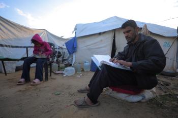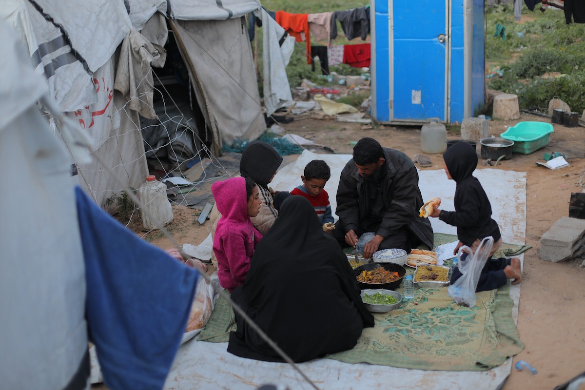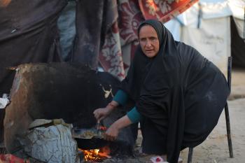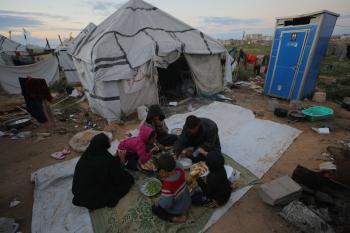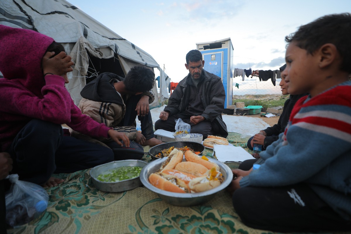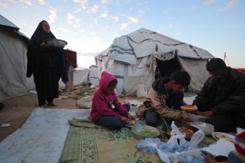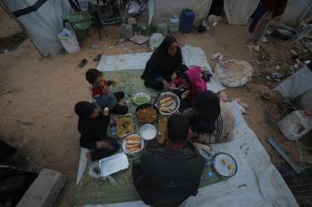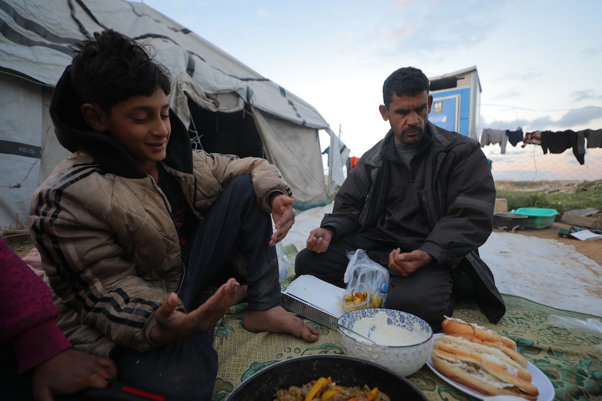 يوسف، 45 عامًا، وزوجته إيمان، 43 عامًا، كلاهما كفيفان، ويكافحان يوميًا لتأمين لقمة العيش، بما في ذلك إعداد وجبتي الإفطار والسحور، وسط الحرب والنزوح المستمرين. وسط قطاع غزة (صورة: apaimages)