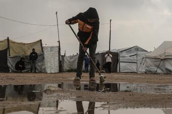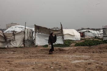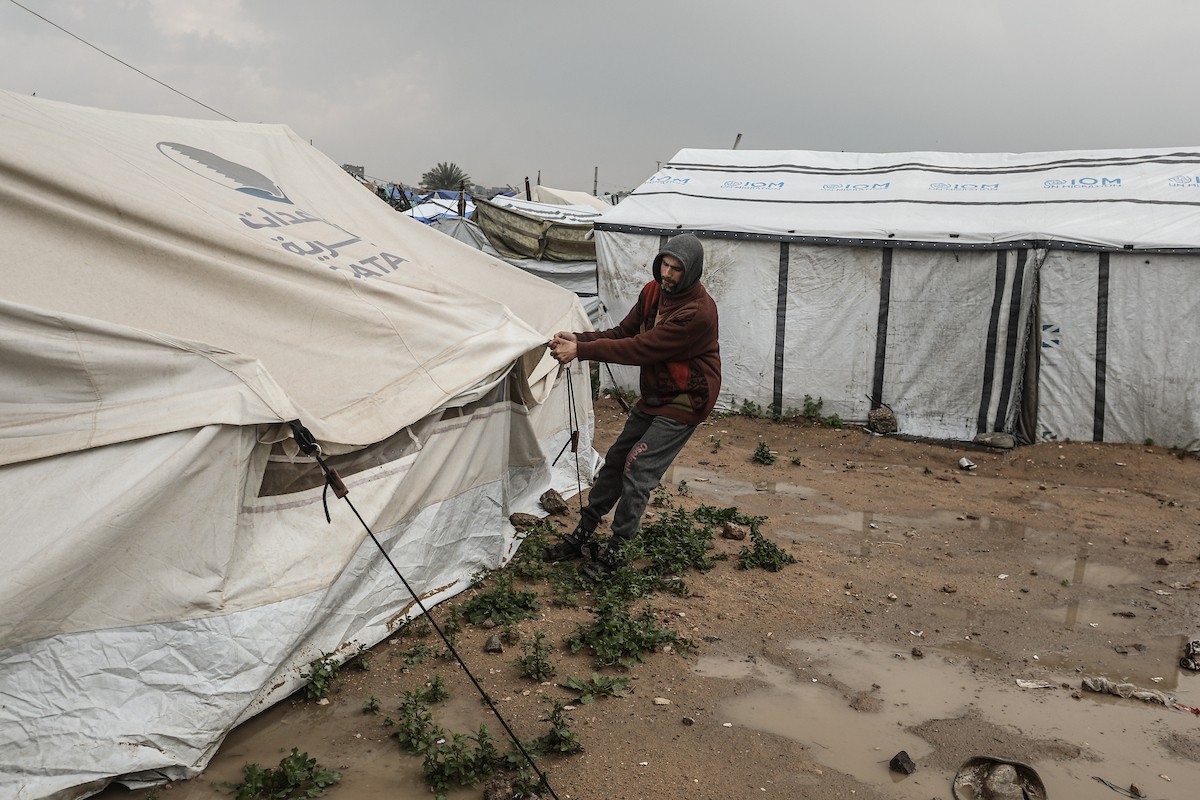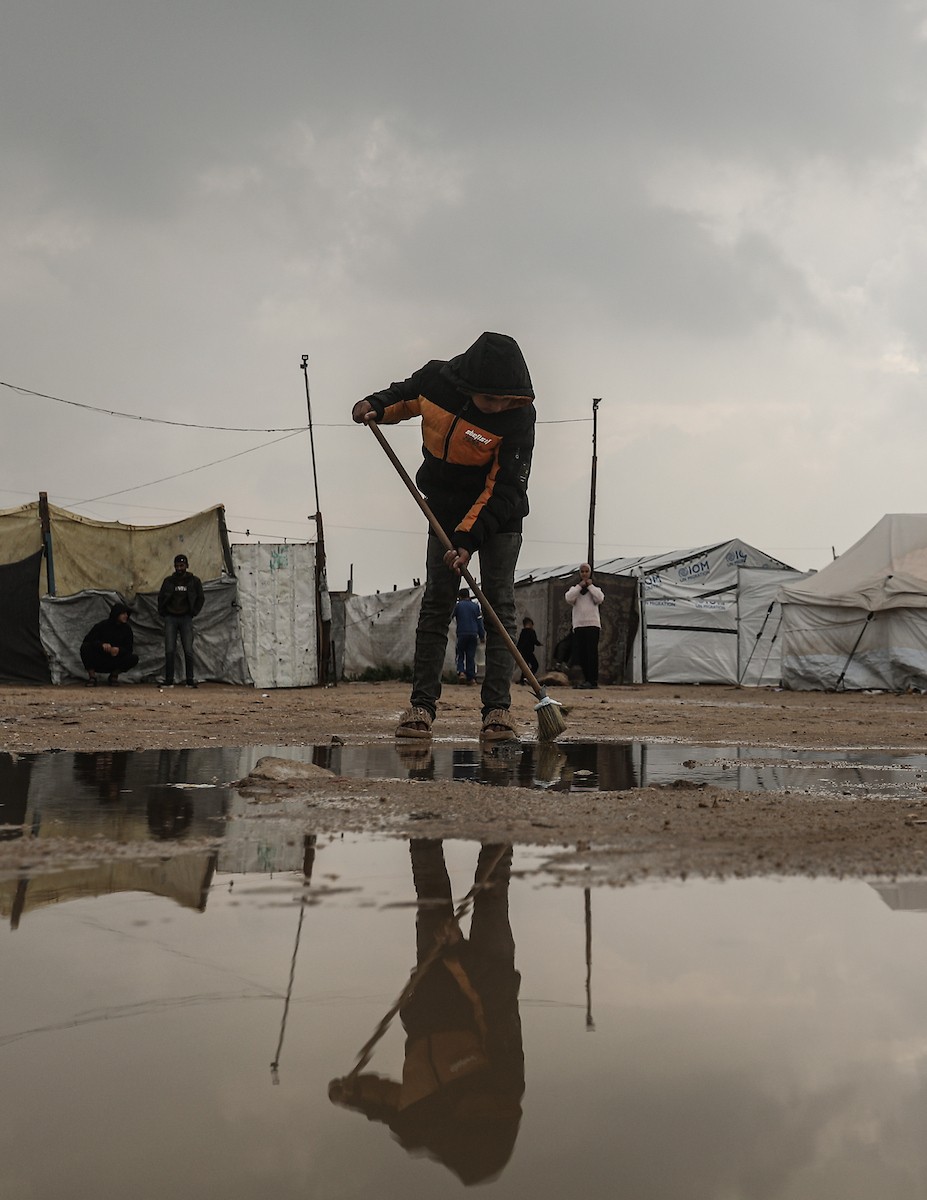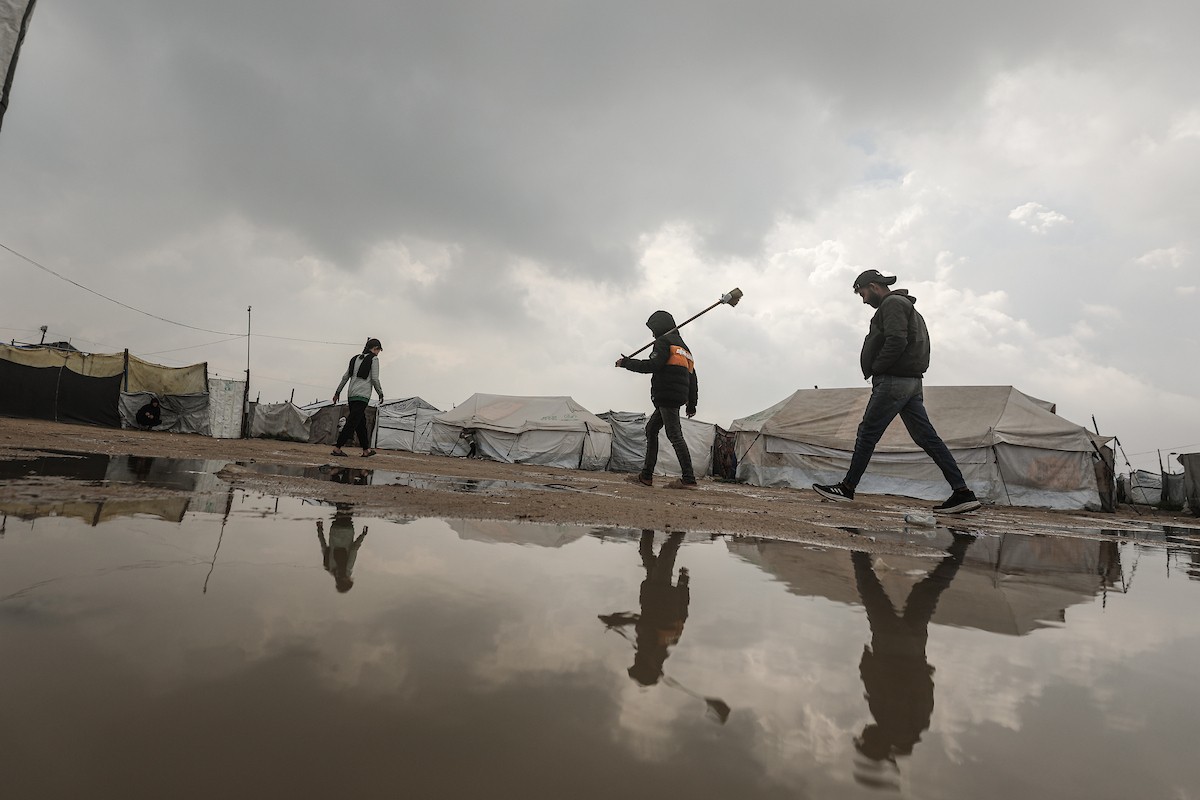 يواجه اللاجئون الفلسطينيون ظروفاً قاسية بعد أن غمرت الأمطار الغزيرة خيامهم في مخيم البريج بوسط قطاع غزة في 24 فبراير/شباط 2026. (صورة: معز صالحي)